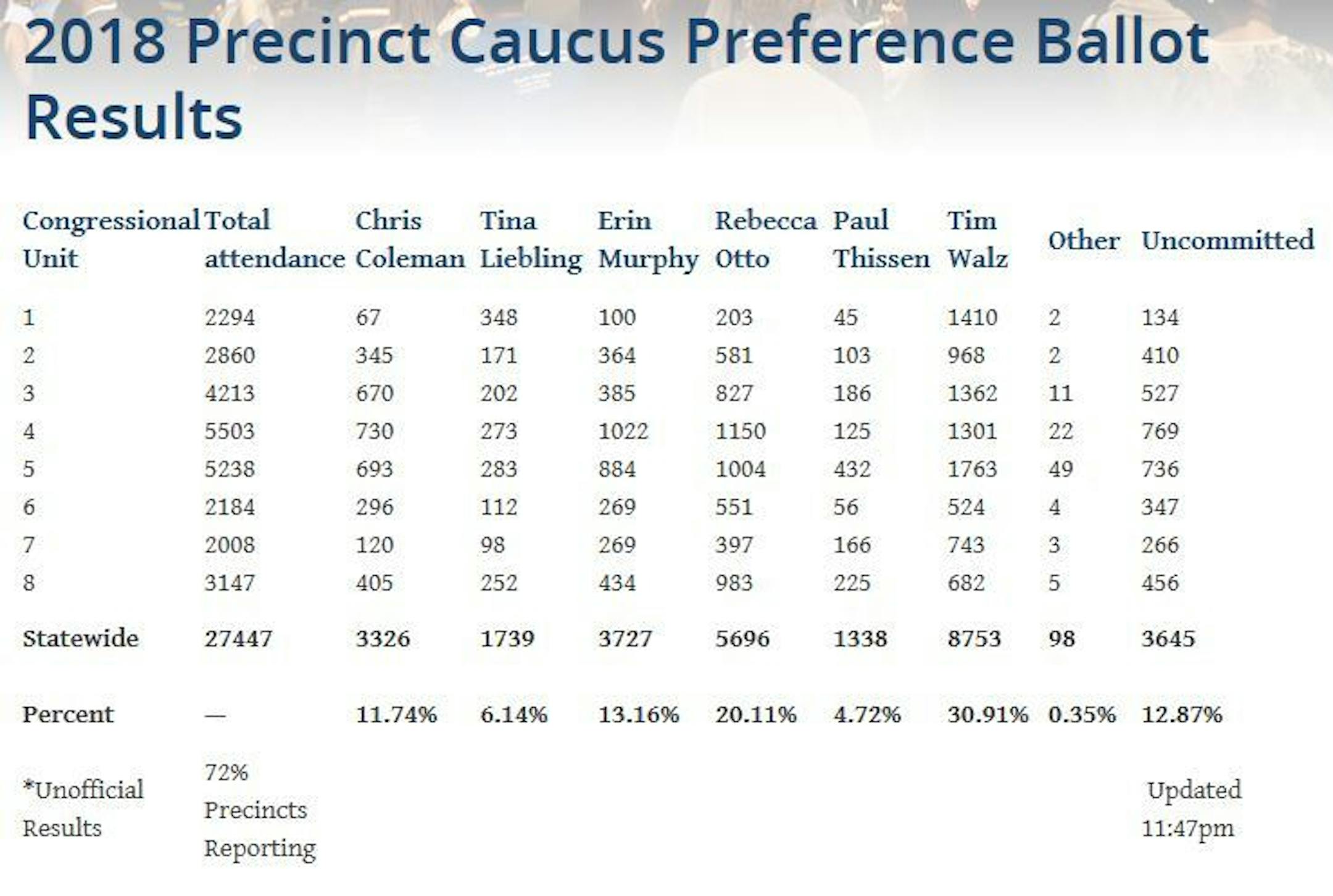 Walz, a U.S. congressman from Mankato, was leading Tuesday night by a commanding margin in the nonbinding straw poll of DFL voters. Johnson, the Hennepin County Commission from Plymouth, was winning the GOP straw poll with an even bigger margin, with more than two out of five Republicans favoring him.
