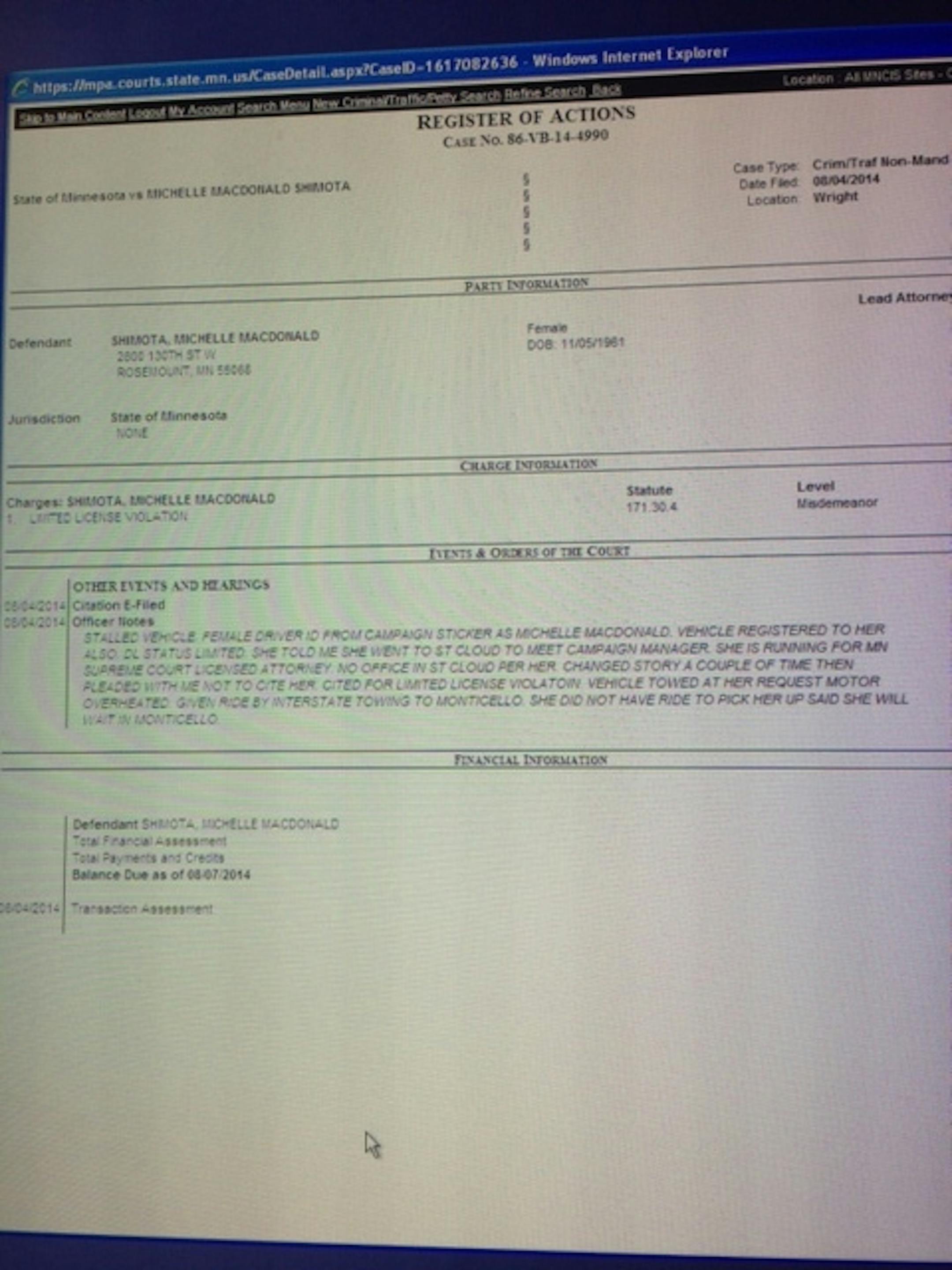 "She is running for MN Supreme Court licensed attorney," the officer notes read. "No office in St. Cloud per her. Changed story a couple of time(s) then pleaded with me not to cite her."