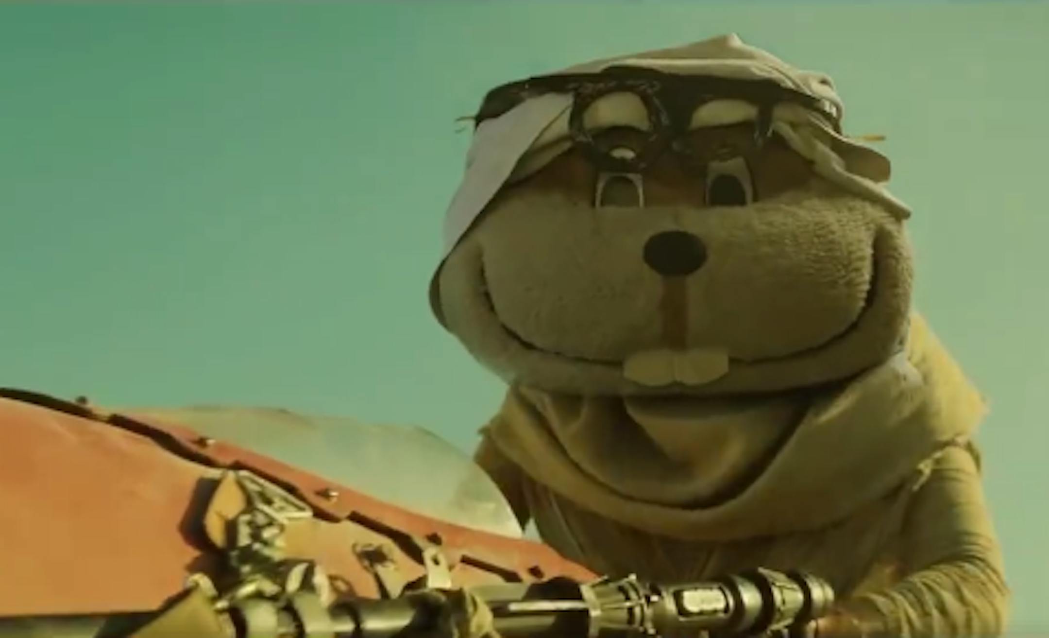 The Gophers Athletics Facebook account posted a video with the caption "#MayThe4thBeWithYou" that stars Goldy in a "Star Wars: The Barnyard Awakens" parody trailer. Goldy glides across the desert on a Landspeeder and fights the dark side with his lightsaber.