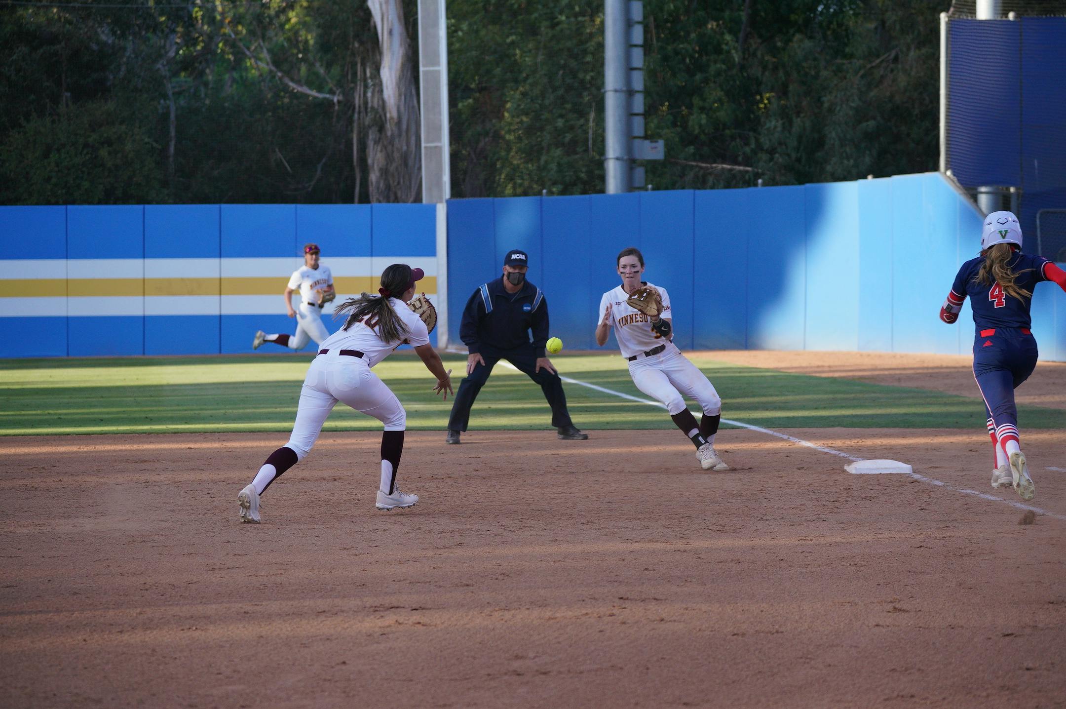 The Gophers softball team lost to Fresno State 3-0 on Friday night in the opening game of its NCAA regional at UCLA. Shuylar Broussard's two-out, bases-loaded single off Amber Fiser made it 2-0 in the top of the sixth inning for the Bulldogs (37-10).