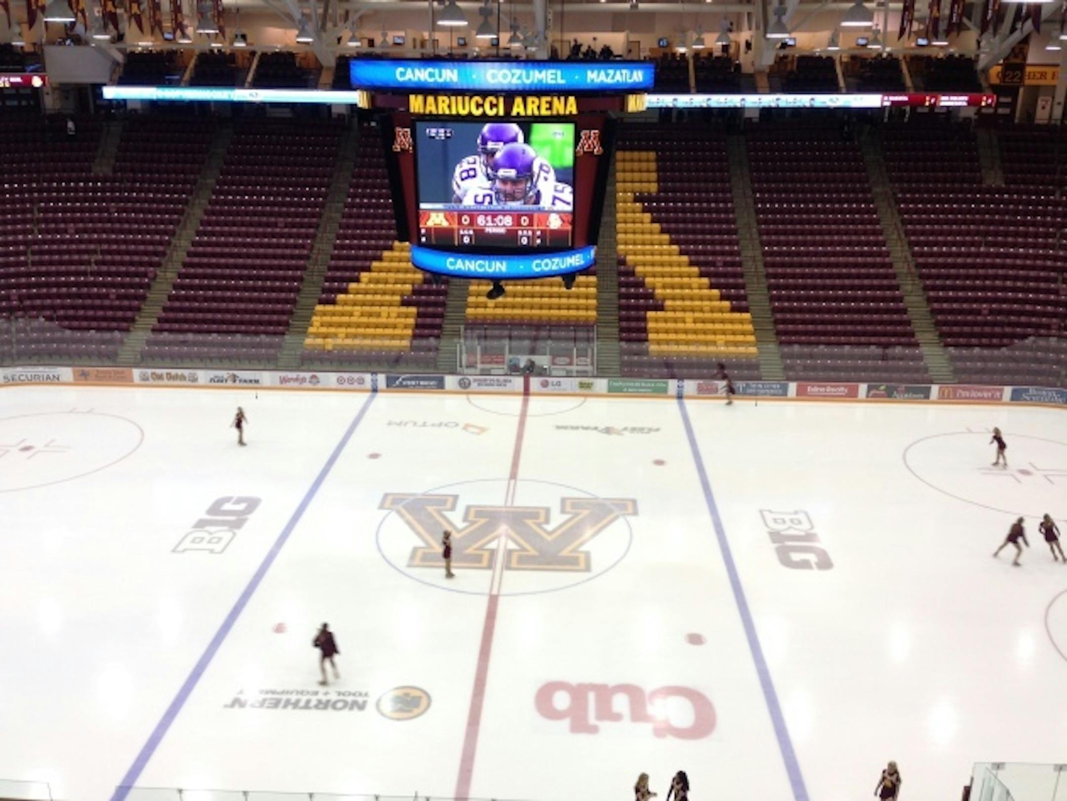 • Mariucci Arena entertained fans before Sunday's game with a Vikings-Packers feed on the jumbotron. Here's a look at the ice cheerleaders warming up while Green Bay mounted its comeback.