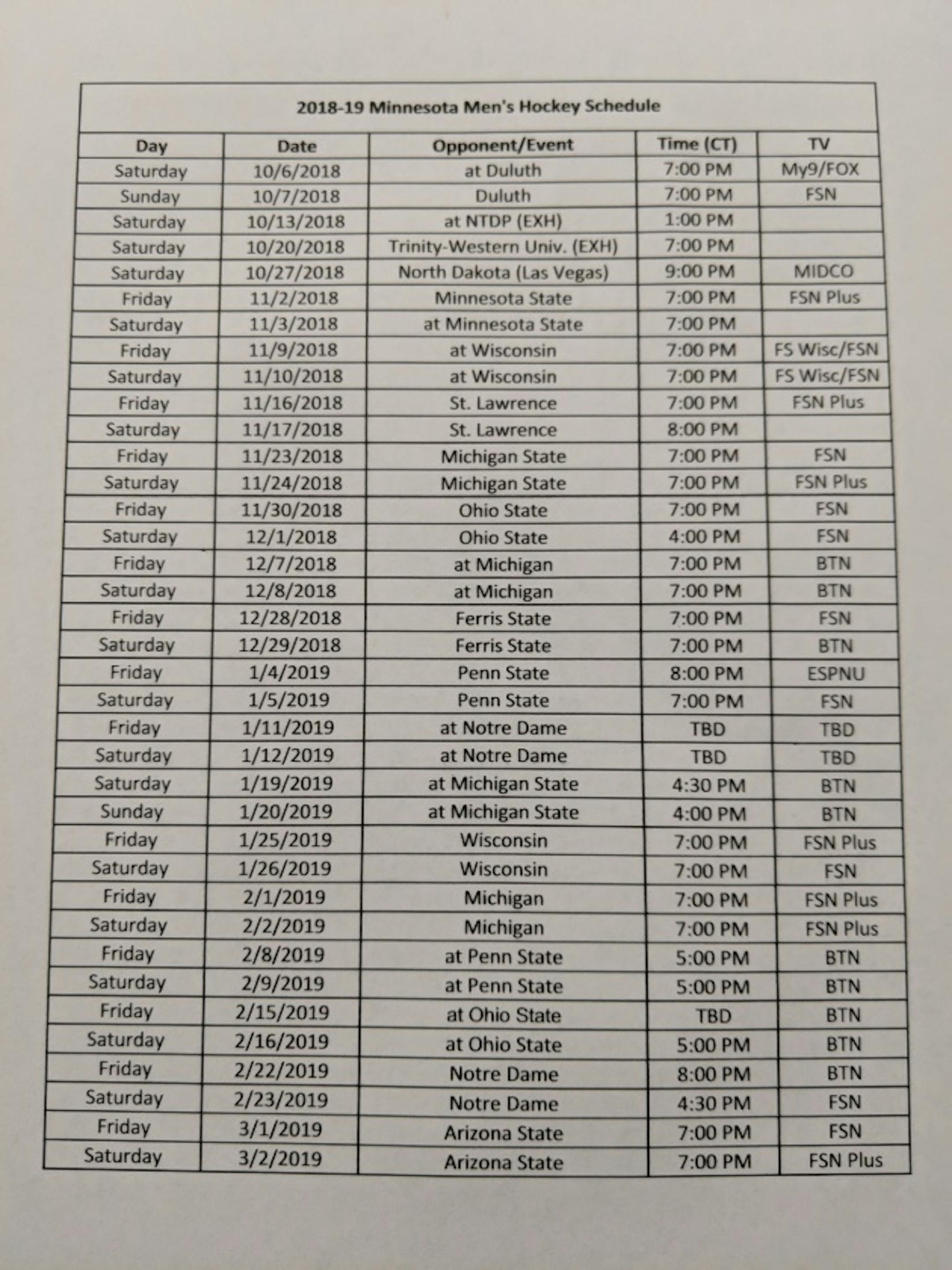 The majority of Gophers games will air on either FSN (11) or FSN Plus (7), while the Big Ten Network will broadcast 10. The Gophers will appear on ESPNU once, FOX9+ once and the Midco Sports Network once. In addition, broadcast info for the Nov. 3 game at Minnesota State Mankato and the Jan. 11-12 series at Notre Dame will be announced later.