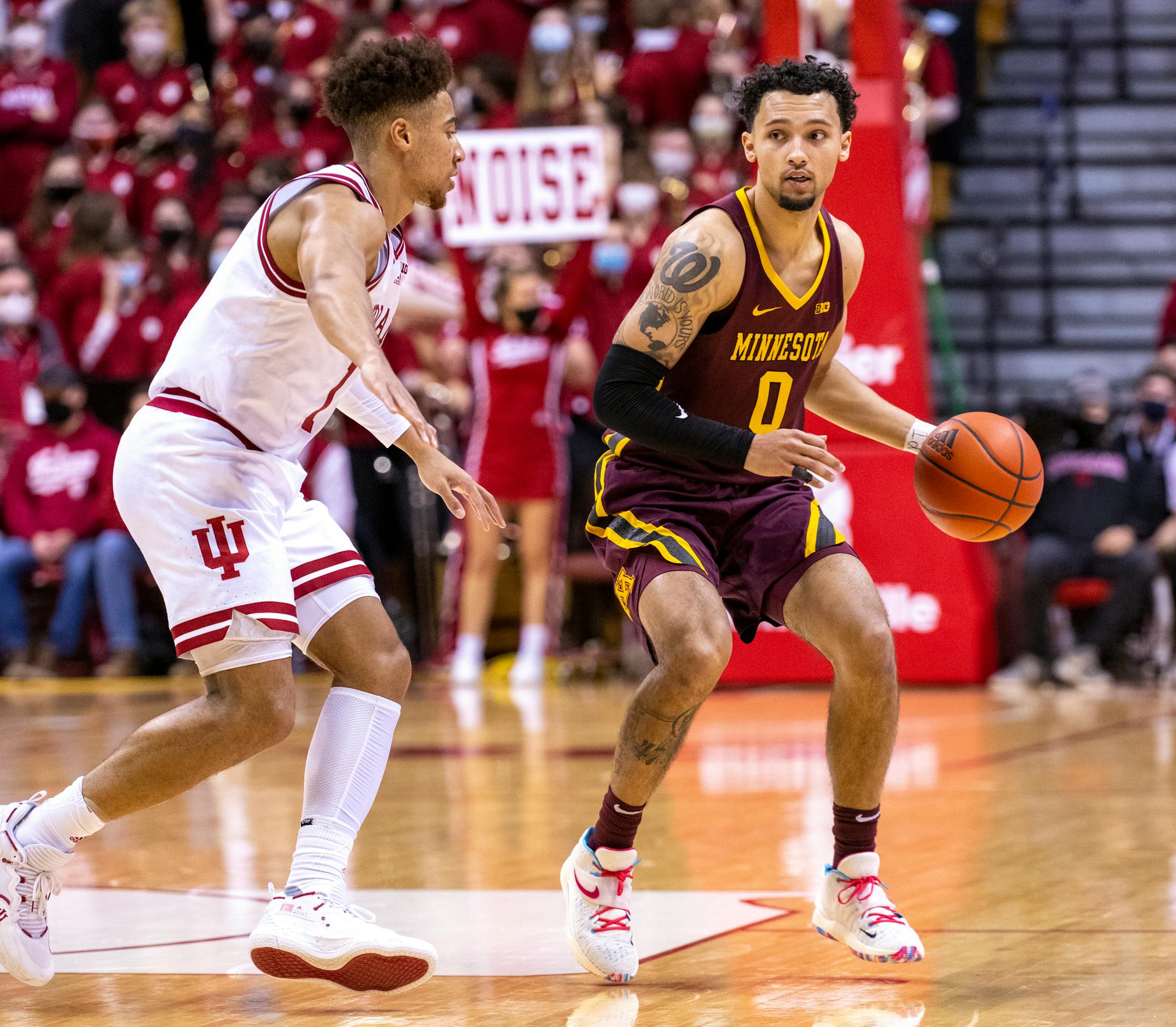 Minnesota guard Payton Willis (0) works the ball around the defense of Indiana guard Rob Phinisee (1) during the first half Sunday. (Doug McSchooler, Associated Press/The Minnesota Star Tribune)