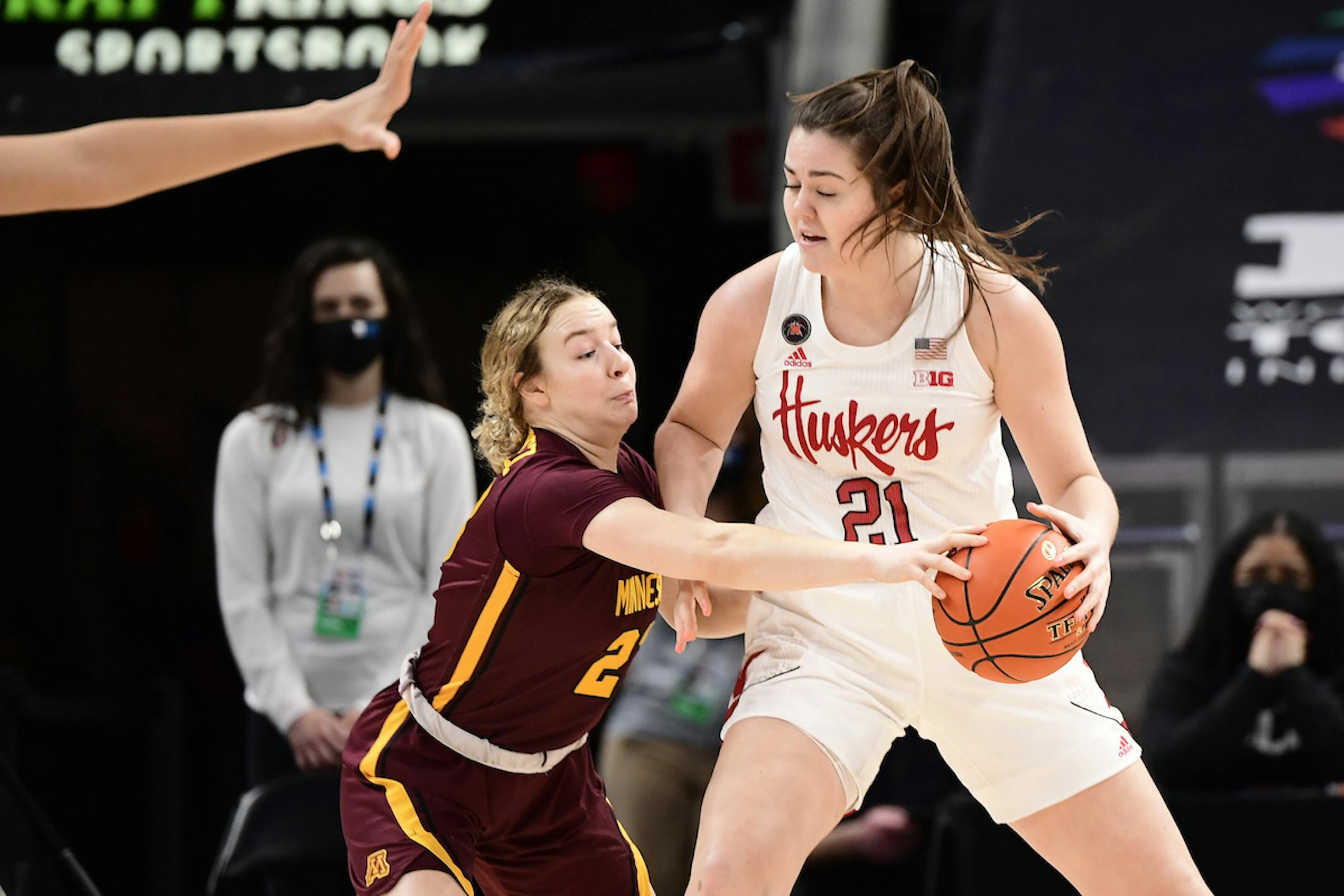 Freshman guard Katie Borowicz, in her first college start, and senior Gadiva Hubbard led the Gophers with 12 points each. Borowicz, of Roseau, finished with career highs in points and minutes (37). Another player from northern Minnesota — Nebraska guard Sam Haiby of Moorhead — scored a game-high 19 points and added eight rebounds.