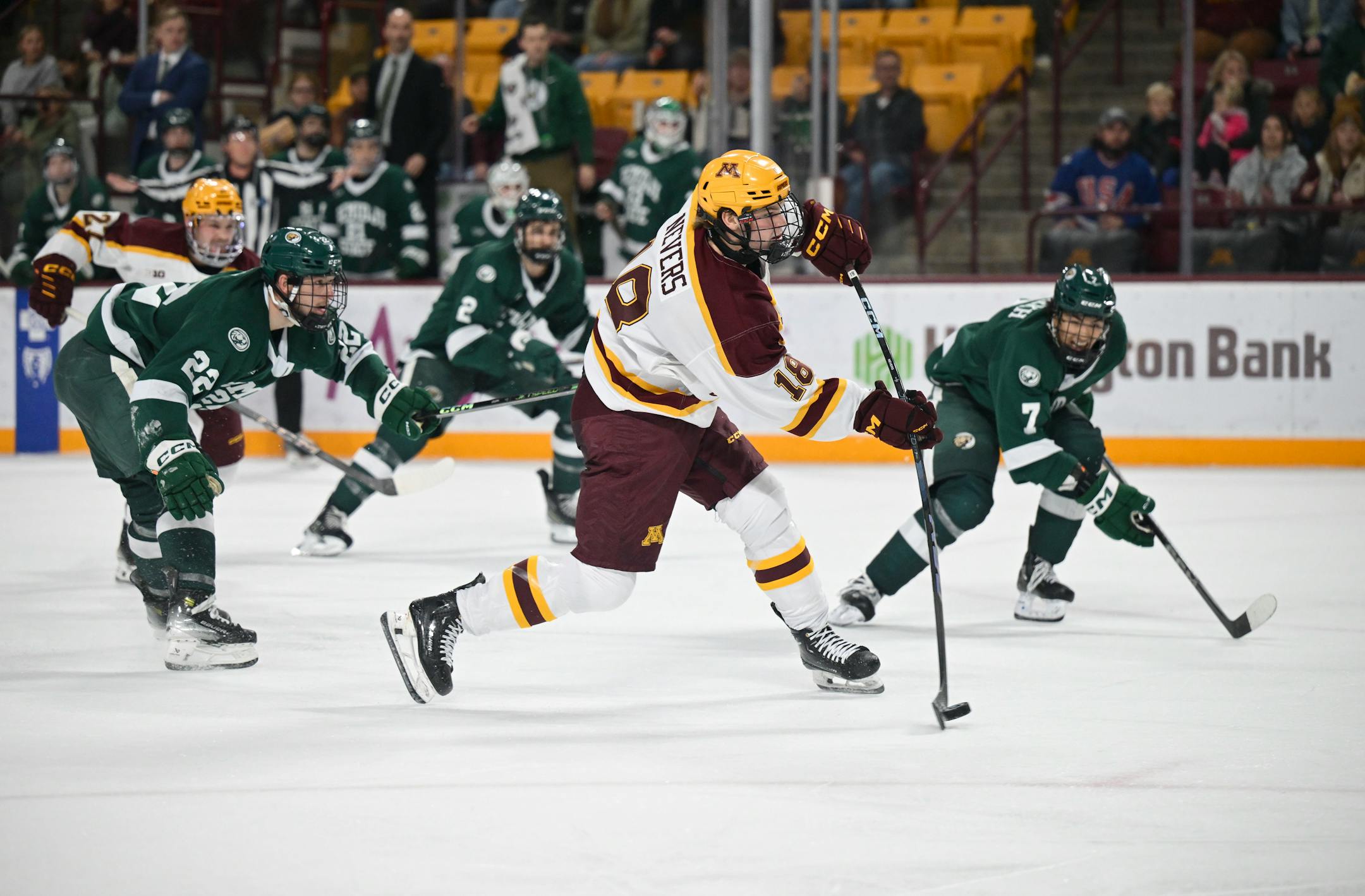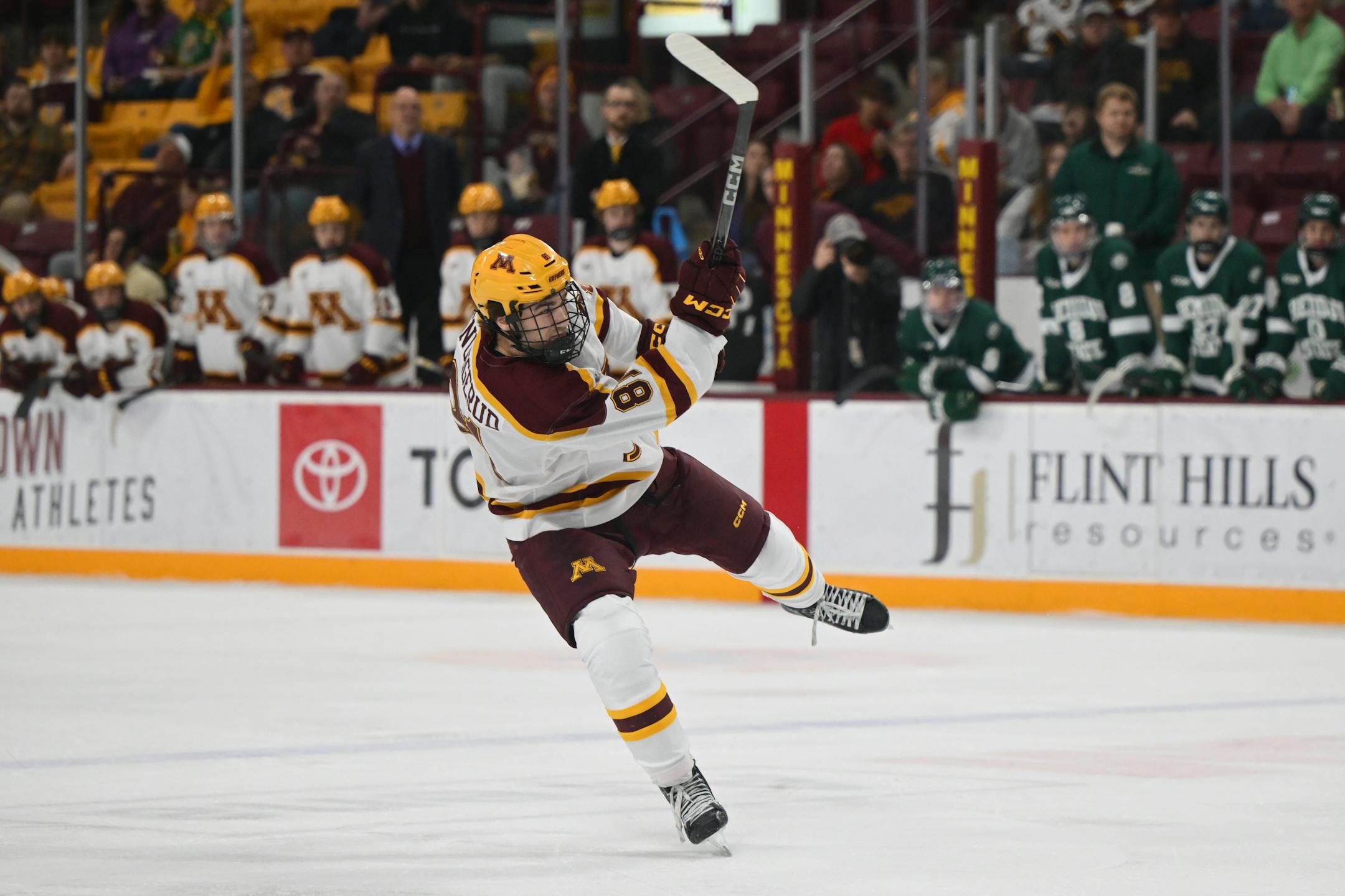 Oliver Moore had a goal and assist and Jimmy Snuggerud assisted on two goals in the first period as the Gophers built a 3-1 lead.