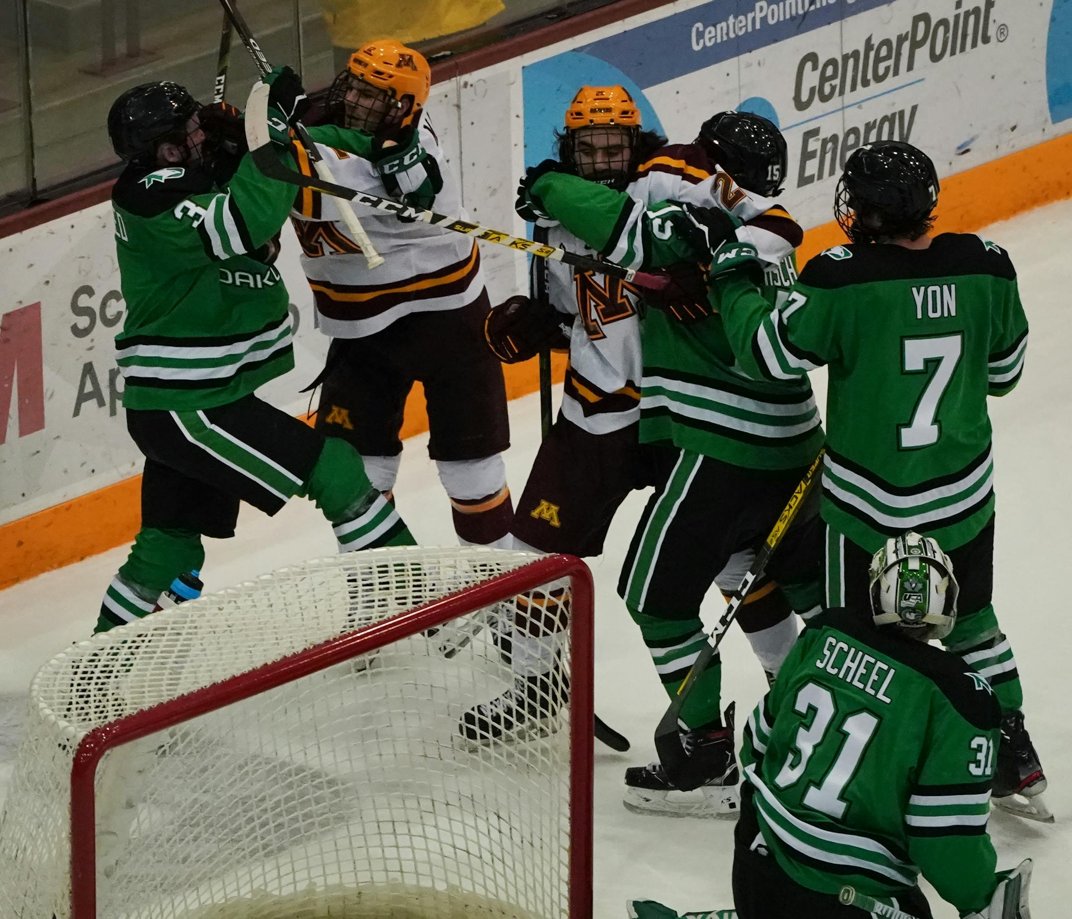 The Fighting Hawks (9-4) split with Minnesota Duluth at home — losing 4-1 and winning 2-1. North Dakota was 22-6-1 last season and fell one game short of the Frozen Four, just like Minnesota. This season, UND is 5-2 at home; the other home loss was 4-3 in overtime to Bemidji State on Oct. 16.