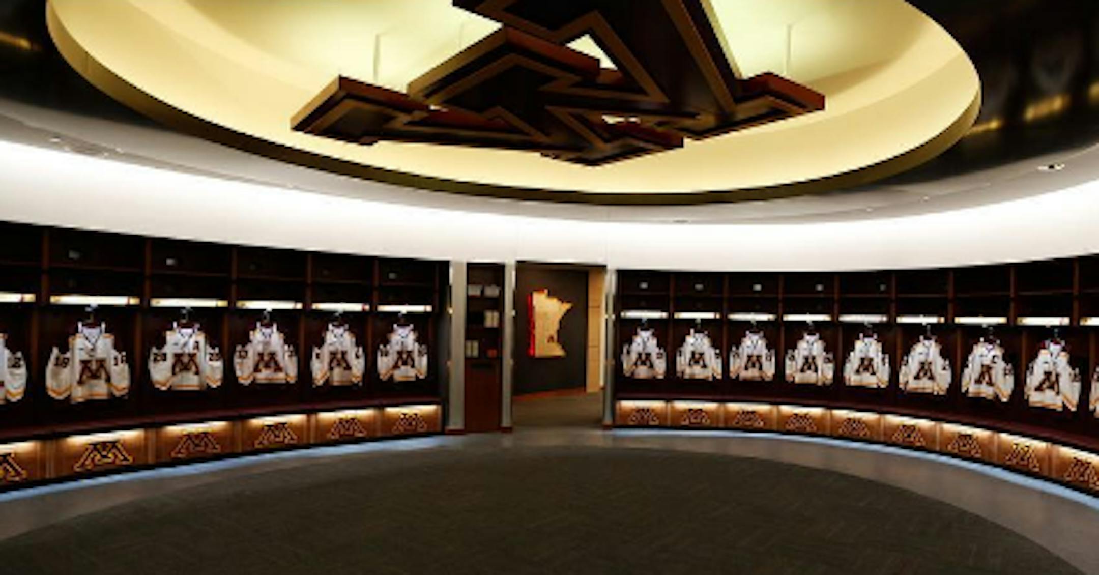 "Welcome to the new home of Gopher Hockey! It's officially Gophers move-in day," a post on the team's Instagram account said. The photo showcased the flashy locker room anchored by a large "M" hanging from the ceiling.