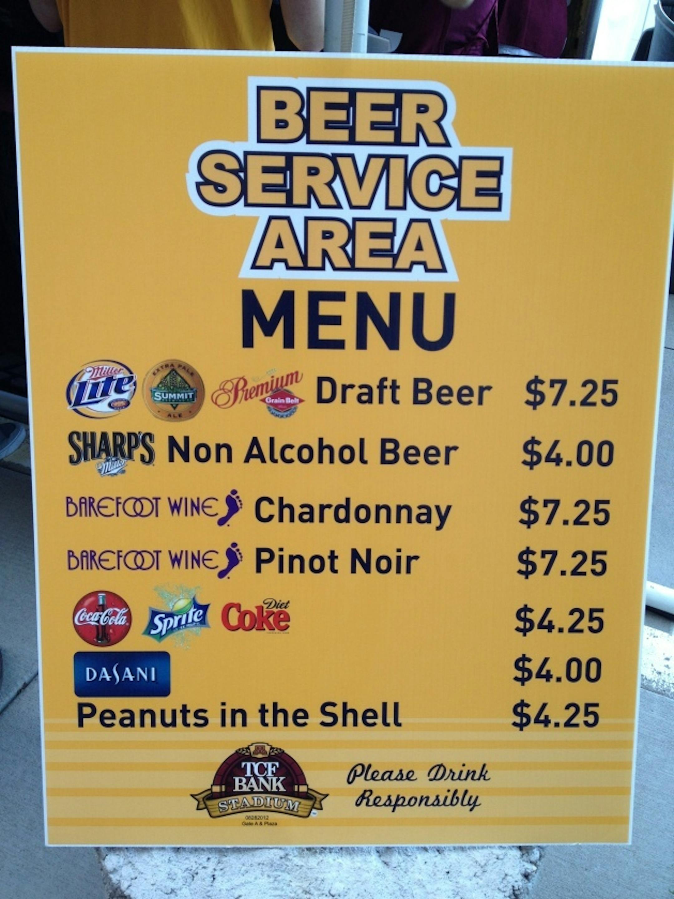 I'd say the 1st day of beer sales at TCF Bank was a success. The University of Minnesota reported that they received $111,119. Exact numbers are currently not available because premium/suite alcoholic beverages can differ in price, and sales numbers will need to be audited over the coming weeks to ensure accuracy (per the U of MN). Approximately 15,327 servings of beer and wine were sold at the stadium, including an estimated 11,118 servings in the general seating area and 2,209 in premium/suite areas.