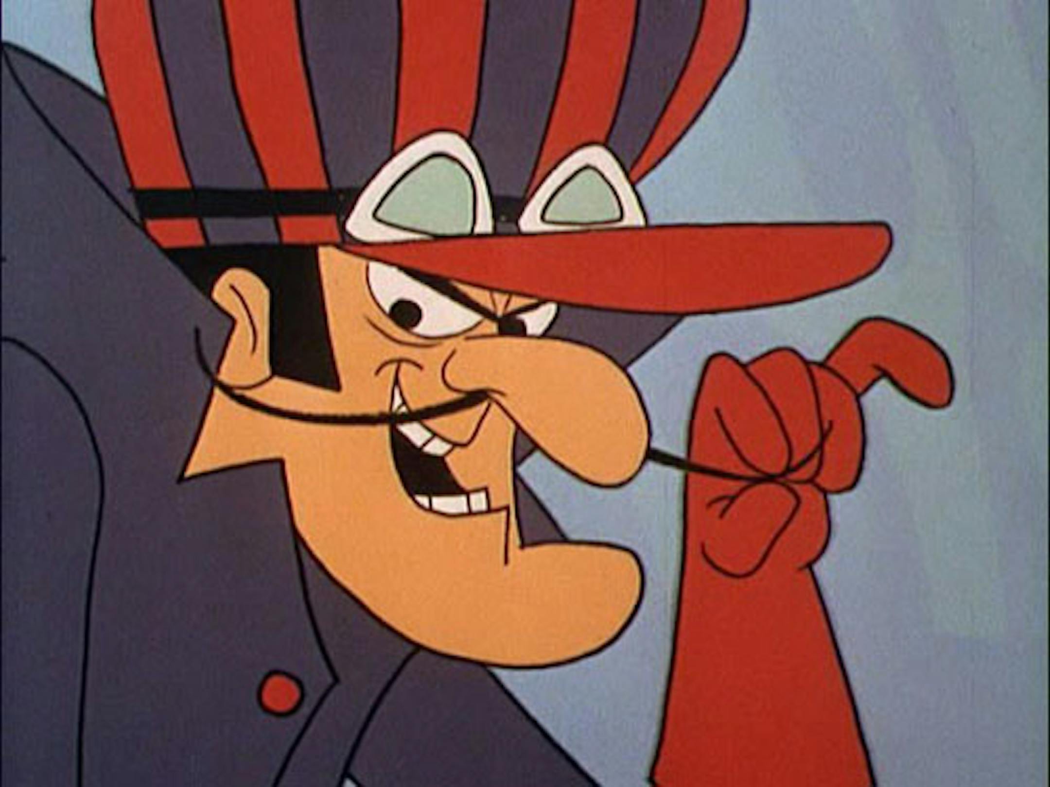 Dirk Dastardly from the Penelope Pitstop cartoon, right? The guy with the snickering dog, which was funny for about 14 seconds? Hanna-Barbera junk from the 60s/70s now prized by boomers for qualities it never had, and ironically admired by post-Millennials for its irony-free banalities? Something like that.