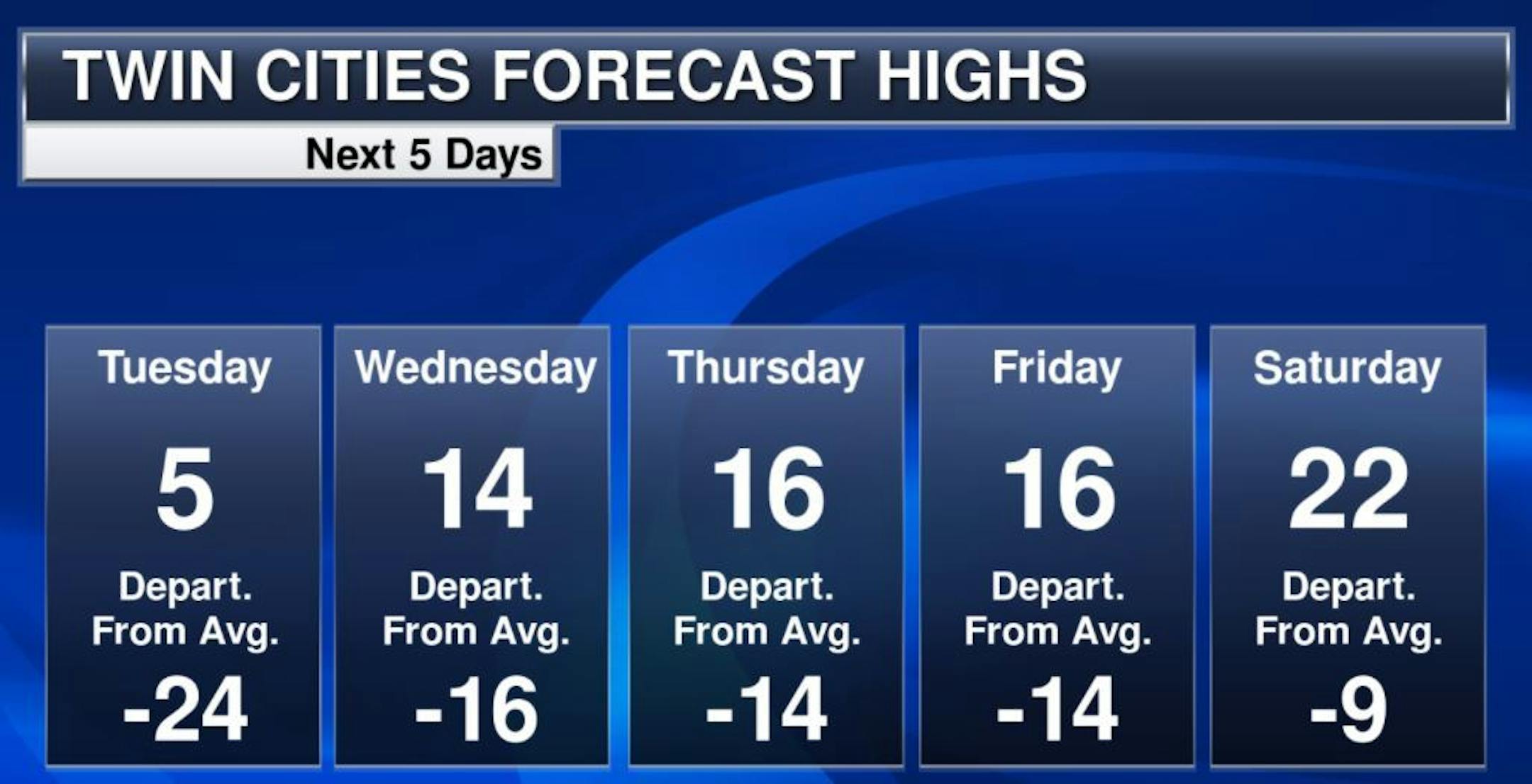 Here's the extended weather outlook for Minneapolis through the week and into the weekend ahead. Tuesday will still be quite cold with highs only warming into the single digits, which will be nearly -25F below average. The gradual warming trend will continue through the rest of the week with highs in the teens and by the weekend, we could be in the 20s and 30s, how about that!