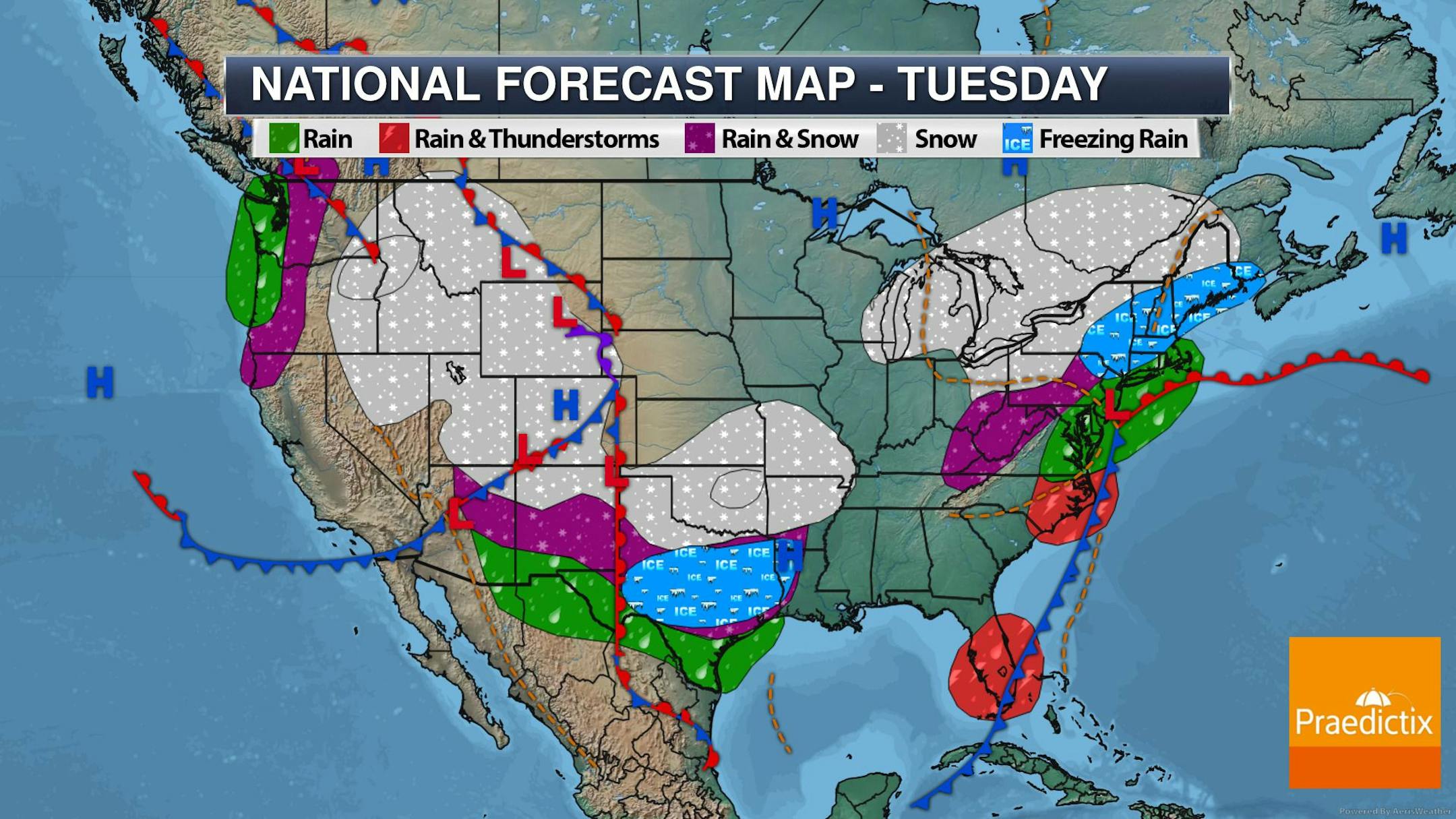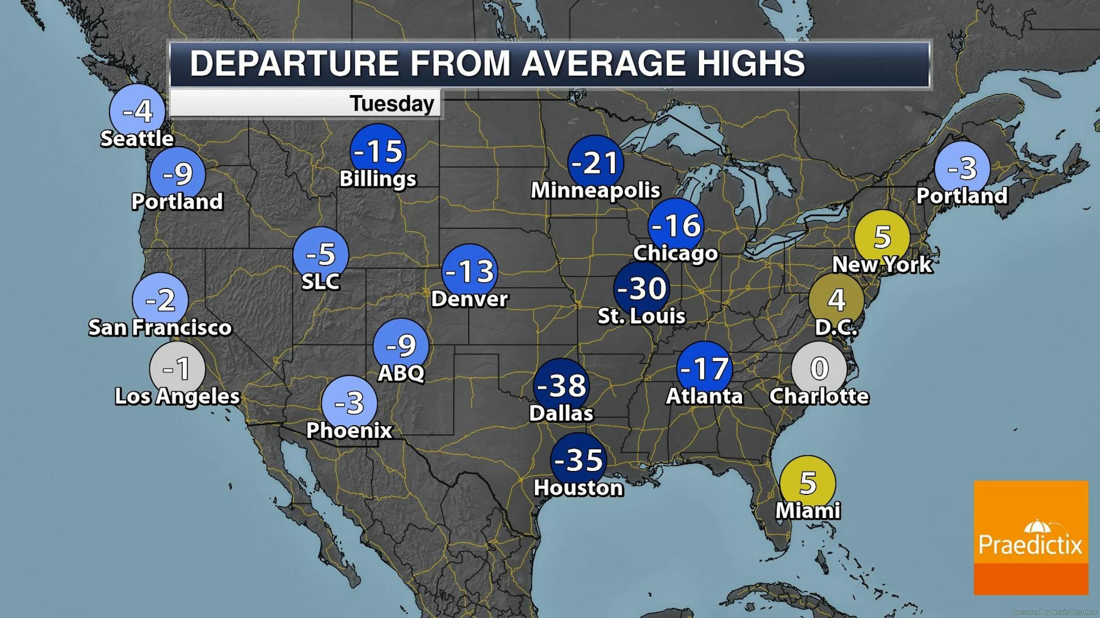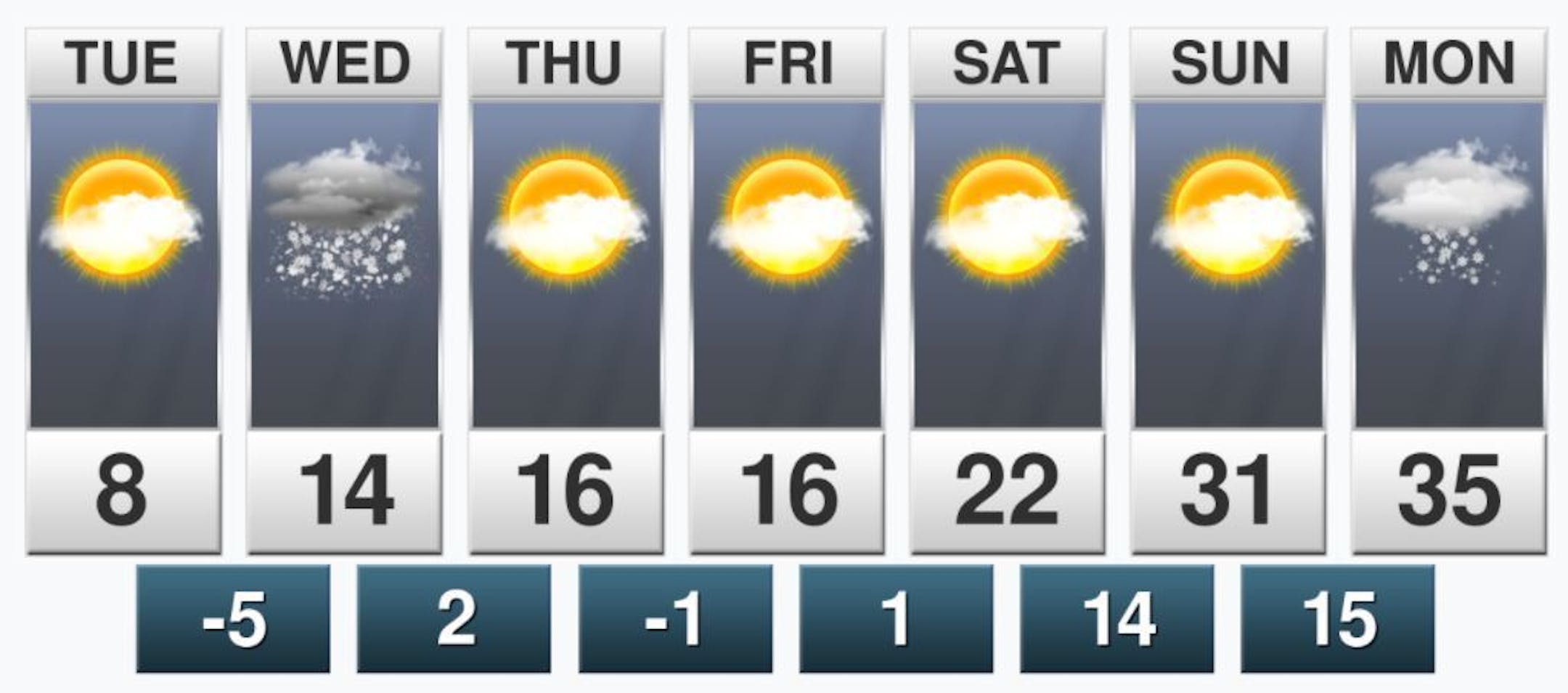 Here's the weather outlook across the region for Tuesday. Highs will still be running -15F to nearly -30F below average across the region with highs only warming into the single digits above and below 0F. Clouds will increase late in the day ahead of light snow chances that will develop Wednesday.