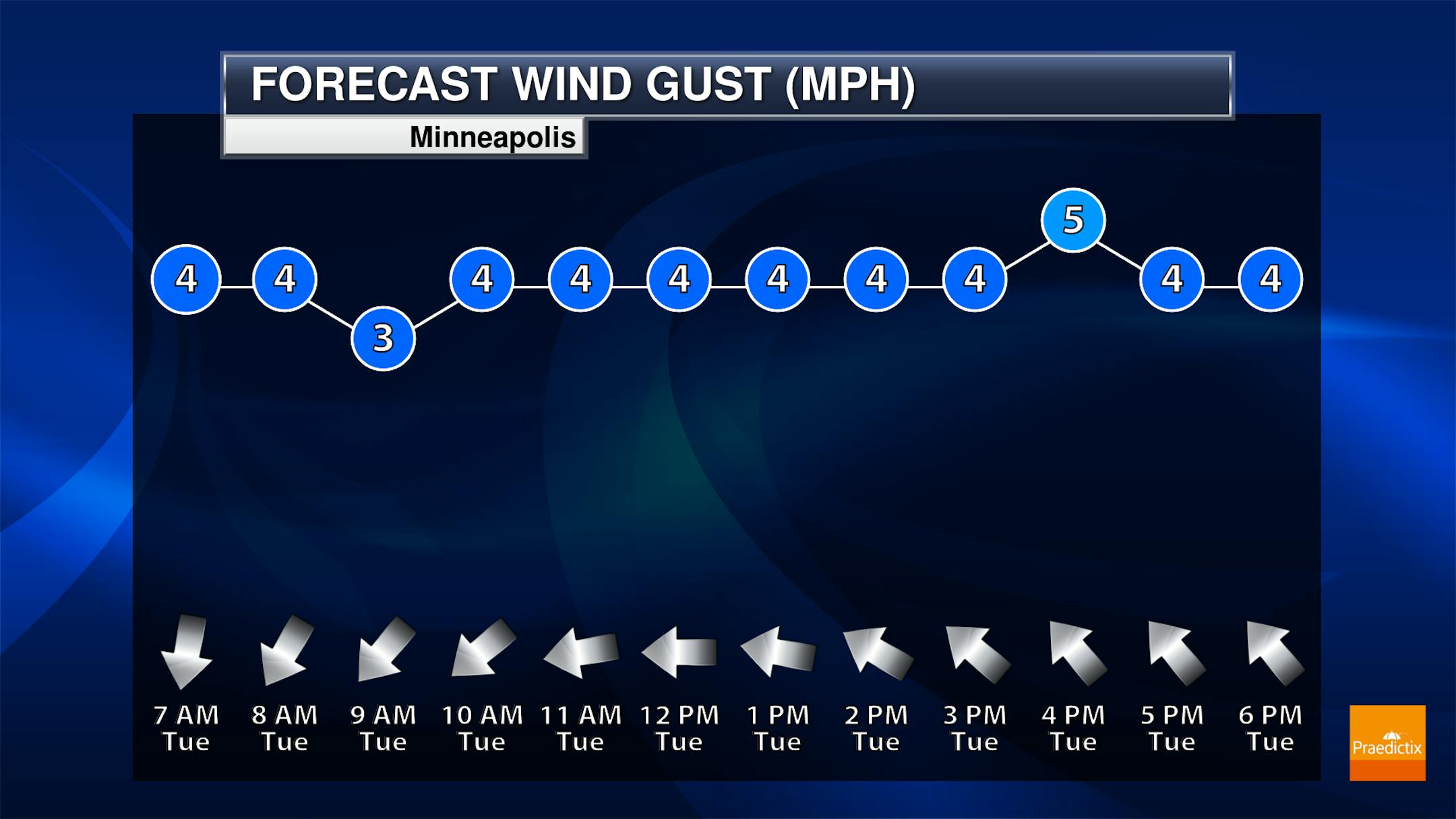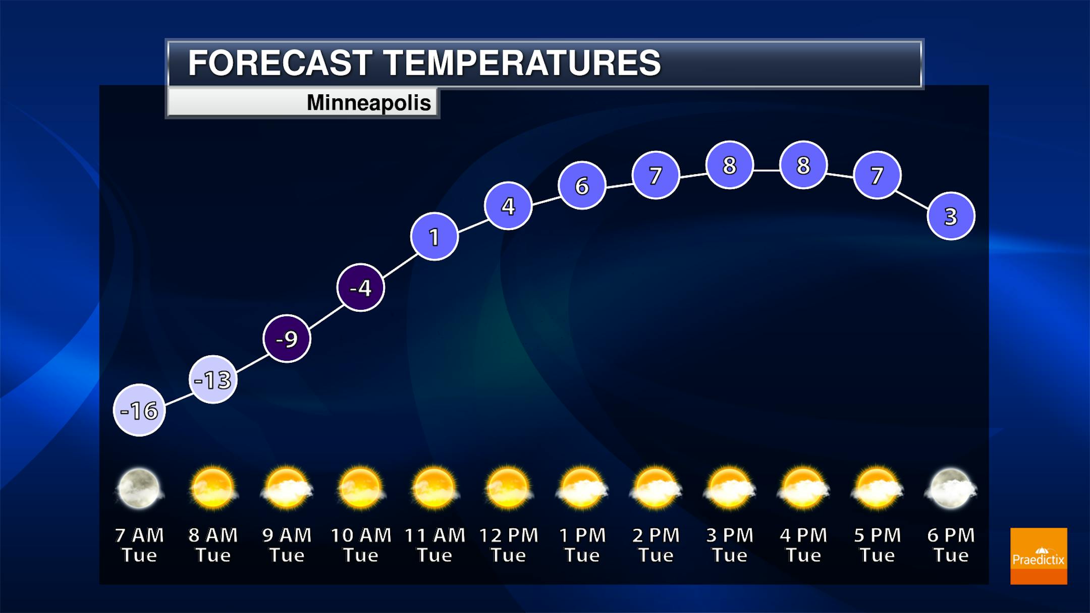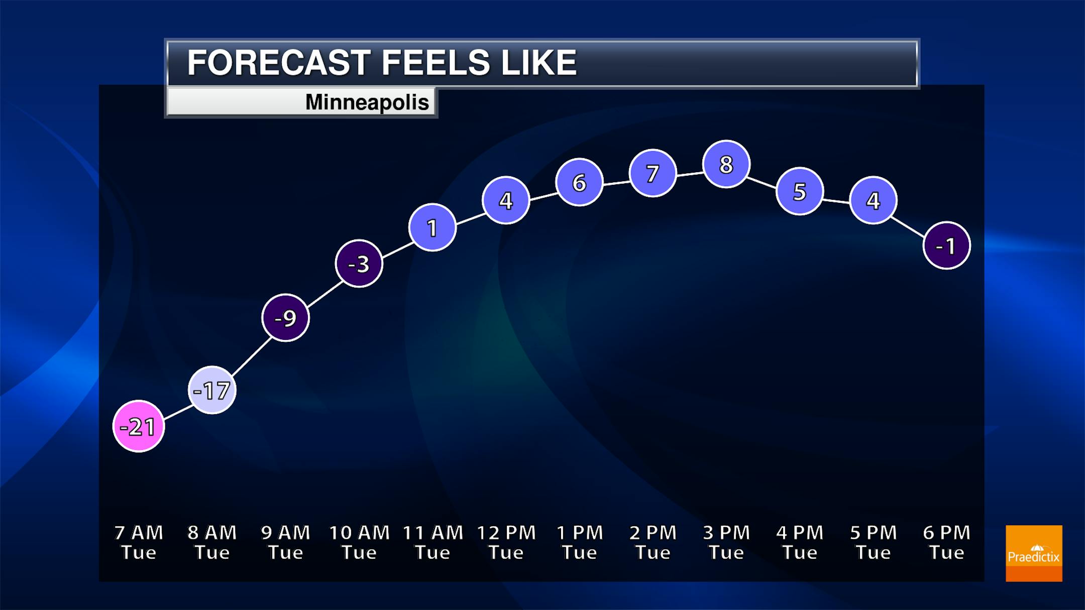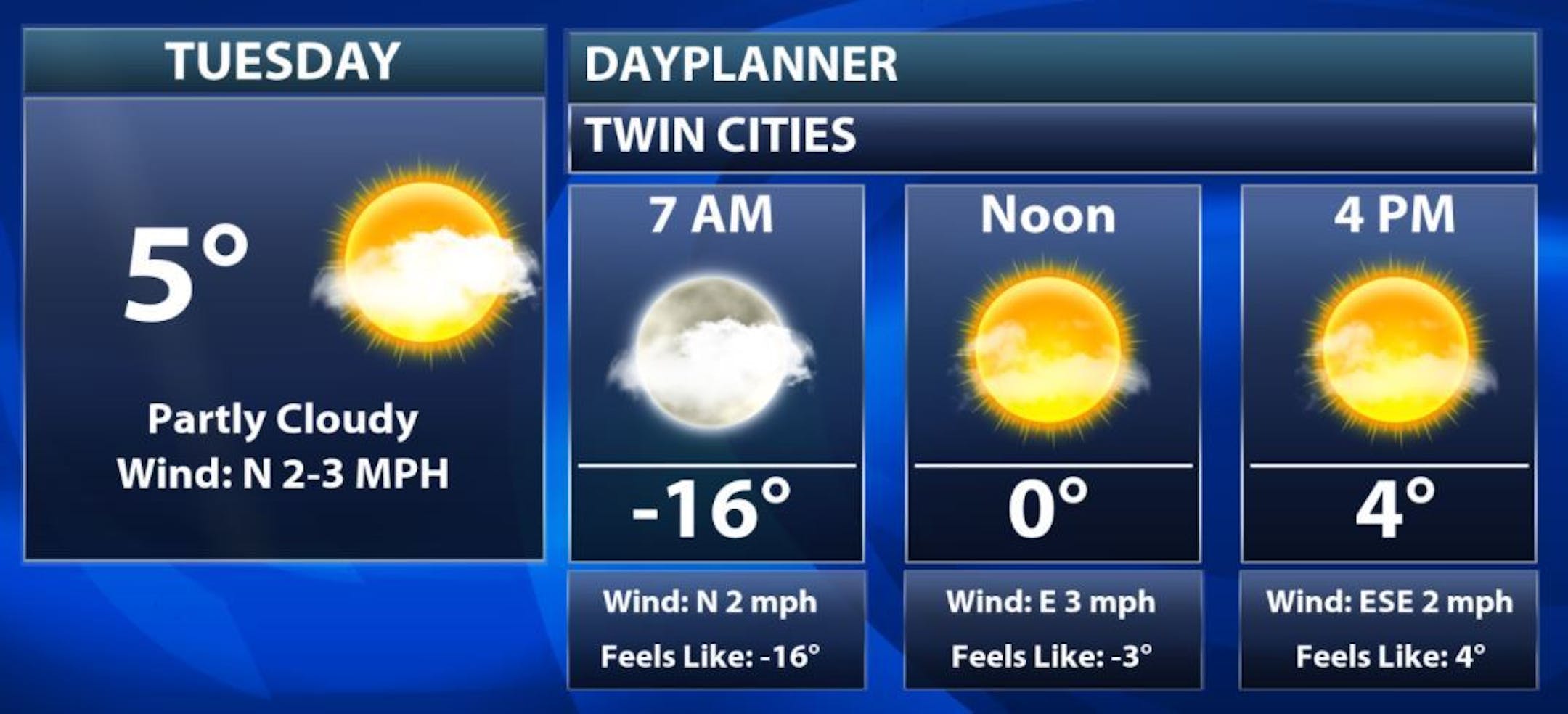 Here's the weather outlook for Minneapolis on Tuesday. It'll be another cold day with highs only warming into the single digits above zero, however, with a light breeze, it may feel more like the subzero range throughout most of the day.