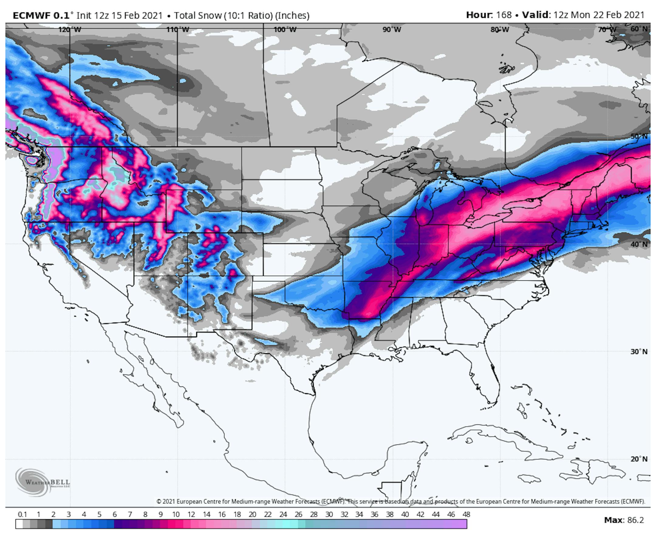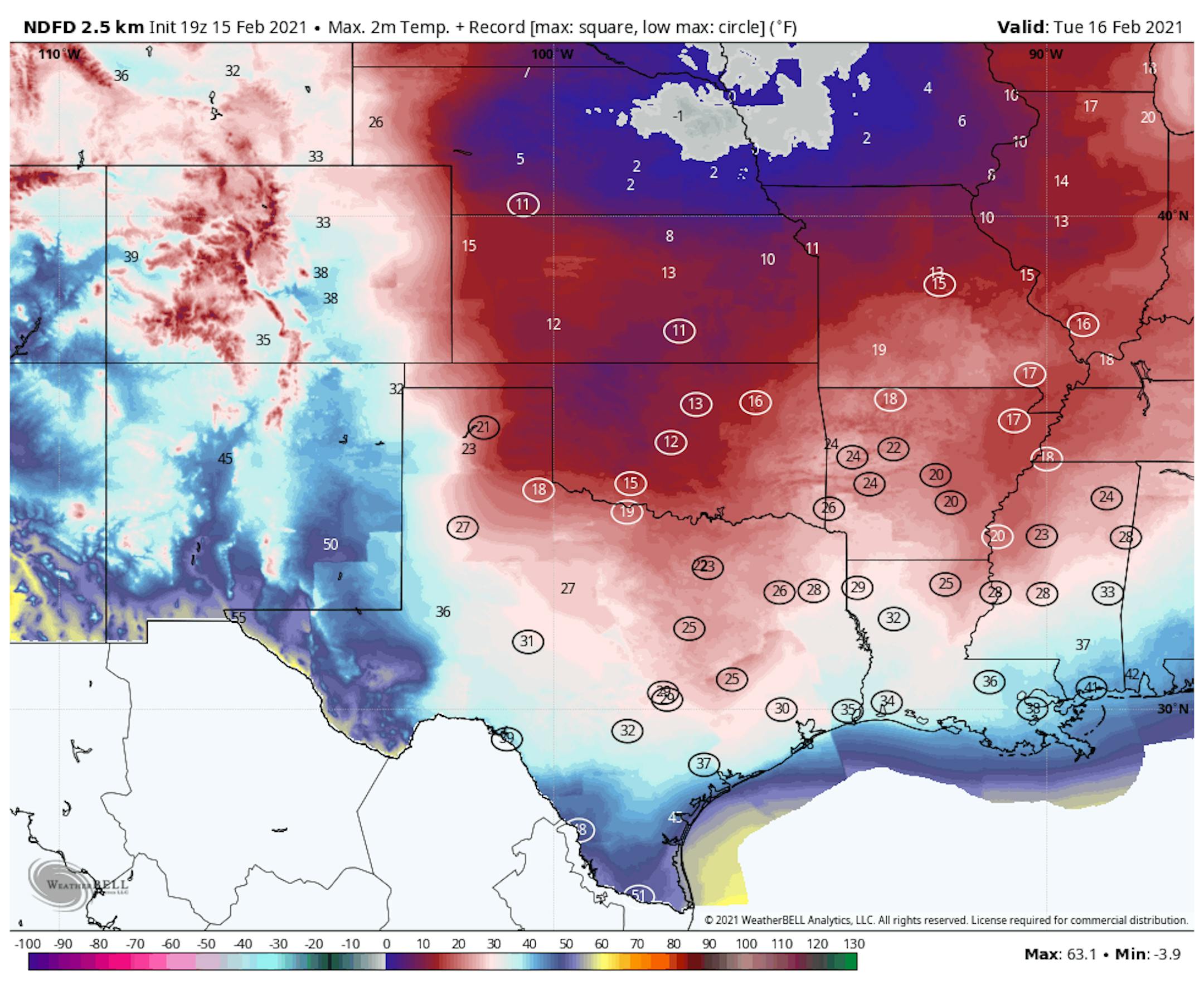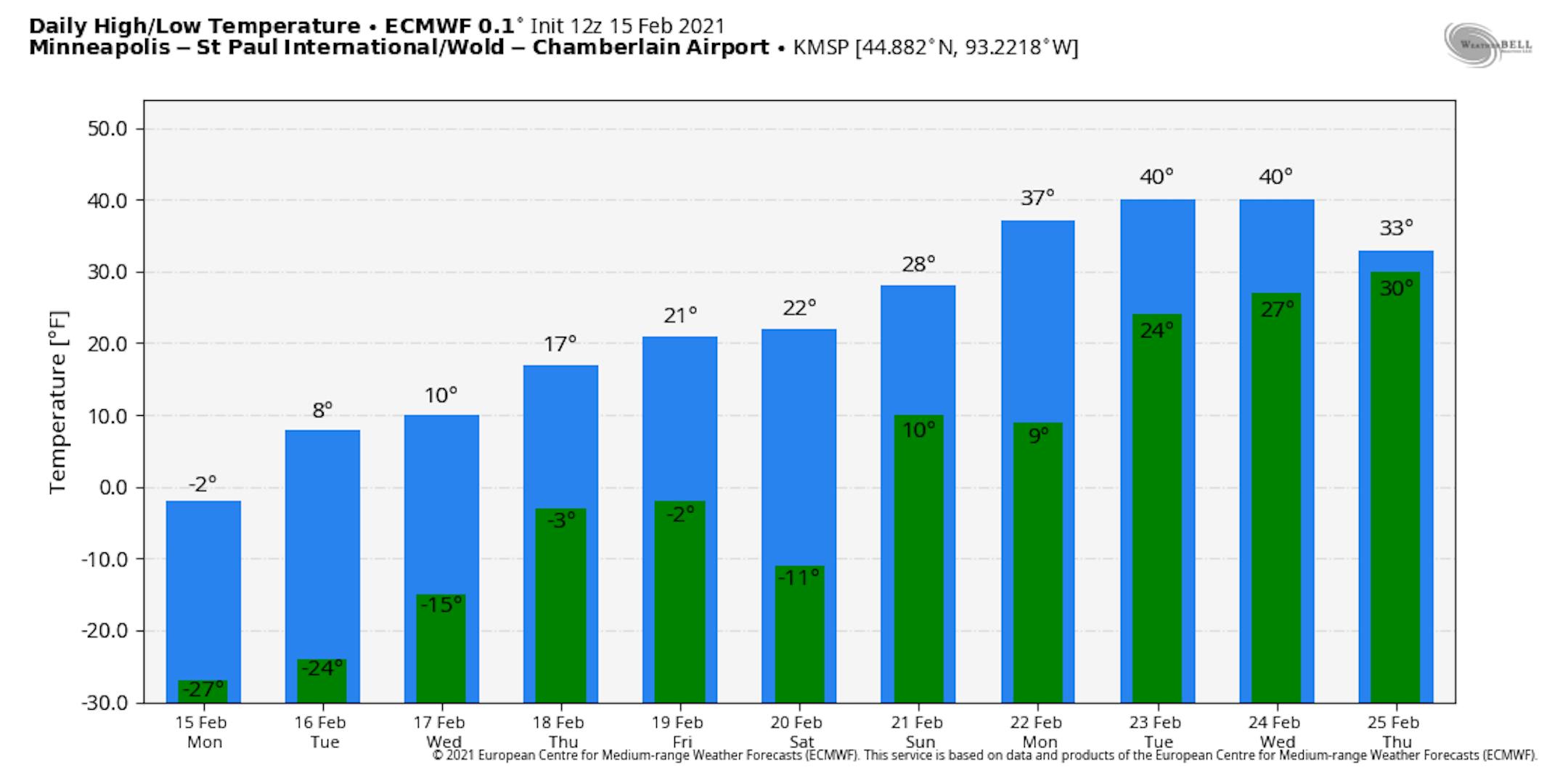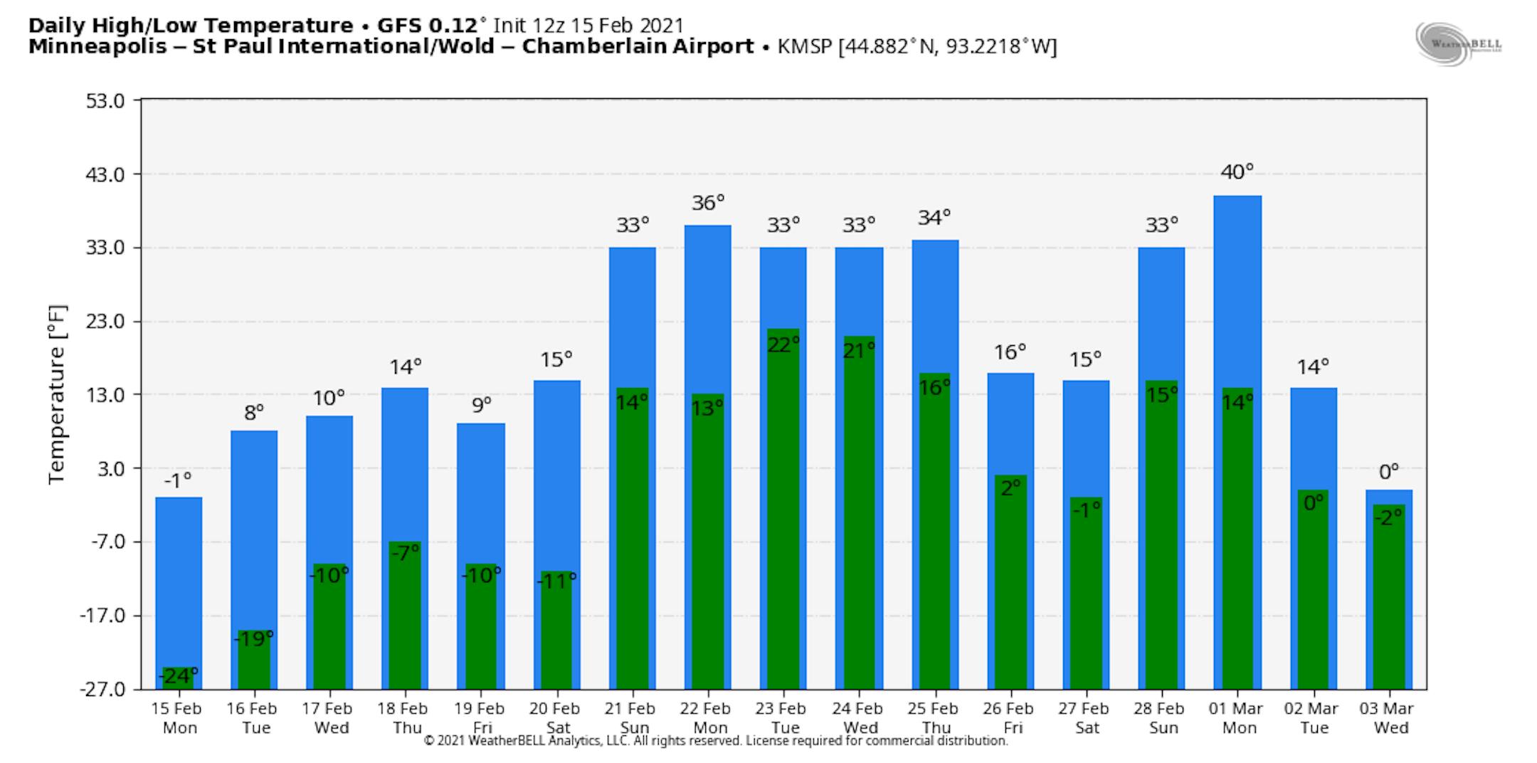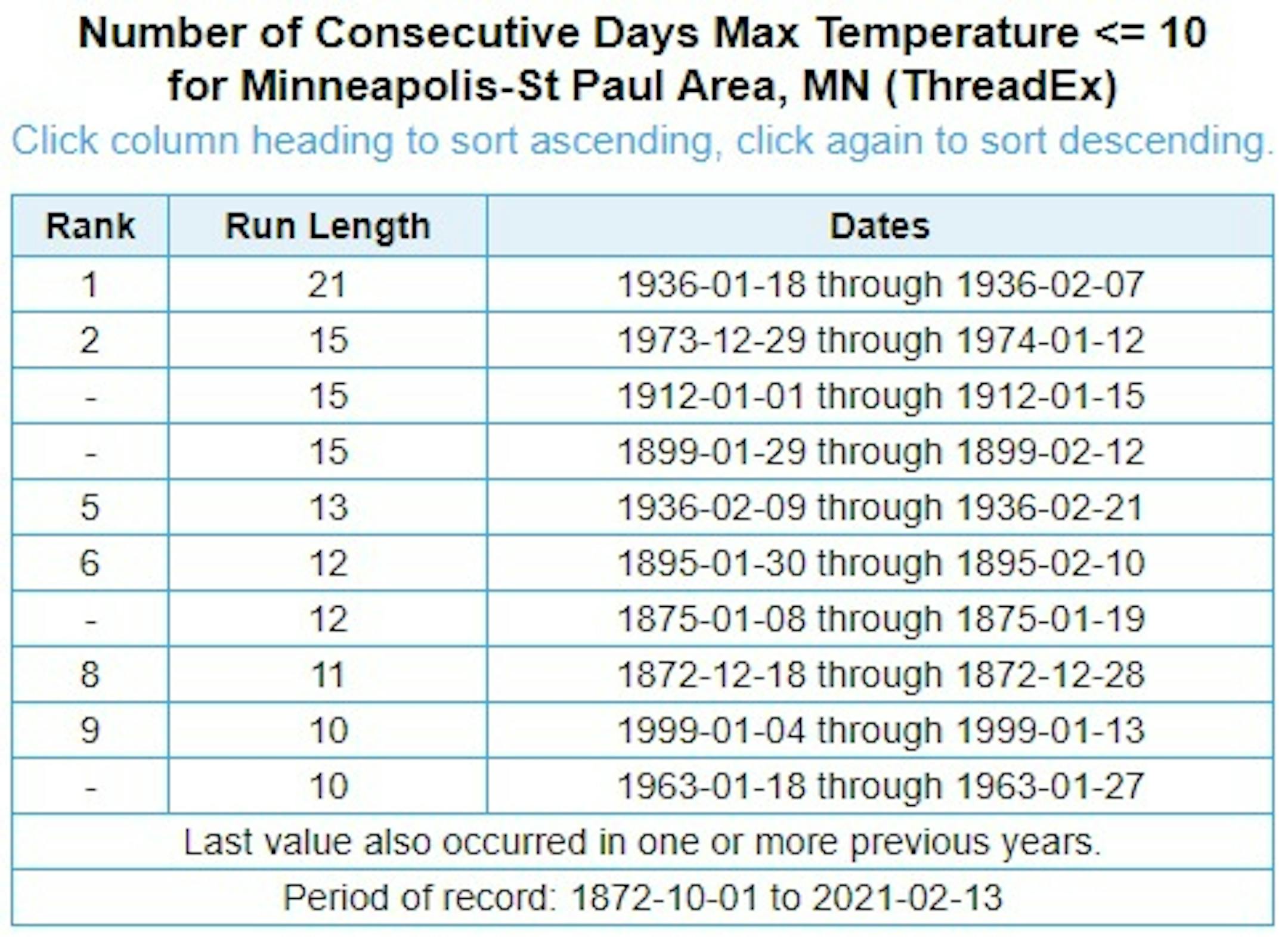 Monday, February 15th was the 10th consecutive day with sub +10F high temps at MSP. The forecast calls for sub +10F highs again on Tuesday, which would bring our stretch to 11 consecutive days and would put us 8th longest stretch on record.