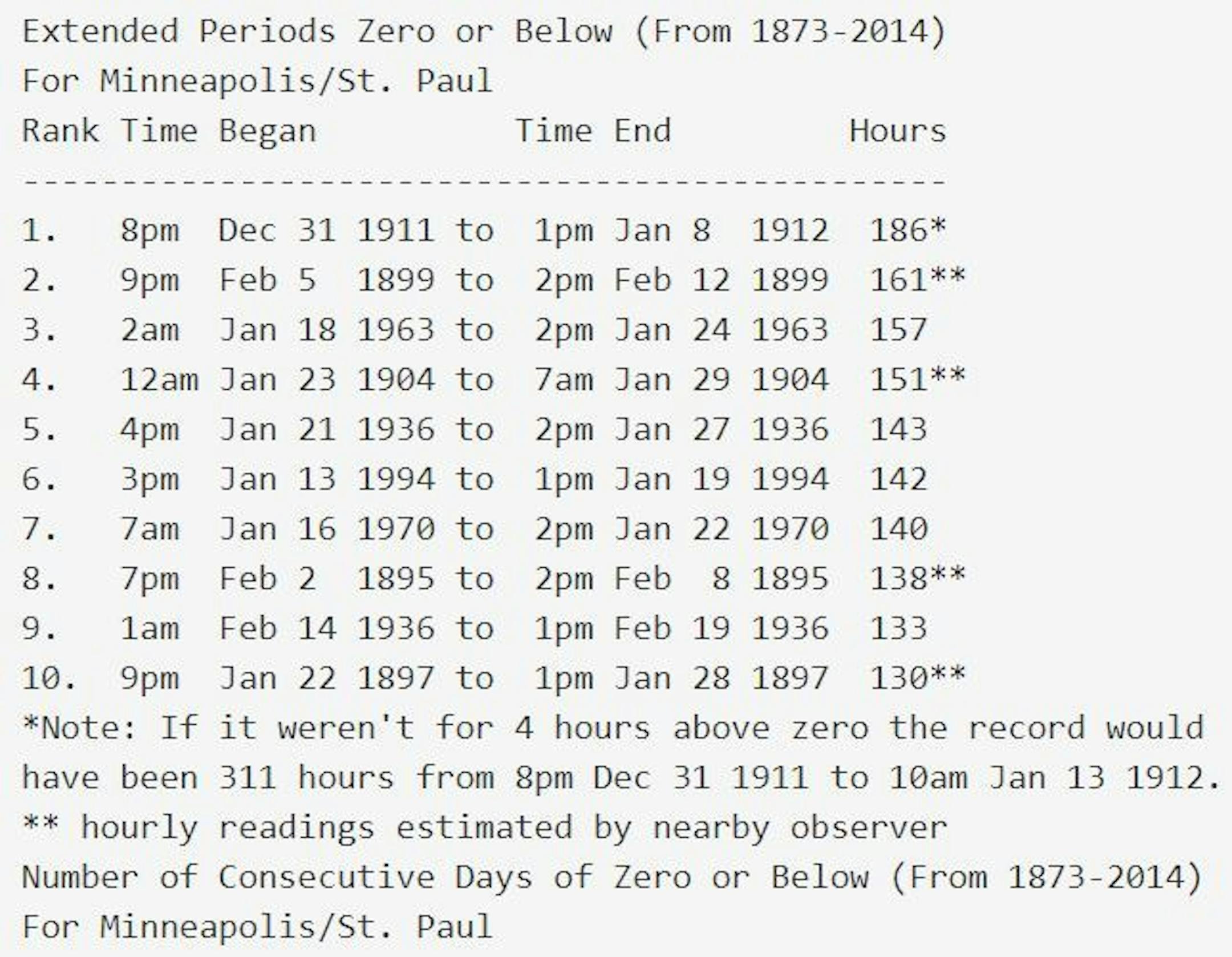 "Since 1873, the temperature in the Twin Cities has remained at or below zero for at least four consecutive days a total of 27 times, with the most recent occurrence being a five-day stretch ending January 18th, 1994. The longest such streak on record was seven days, from January 1-7, 1912. The same stretch in 1912 clocked in at 186 consecutive hourly observations with temperatures at or below zero. The stretch in 1994 lasted 142 hours. More recent zero-or-colder stretches include 86 hours from 11pm January 12 to 1pm January 16, 2009 and 93 hours from 5pm January 31, 1996 to 1pm February 4, 1996. How long would a stretch of zero or below weather be to make the top ten list? The mercury would have to stay at or below zero for at least FOUR full calendar days to have a chance of making the list. The last time there was a fairly long stretch at or below zero was from midnight, January 29, 2019 to 5 am on February 1, 2019 for a total of 78 hours."