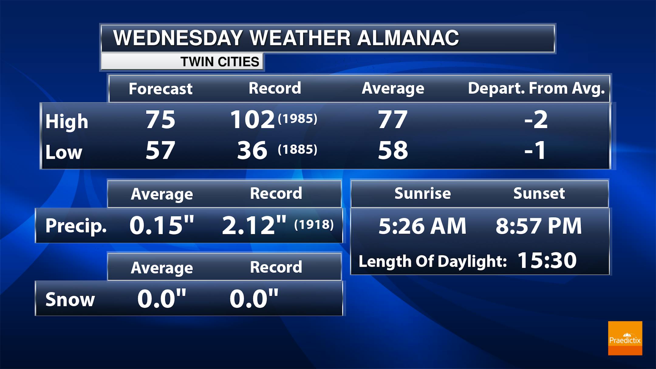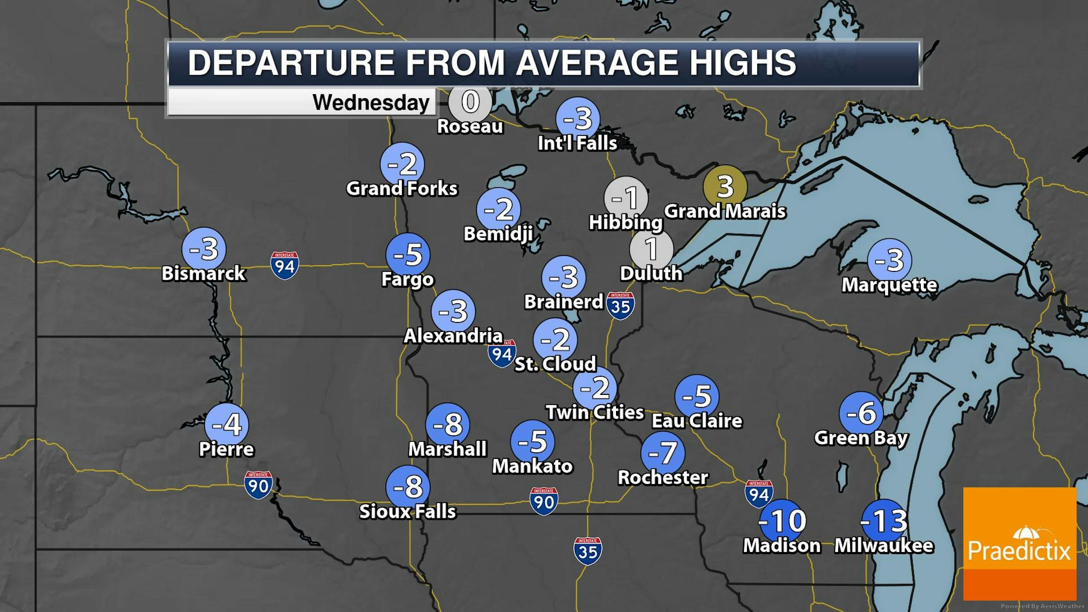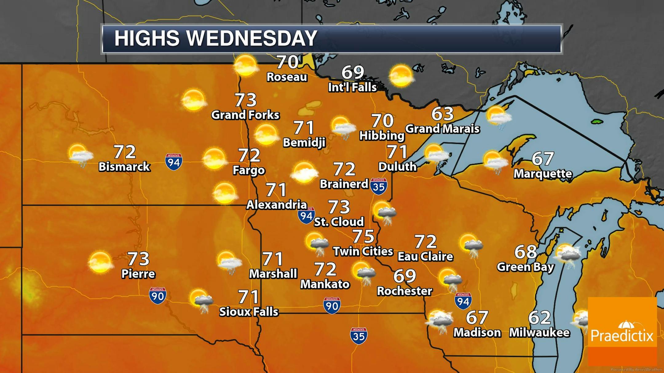 Temps around the region on Wednesday will warm into the 60s and 70s, which will be nearly -5F below average. There will also be a slight chance of showers and perhaps a rumble of thunder across southern Minnesota.