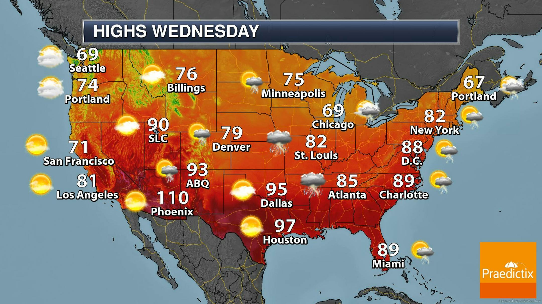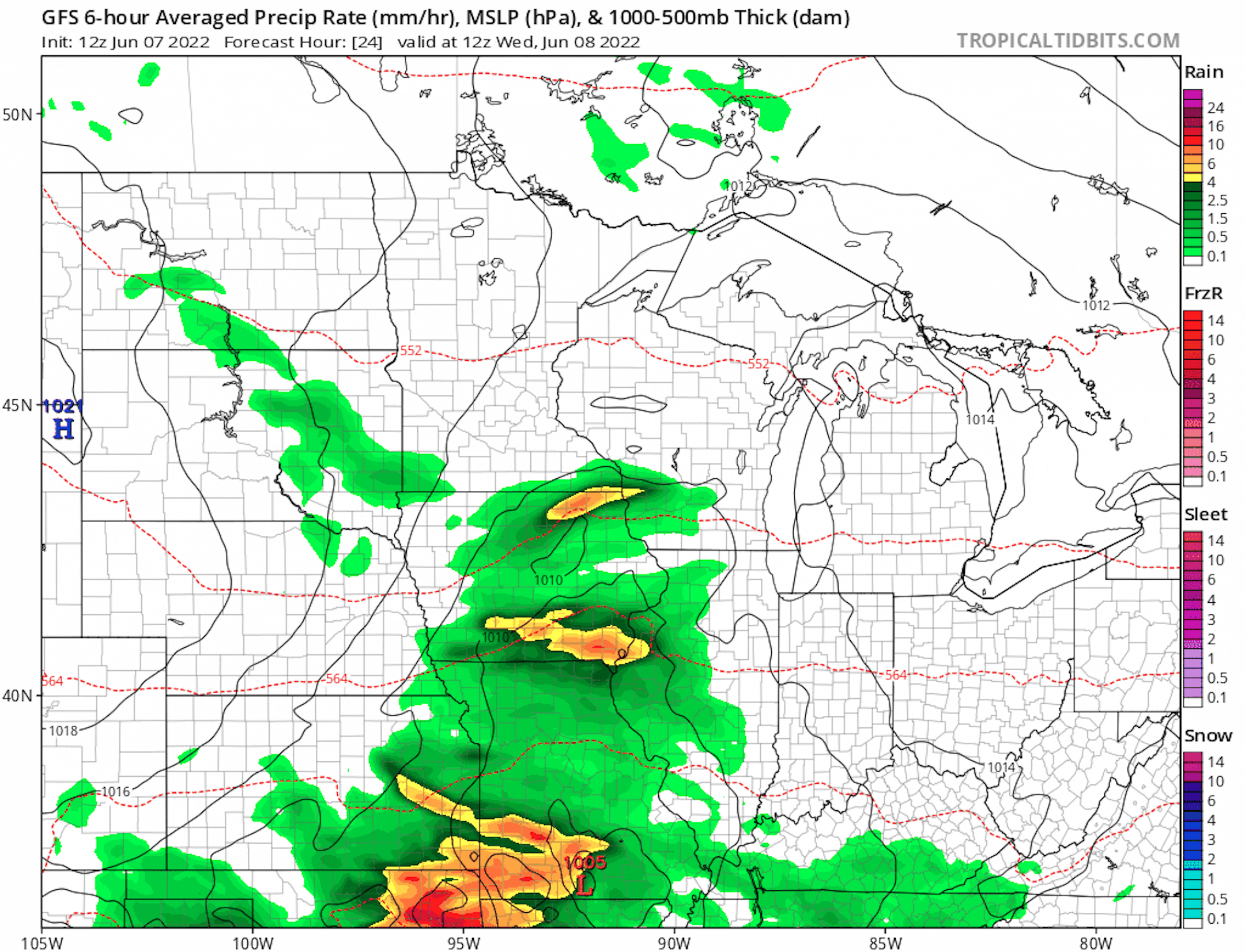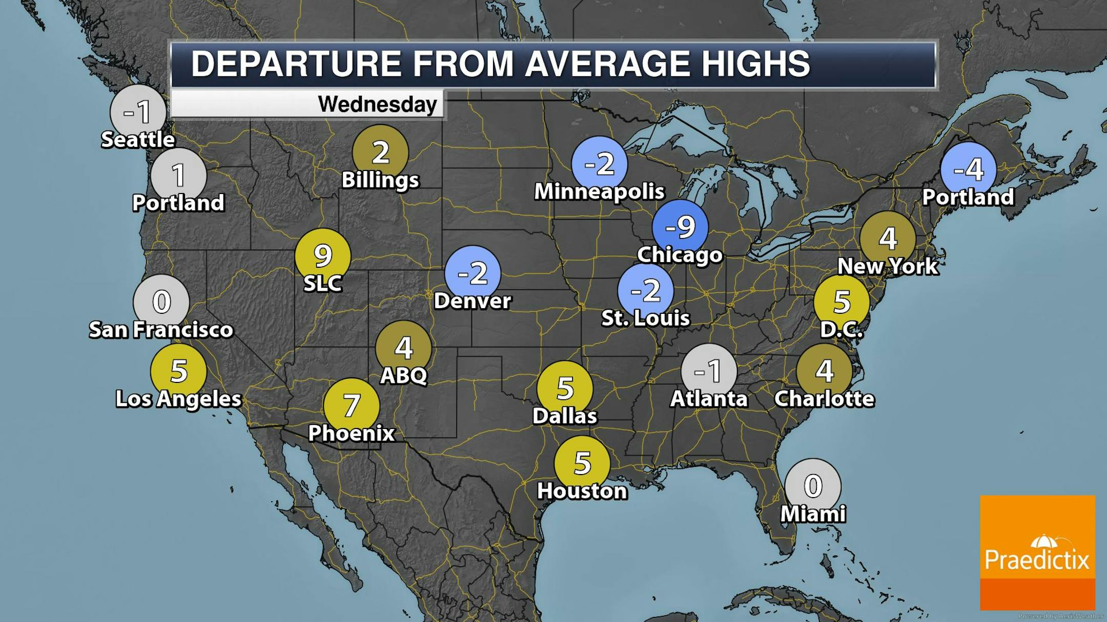 Temps around the region on Wednesday will warm into the 60s and 70s, which will be nearly -5F below average. There will also be a slight chance of showers and perhaps a rumble of thunder across southern Minnesota.