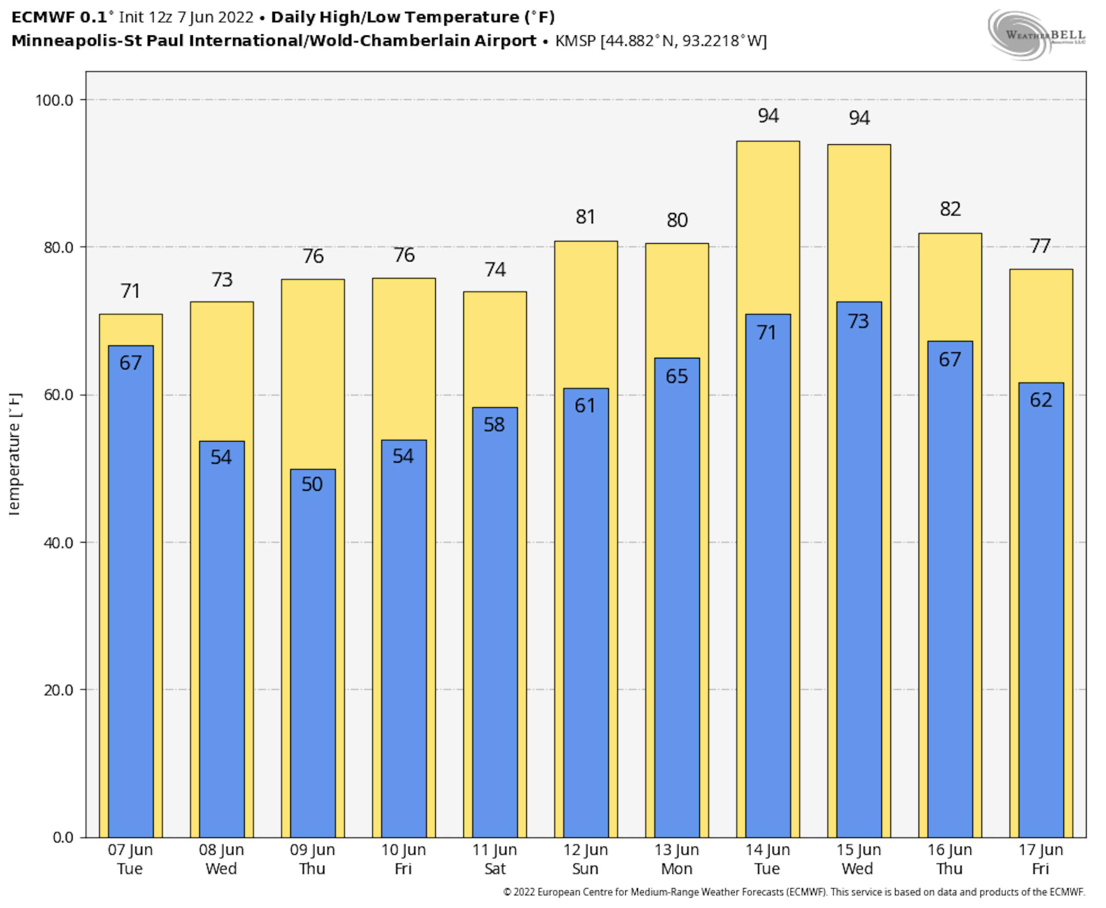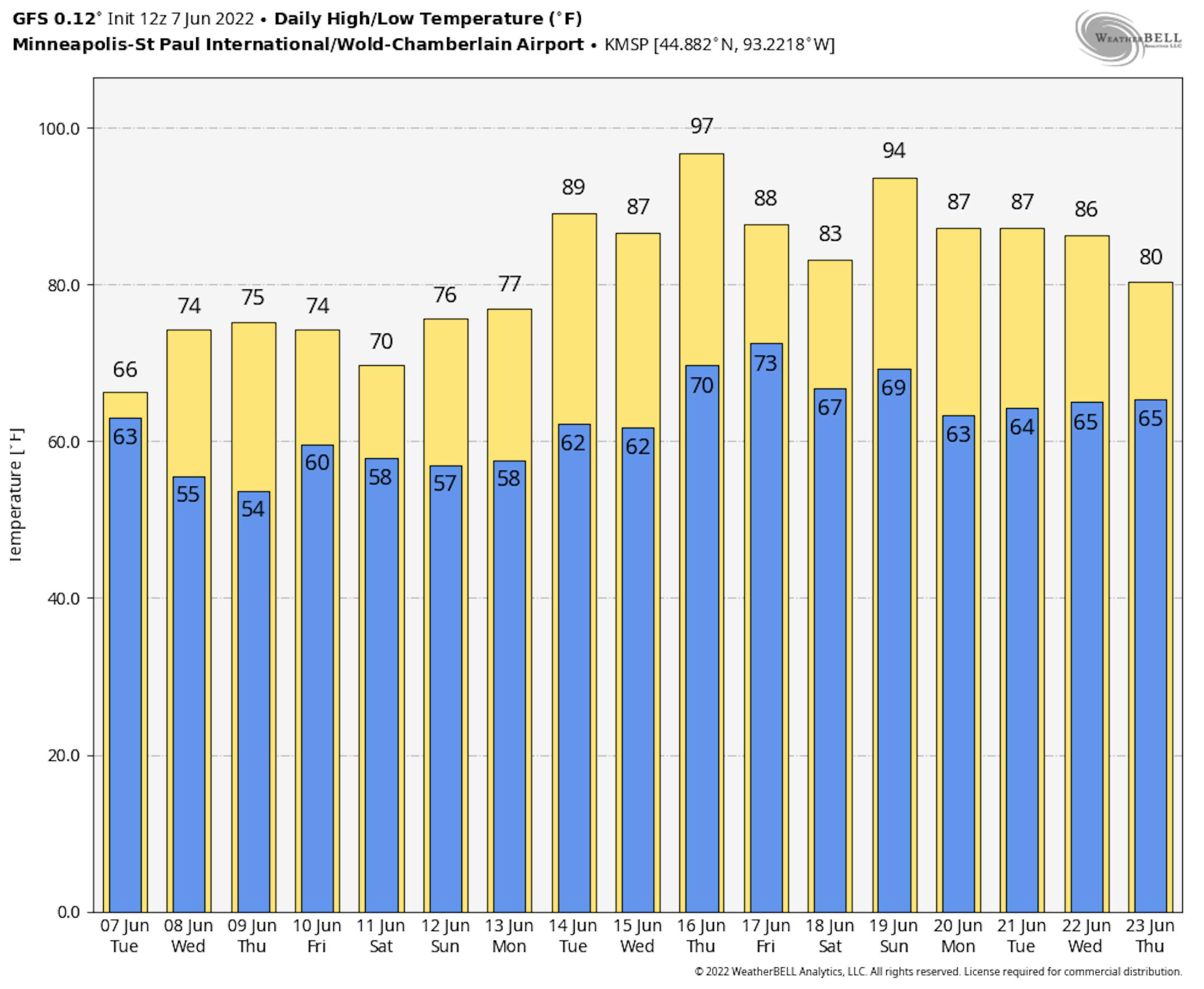 The extended temperature outlook for Minneapolis shows temps running at or slightly below average through the rest of the week. Readings may warm slightly as we approach the weekend with highs warming close to 80F.