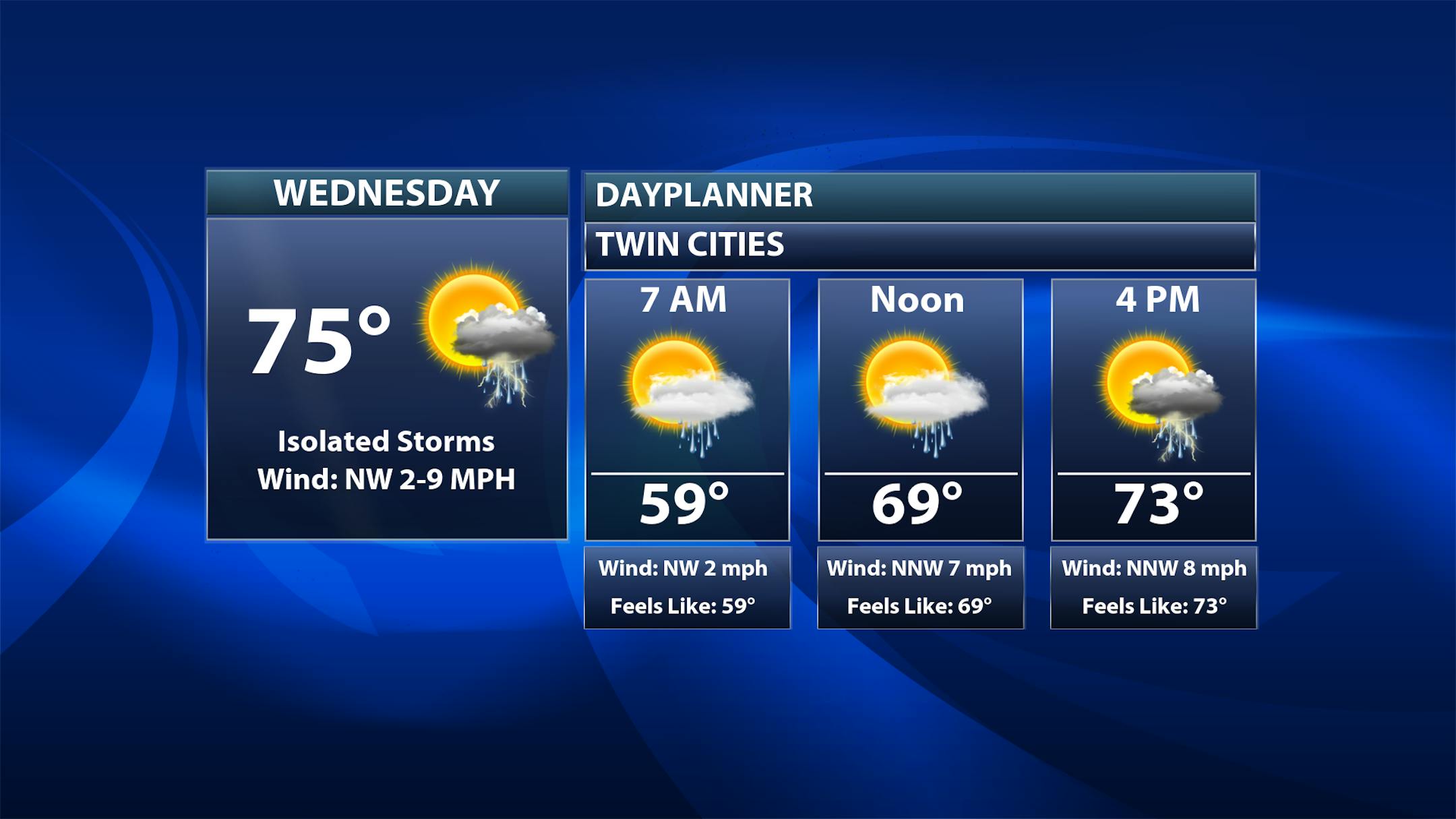 The weather outlook for Minneapolis on Wednesday shows high temps warming into the mid 70s by the afternoon with isolated shower or rumble of thunder possible.