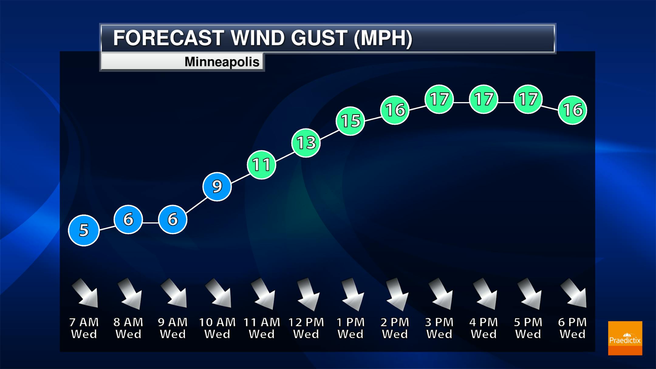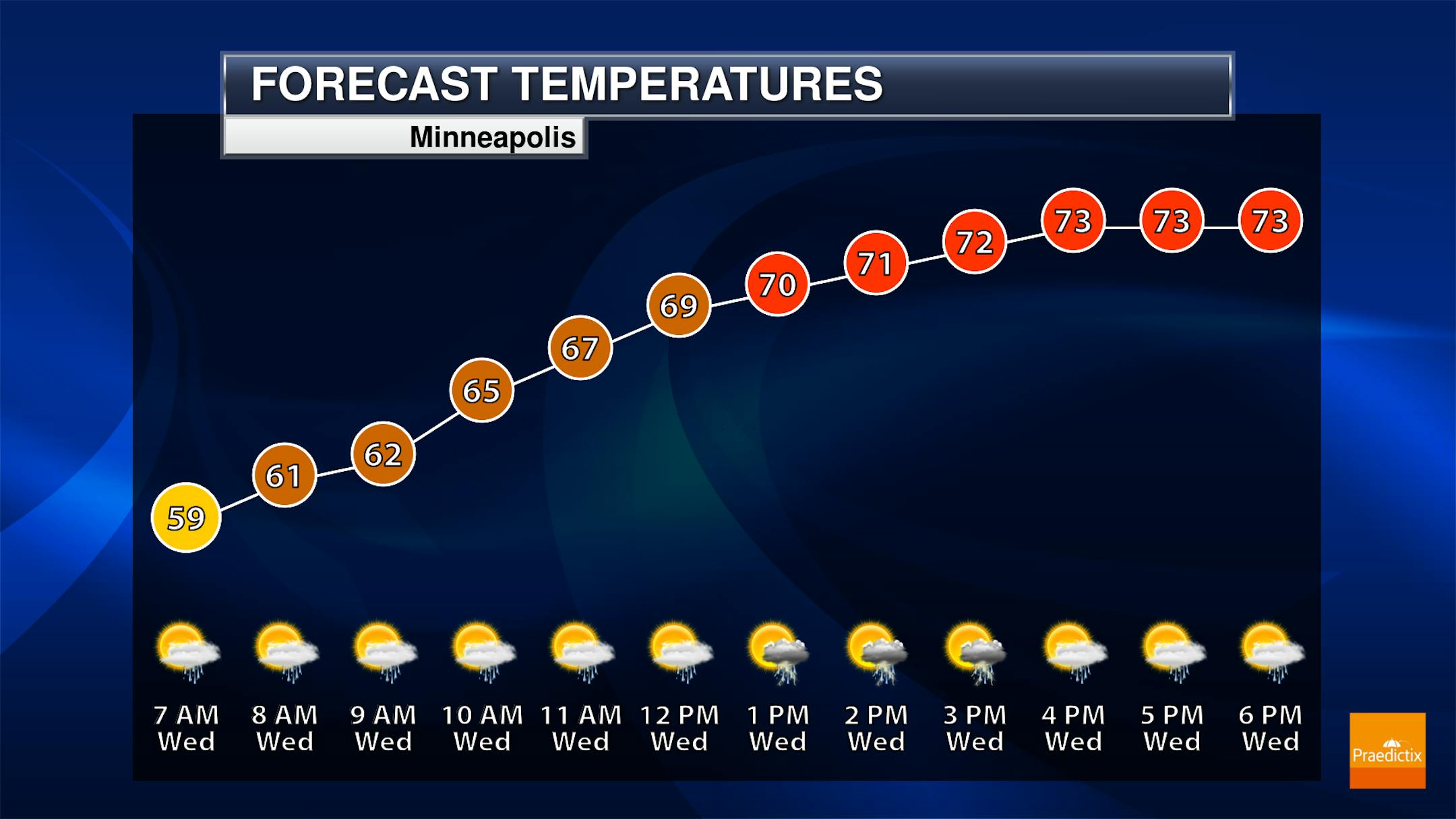 The hourly temps for Minneapolis on Wednesday shows temperatures starting around 60F in the morning and warming into the low/mid 70s by the afternoon. There is a slight chance of showers and a rumble of thunder through the day, especially south.