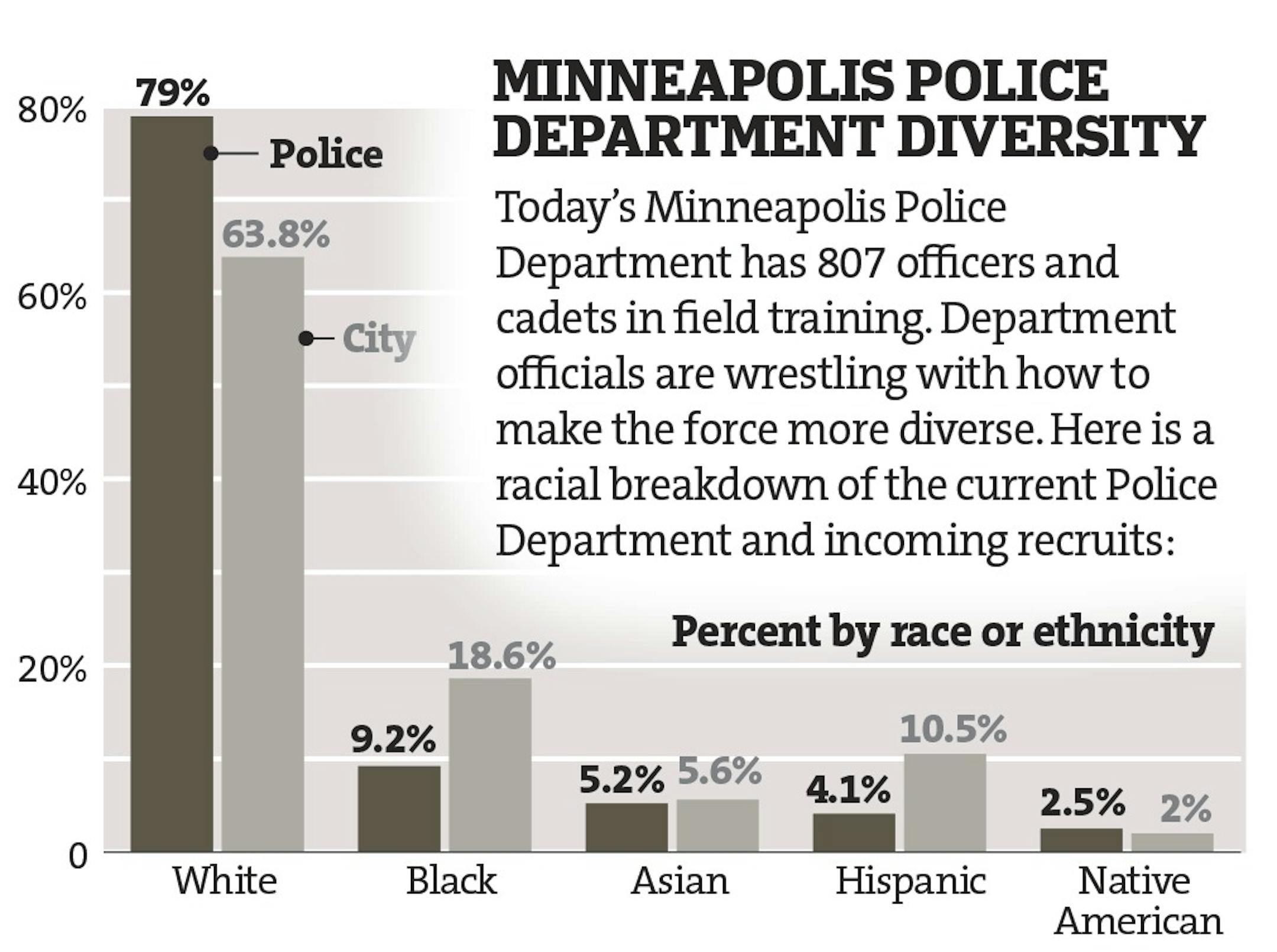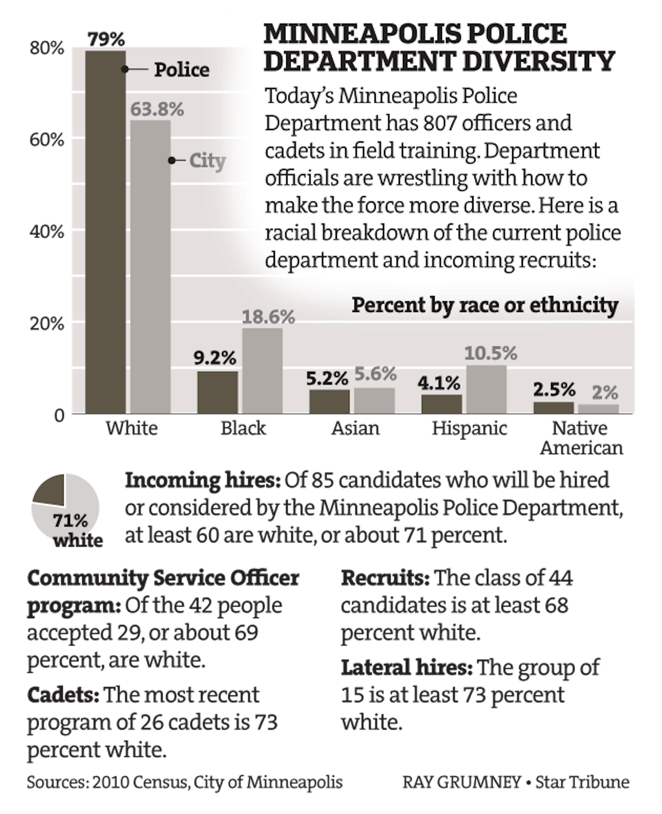 Today's Minneapolis Police Department has 807 officers and cadets in field training. Department officials are wrestling with how to make the force more diverse. Here is a racial breakdown of the current police department and incoming recruits: