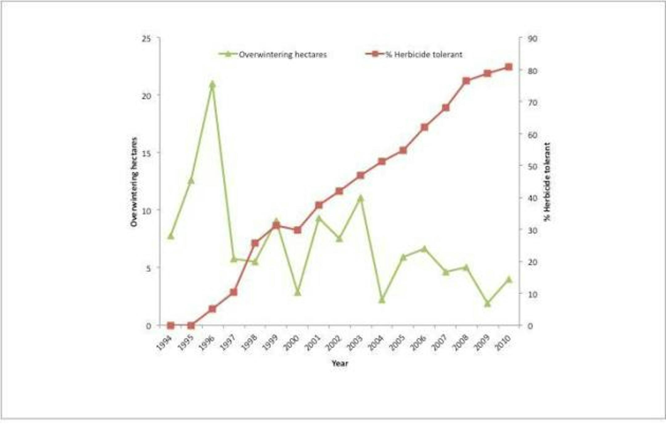 The green line is monarchs -- the red is the percent of farms planted with herbicide tolerant seeds.