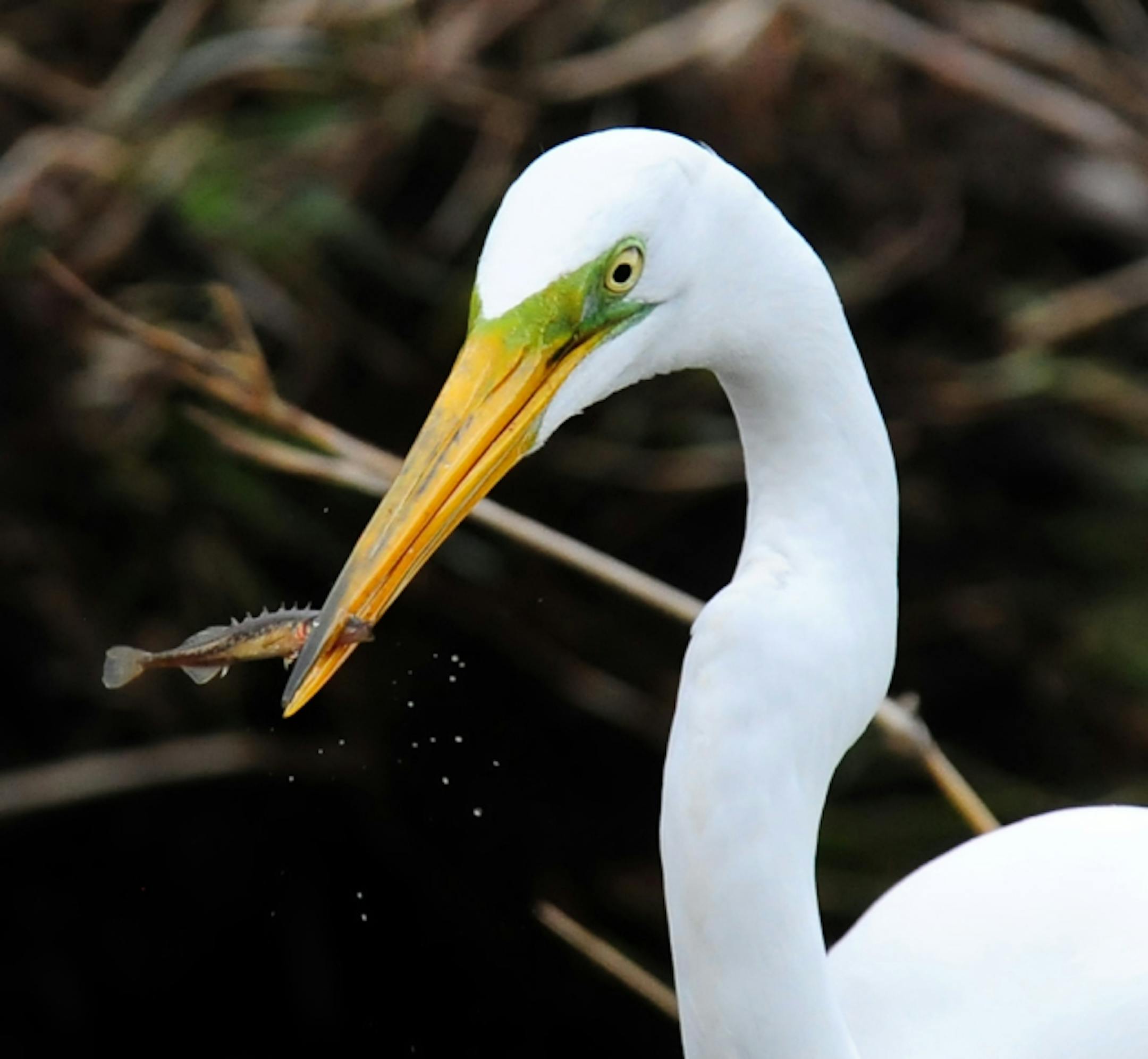 Great Egrets are seen daily in a pasture near our home. The bit of land has a small stream running through it, offering good hunting for the birds, and surprising me when this strictly seasonal flow holds fish. An entire egret is an imposing sight. Close looks at egret parts give emphasis to that. Here are egrets feted, toes well armed, and legs, the latter seemingly wrapped in leather like the steering wheel of an expensive car. And the egret's hunting weapon, testimony to weapon and skill. The fish is a stickleback, a common, small Minnesota fish.