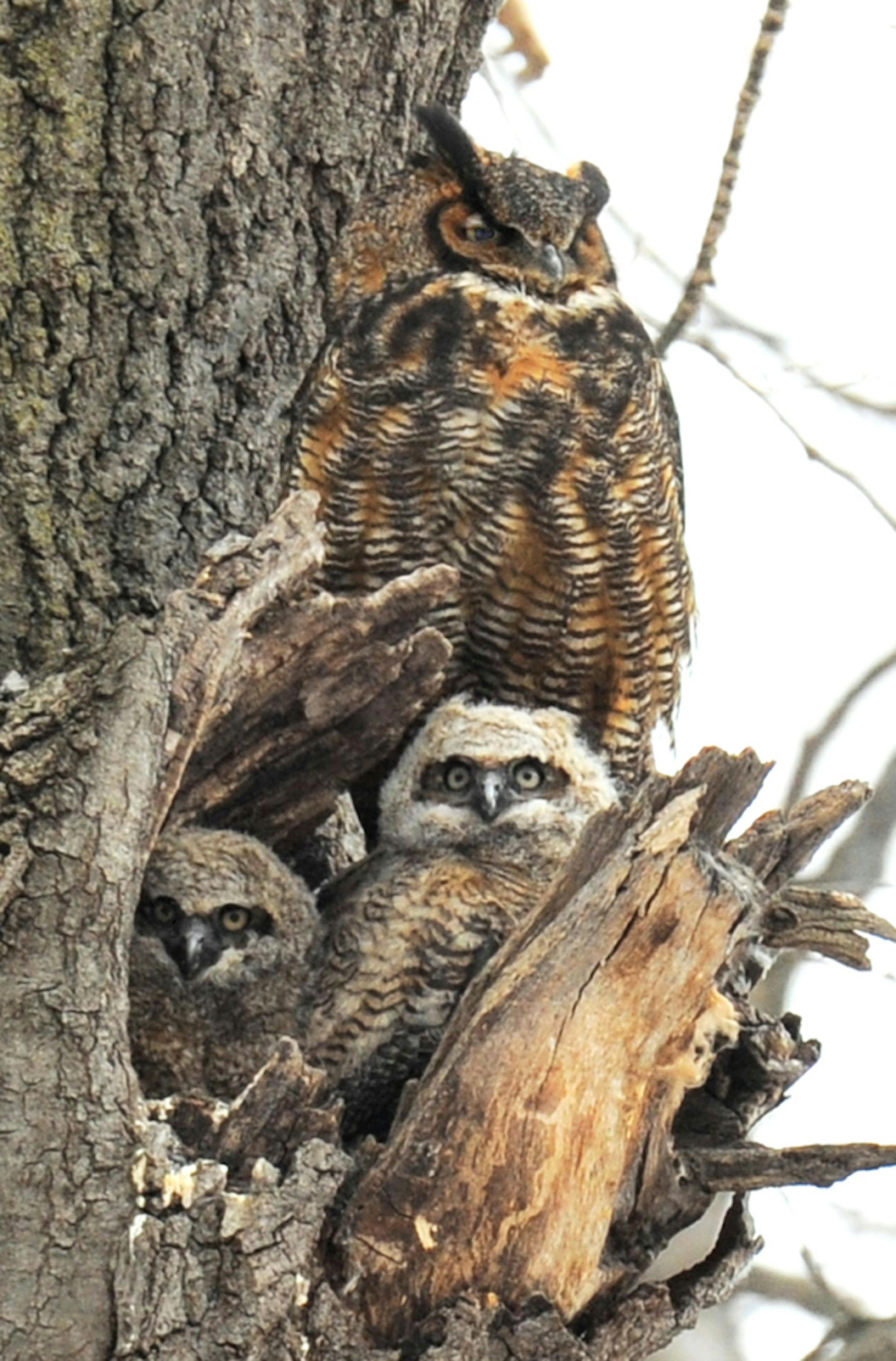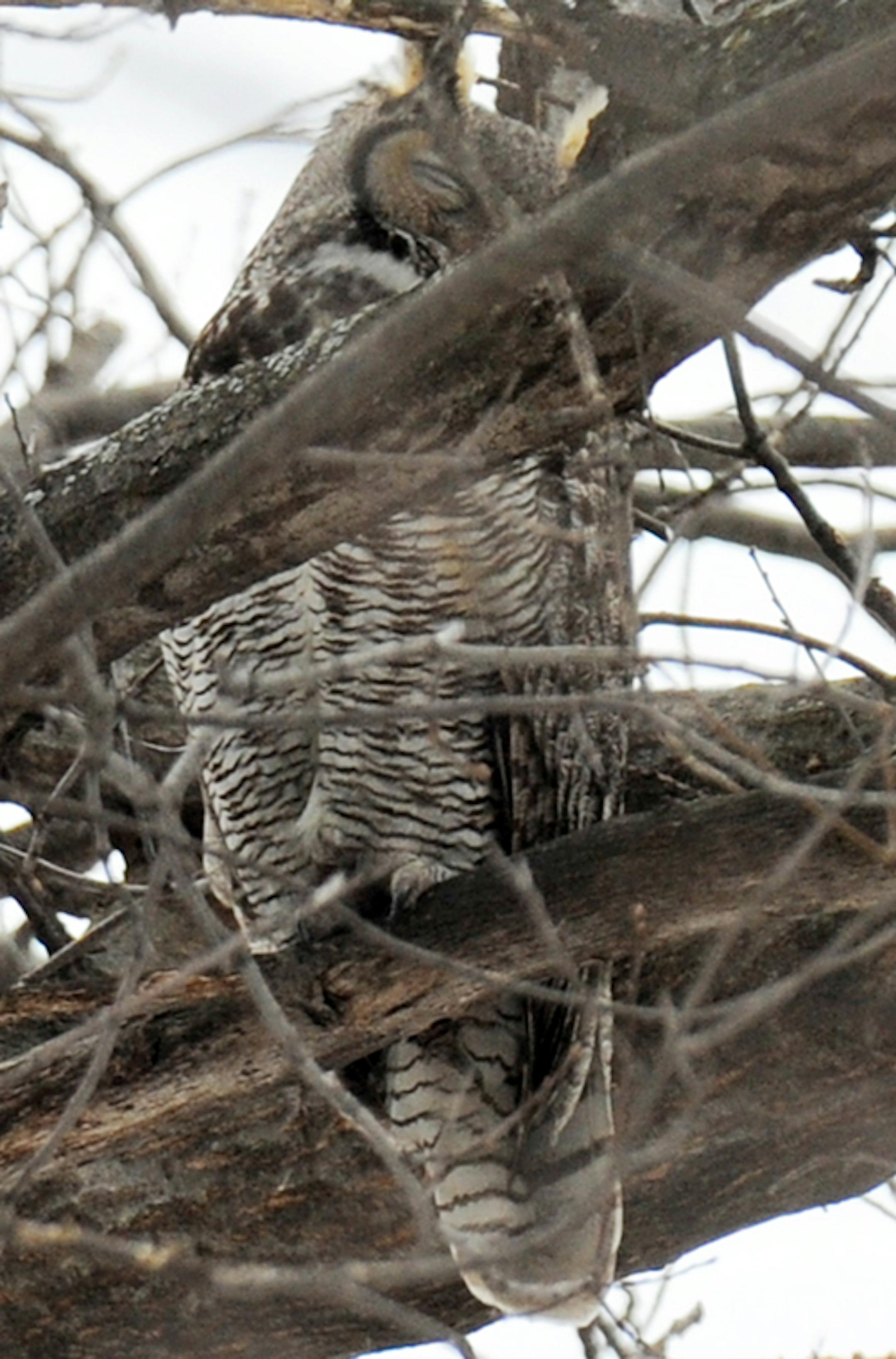 A Great Horned Owl nest holding the hen and two chicks can easily be seen at Silverwood Park in St. Anthony. (Park personnel have established a limit to approach to prevent disturbing the birds.) The hen and her chicks are nesting in the hollow of a broken branch in a large tree very close to a paved walking path, about 30 feet up. Visitors should have no problem locating the birds. Just look for the photographers, ever-present at this unusual viewing opportunity. The young owls appear to be about six weeks old. The male owl often can be seen perched, sound asleep, high in a nearby tree. That bird, as you can see from the photo below (not a very cooperative bird) is much lighter than its mate. Coloration of this species is highly variable. This female has typical adult coloration. The male tends more toward the lighter birds found most often far north. Great Horned Owls can be so light as to resemble Snowy Owls. This one is far from that, but interesting nonetheless. The owls should be visible for several more weeks. Once the young birds leave the nest they often remain in its vicinity. To find them, drive to the park's most distant parking lot. There is a paved walkway leading between two park buildings. Follow that pathway approximately 200 yards. You might also find interesting the courtship behavior of at least seven Eastern Chipmunks in a tangle of brush and fallen logs immediately to the right of the walkway from the best owl-viewing spot. Friday, they were chasing each other incessantly. The chipmunks are very obvious right under the eye of the female owl. The male owl, the family's provider, sleeps during the day, hunting at night. Perhaps that explains the mammals' apparent daytime nonchalance.