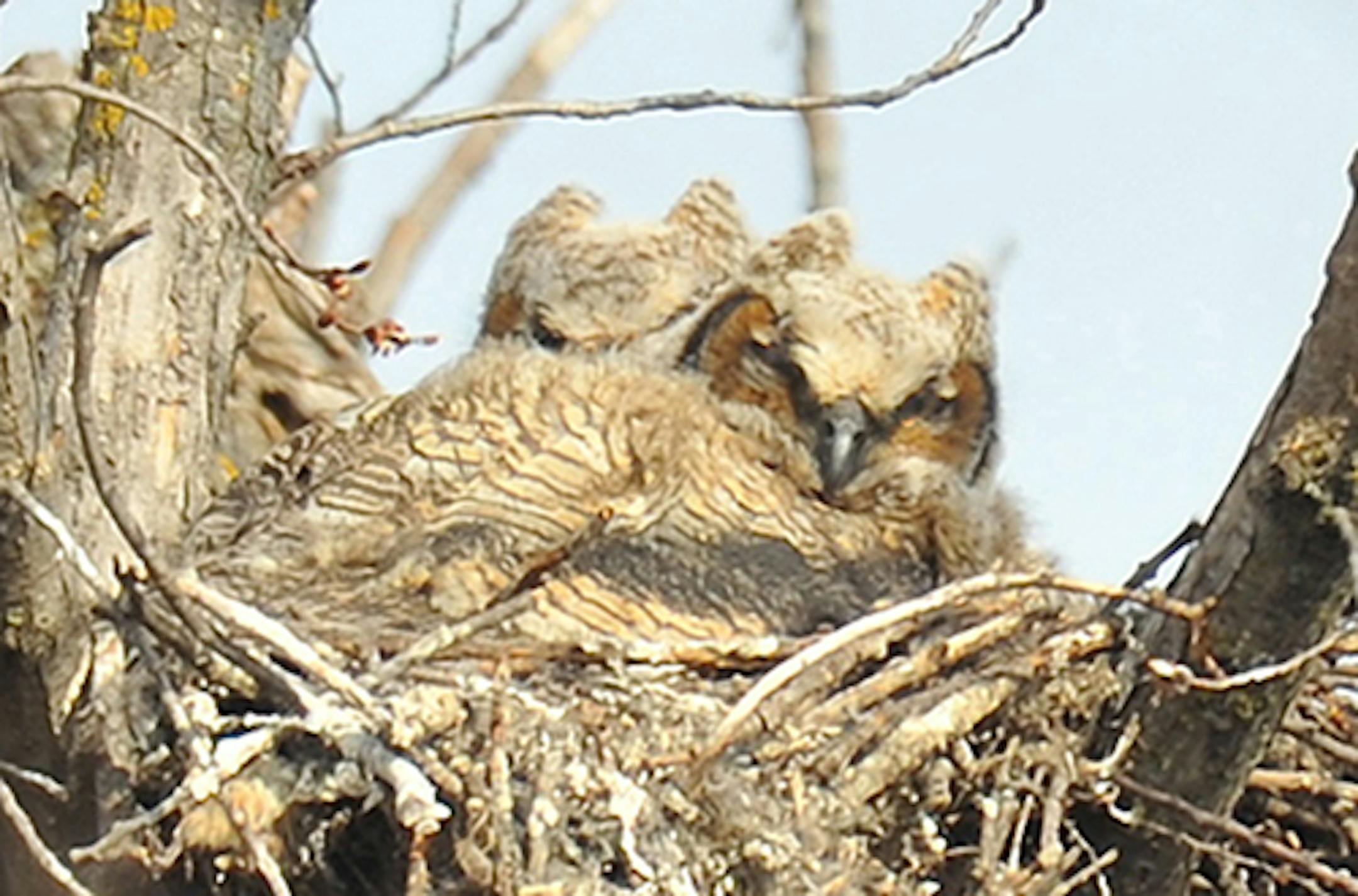 The Great Horned Owl chicks in the nest near our Orono home are growing up. They've lost the chick fuzz. I don't know the date of hatching, but from the looks of them they could begin climbing around their tree in a couple of weeks. They move in and out of the nest before they fly.