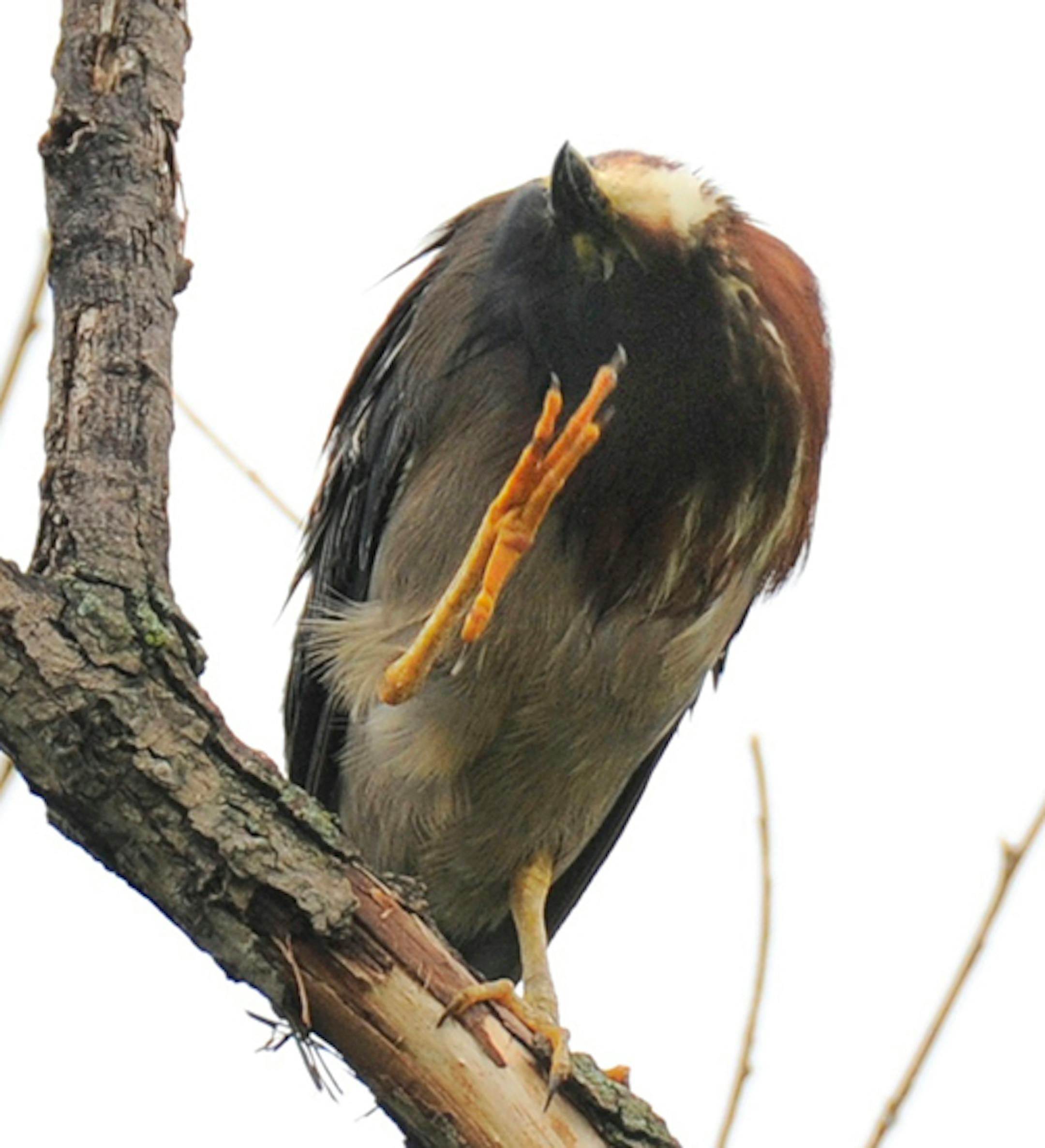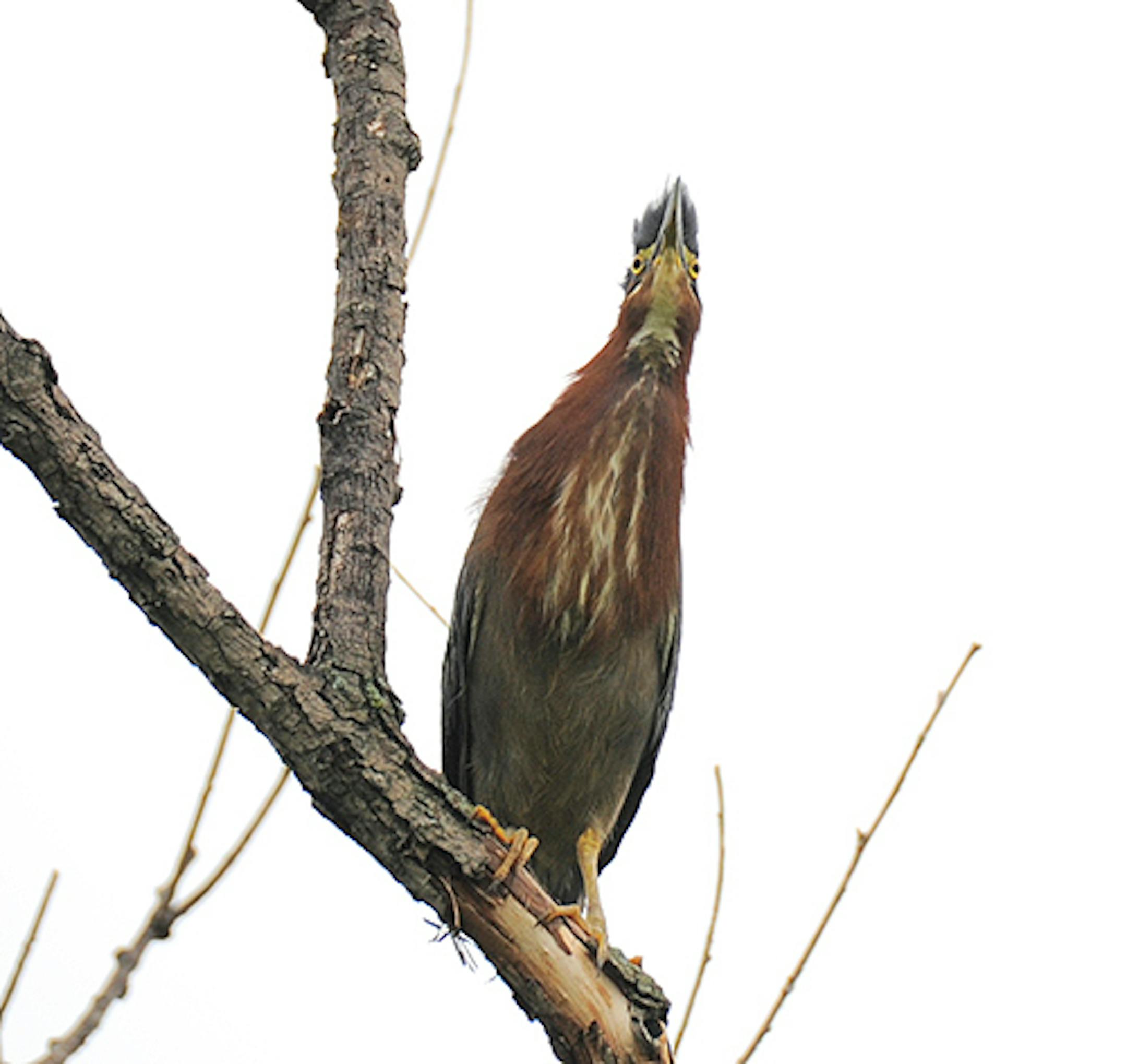 This Green Heron was quietly grooming itself when it suddenly went alert. It focused hard on something behind me. Then it left in a rush, flying not to a another tree or the adjacent marsh. It flew out of sight. What was its problem? A small flock of swallows, Barn and Tree mixed, swooped in to chase the heron for maybe 100 yards. They quit the chase. The heron kept going. Any large dark bird probably gets that treatment, seen as a possible threat to nests and baby birds. Crows and raptors certainly deserve that concern. Green Herons are innocent, however, birds and eggs not listed as part of their diets.