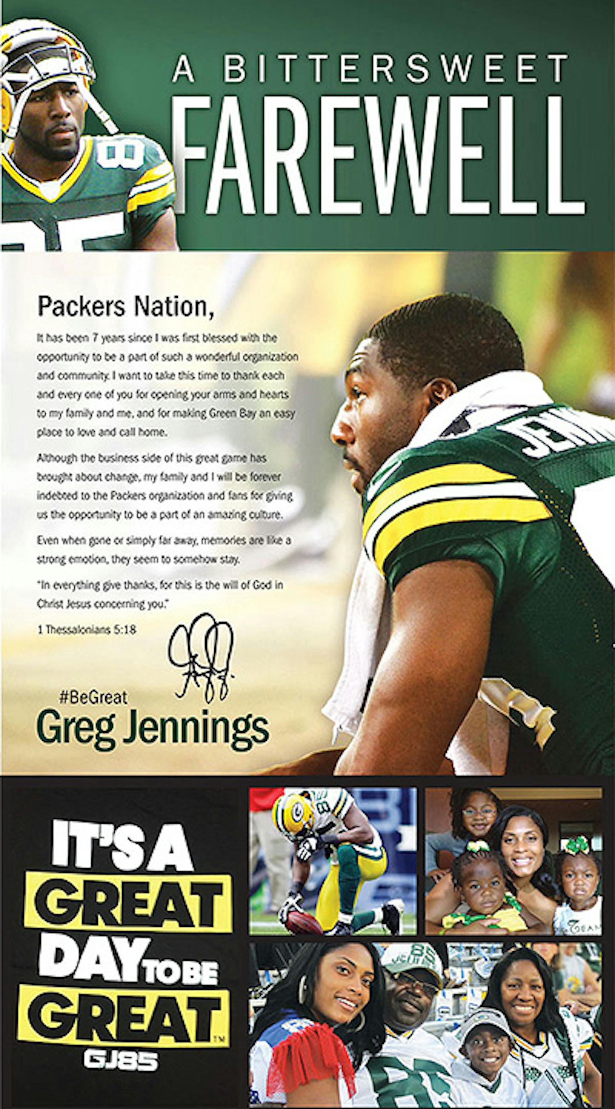 New Vikings wide receiver Greg Jennings took out a full-page ad in the Milwaukee Journal-Sentinel newspaper Wednesday to thank fans for supporting him during his seven years with the Green Bay Packers.
