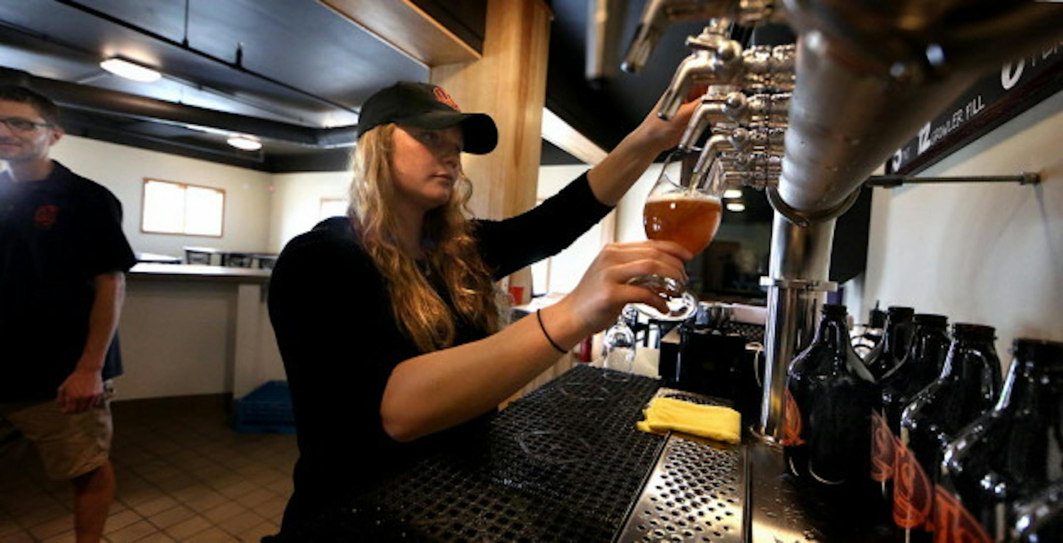 Photo: Tap room manager Carissa Darcy poured a beer, while attendant Ted Jedlicki looked on at LTS Brewing tap room in Rochester. Credit: JIM GEHRZ, STAR TRIBUNE.