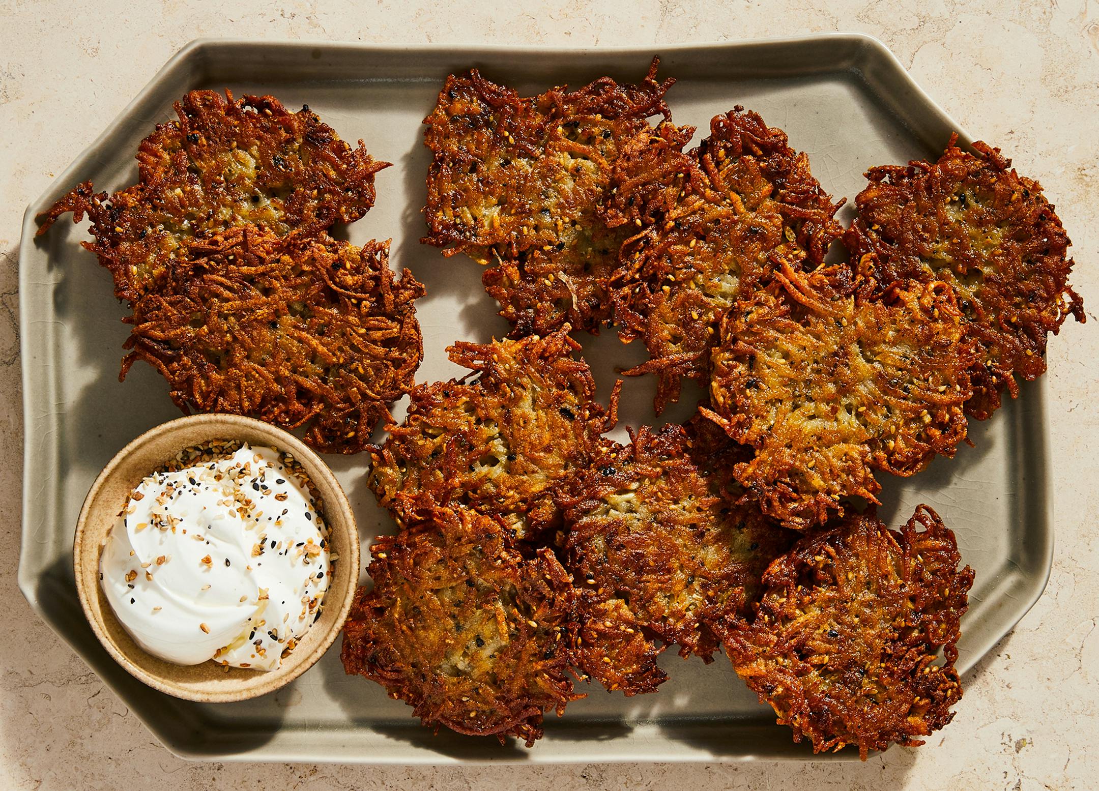 As holiday fare, latkes are a food meant to be shared with loved ones, best eaten with a big dollop of sour cream and preferably within minutes of lifting them out of the bubbling oil. Which got me thinking — I might not be able to celebrate the season with an everything bagel for dinner, but I could certainly enjoy a big plate of everything bagel latkes after lighting the Hanukkah menorah. Indeed, bagels with cream cheese and latkes with sour cream have a lot in common: They’re both starchy, crispy, a little oniony and topped with something cool and creamy.