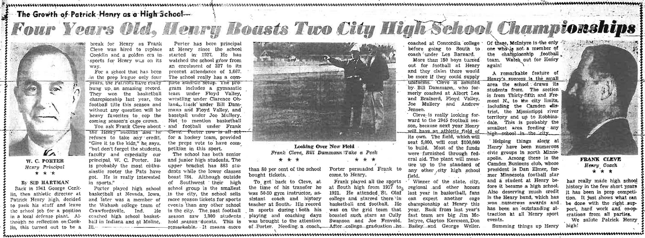 Cullum had Hartman, who was 24, start working on the Times' copy desk with occasional reporting duties. On Oct. 28, 1944, Hartman's byline appeared for the first time, on a Times story about the growth of sports at Minneapolis Patrick Henry high school, which had opened four years earlier.