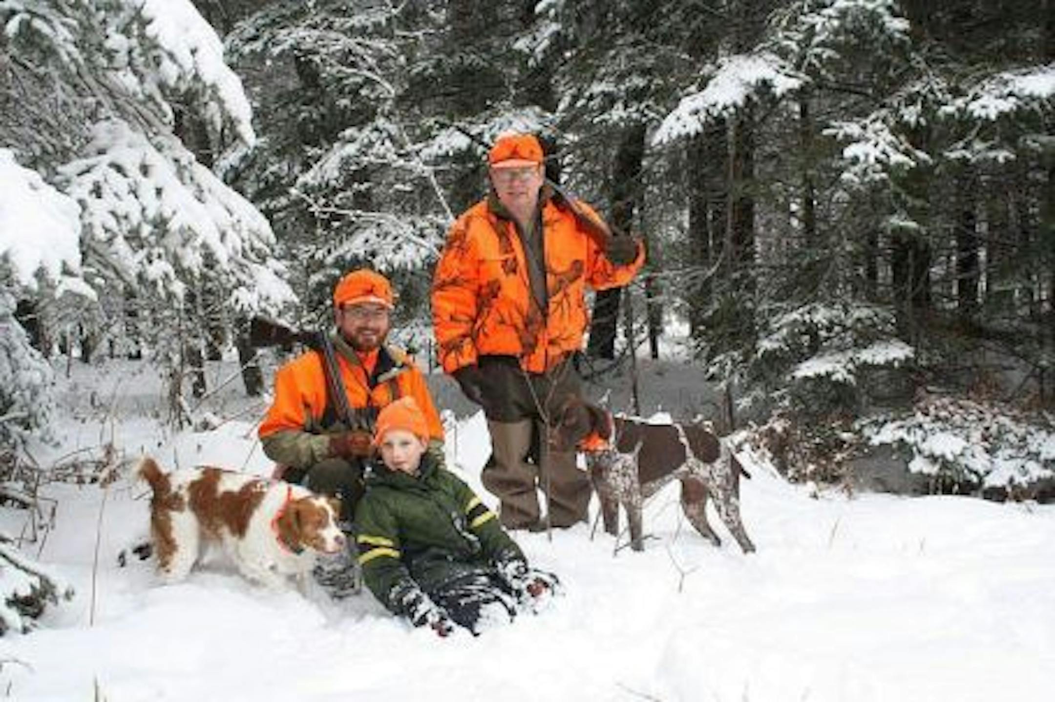 The author, nephew Nicholas, and author's father pose for a winter grouse hunting photo with bird dogs Bleu and Trammell.