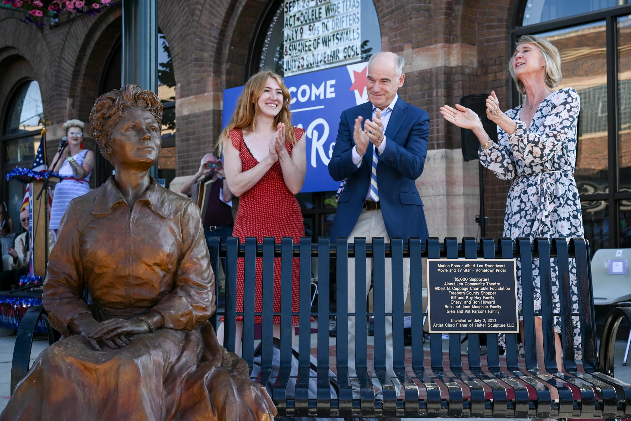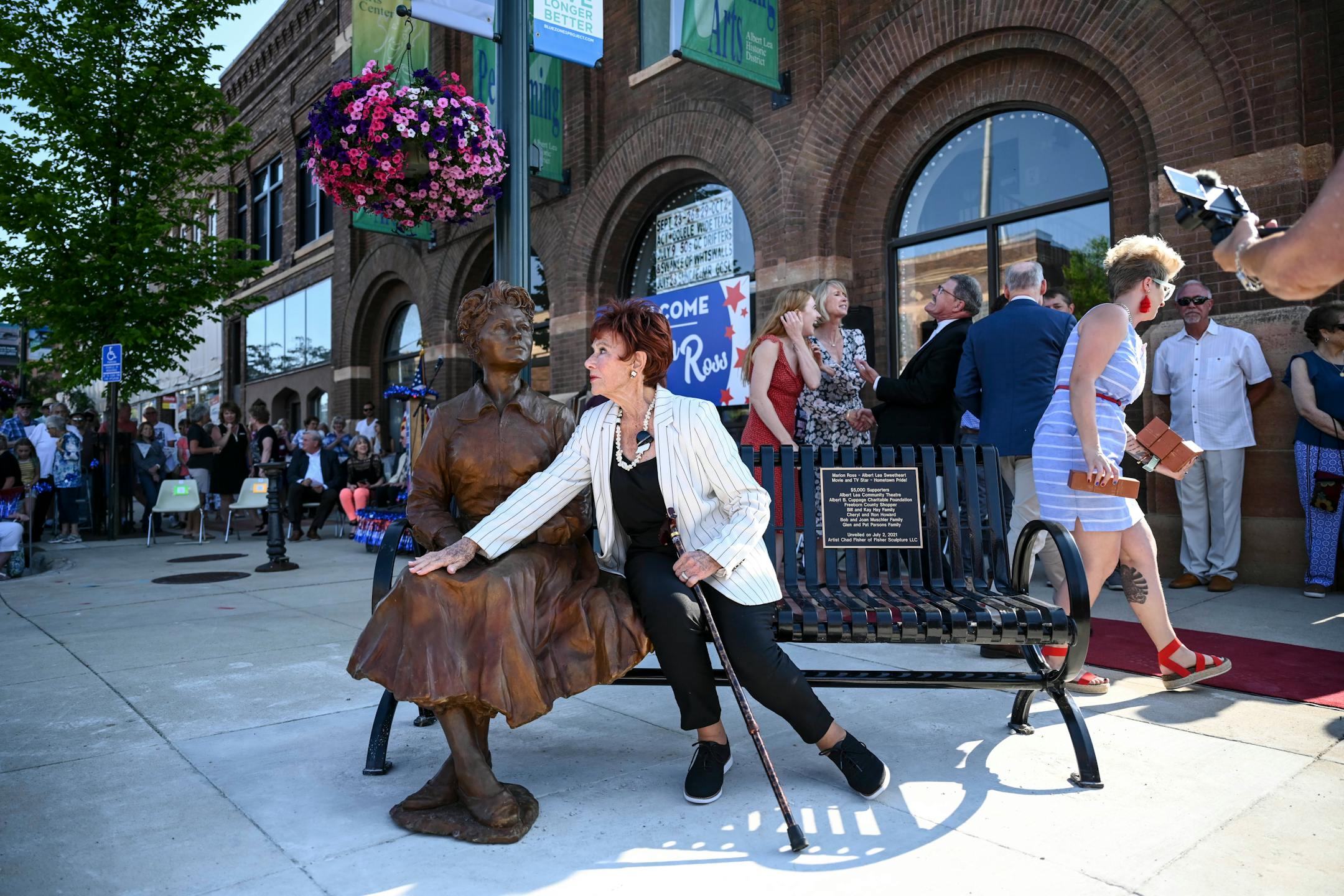 A statue of Ross sitting on a bench was unveiled Friday in one of the most visible corners downtown, just a block from Fountain Lake, where she served as a junior lifeguard.