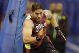 A year ago, the Vikings moved down one spot in the first round of the NFL draft to gain an additional first-round pick. That pick was used to select Notre Dame safety Harrison Smith, who — as the Bears’ Jay Cutler could attest to on this play — made a big impact on the Vikings defense as a rookie starter. (Star Tribune file/The Minnesota Star Tribune)