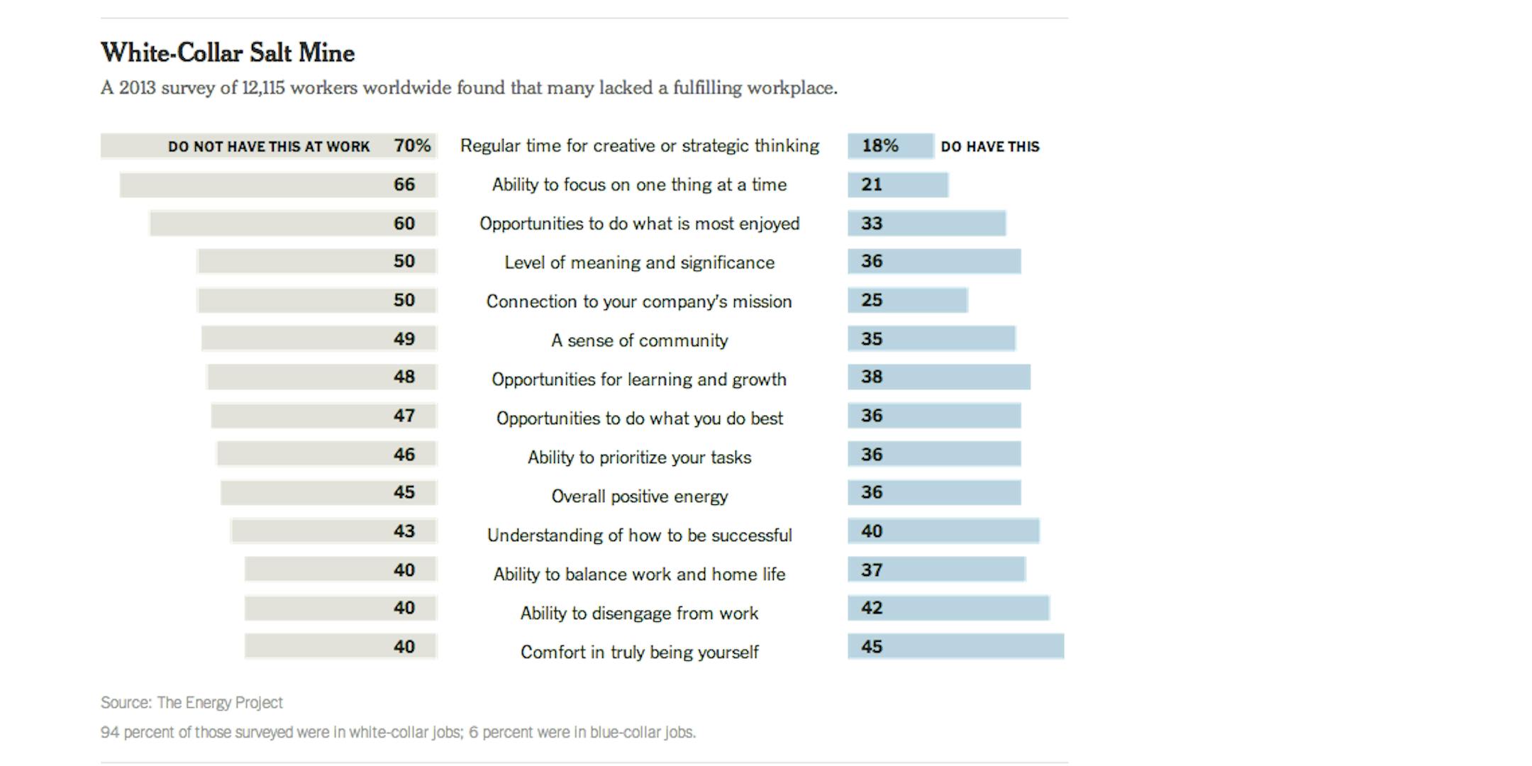 According to the Energy Project's findings, only 36 percent of America's workers feel their work is meaningful or significant. And only 25 percent are connected to their company's mission. (Caveat: The survey respondents were mostly in "white-collar" office jobs.)