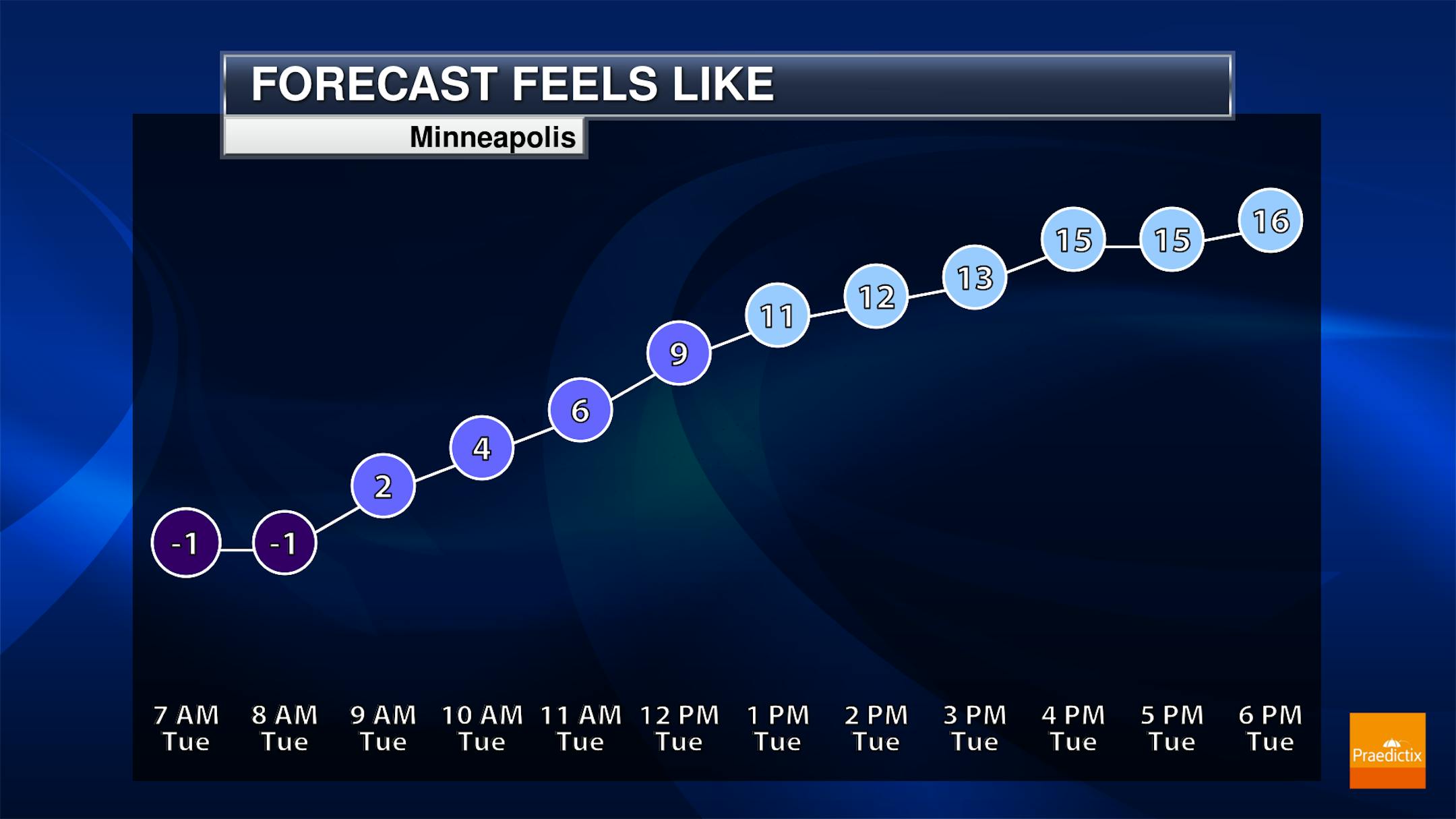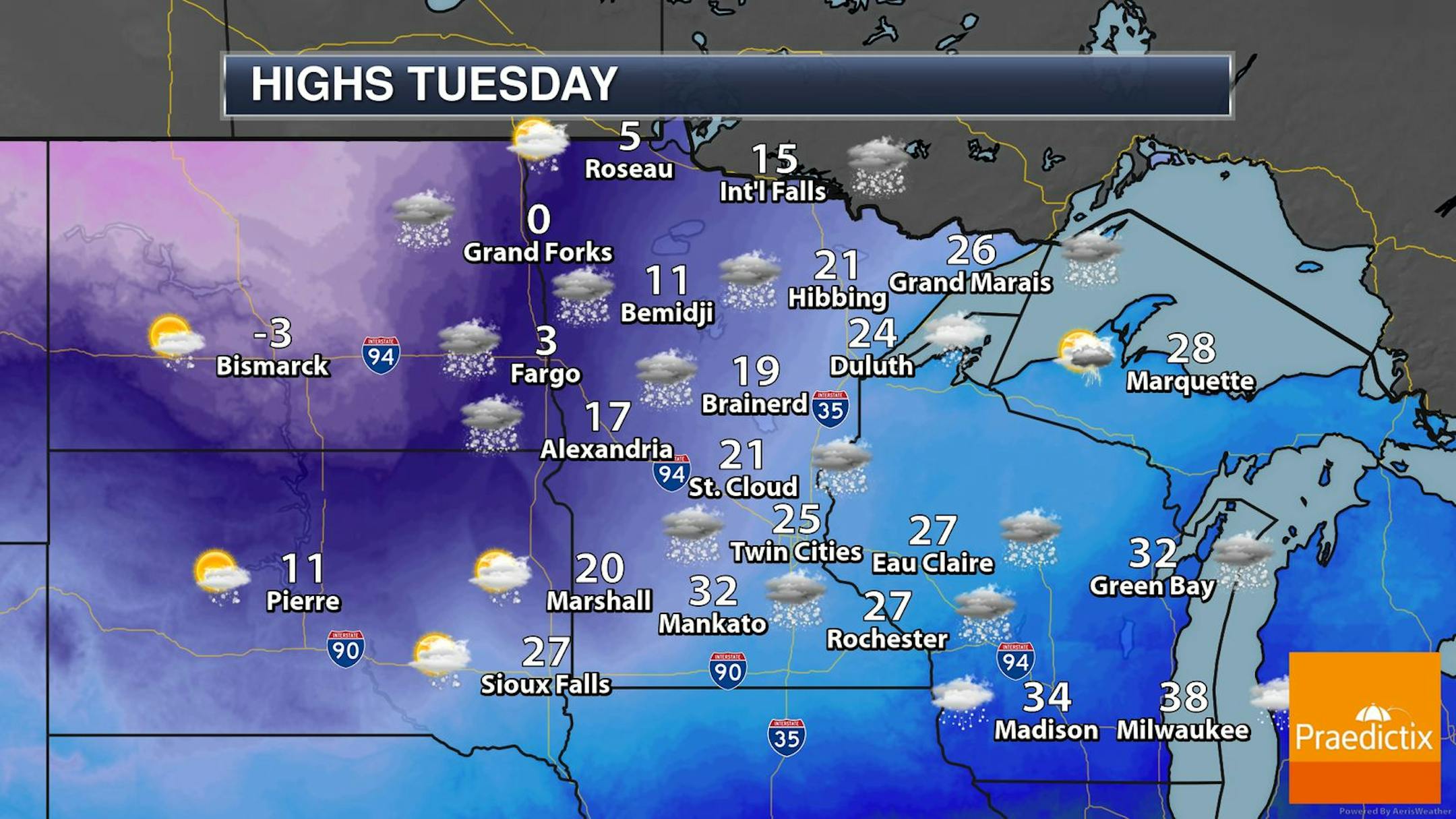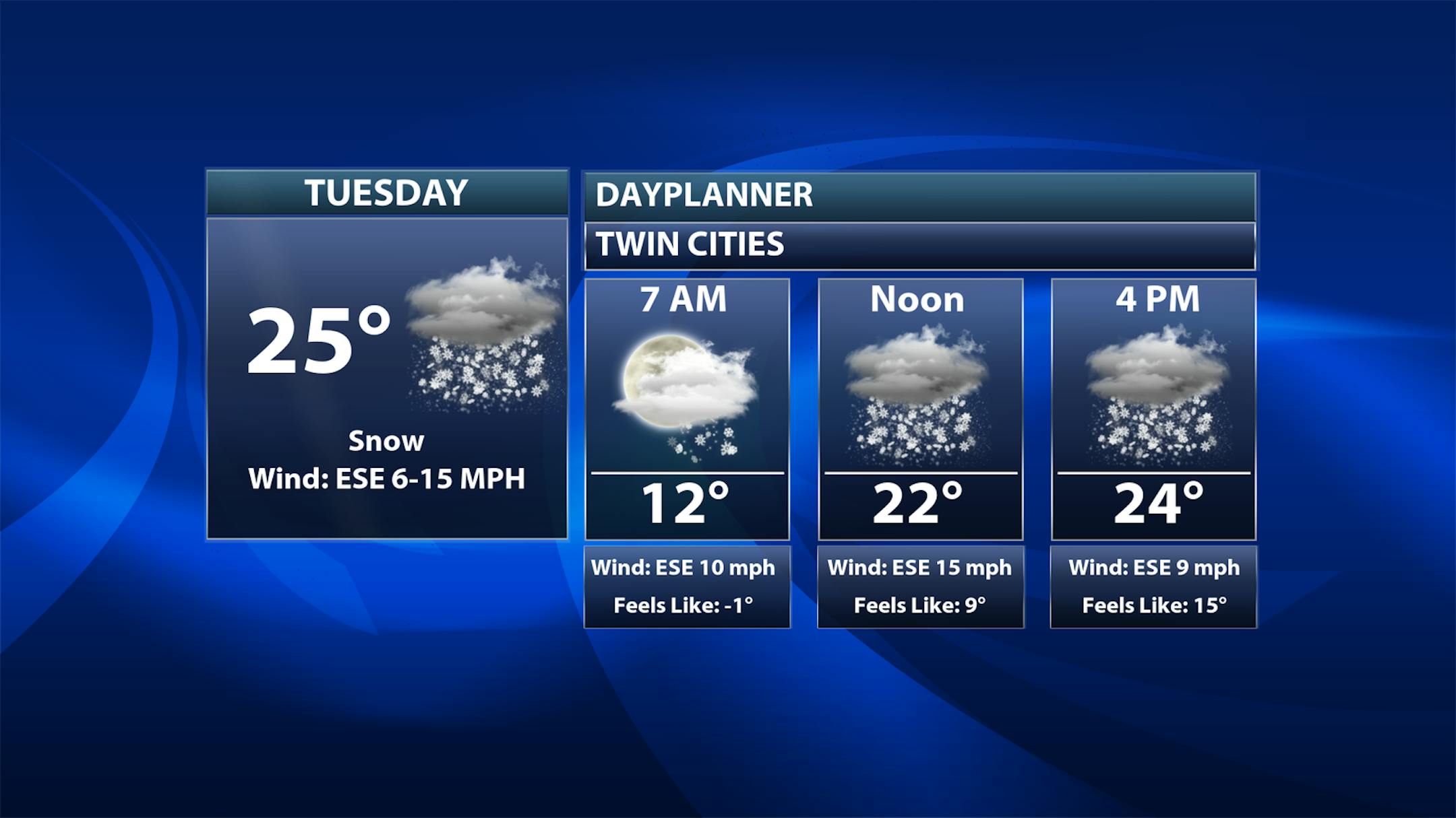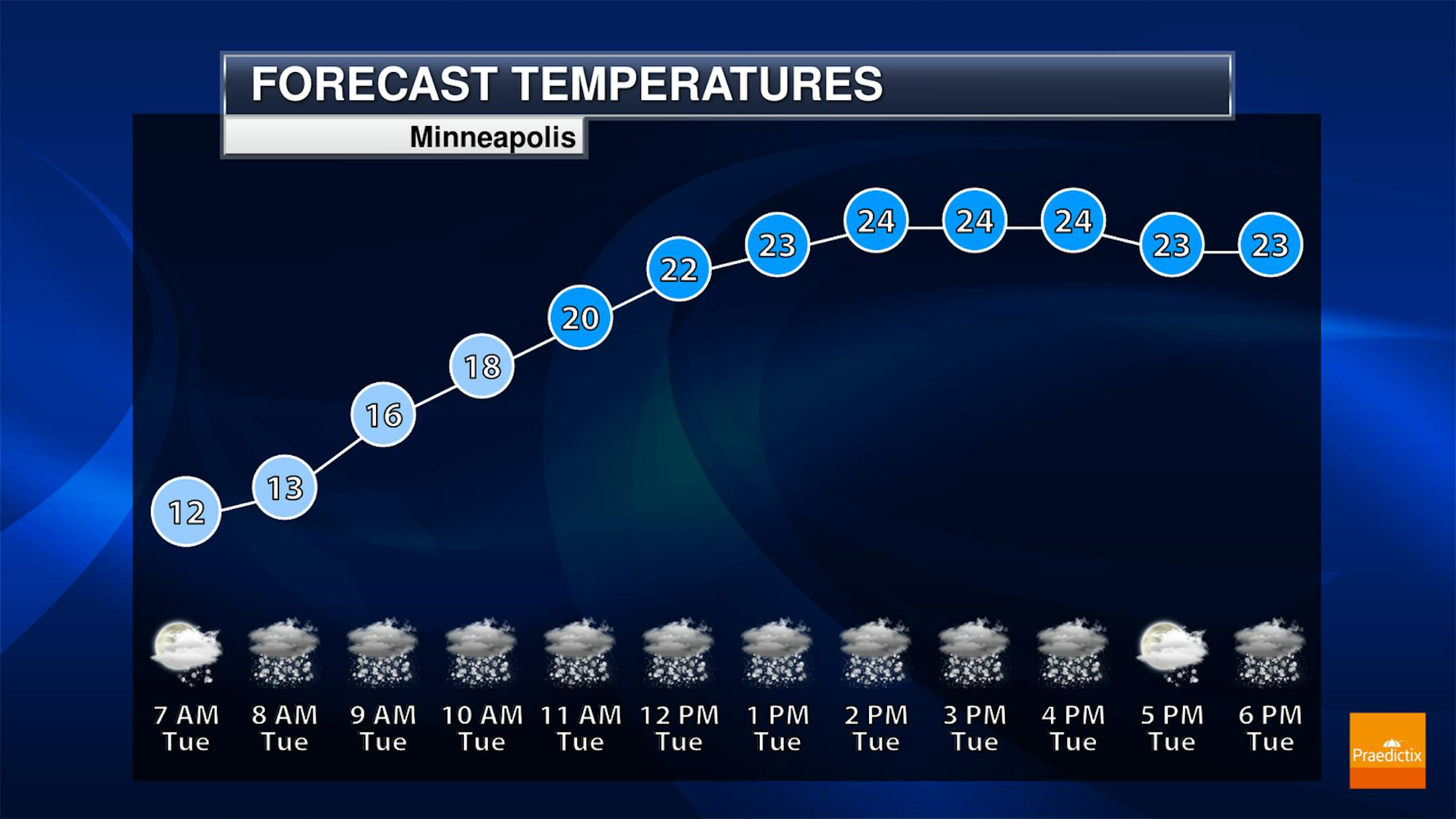 Here's the weather outlook for Minneapolis on Sunday, which shows near average temperatures for late December with highs warming into the mid 20s. Light snow will develop in the morning and continue through much of the afternoon with some 1" to 3" tallies possible by the evening.