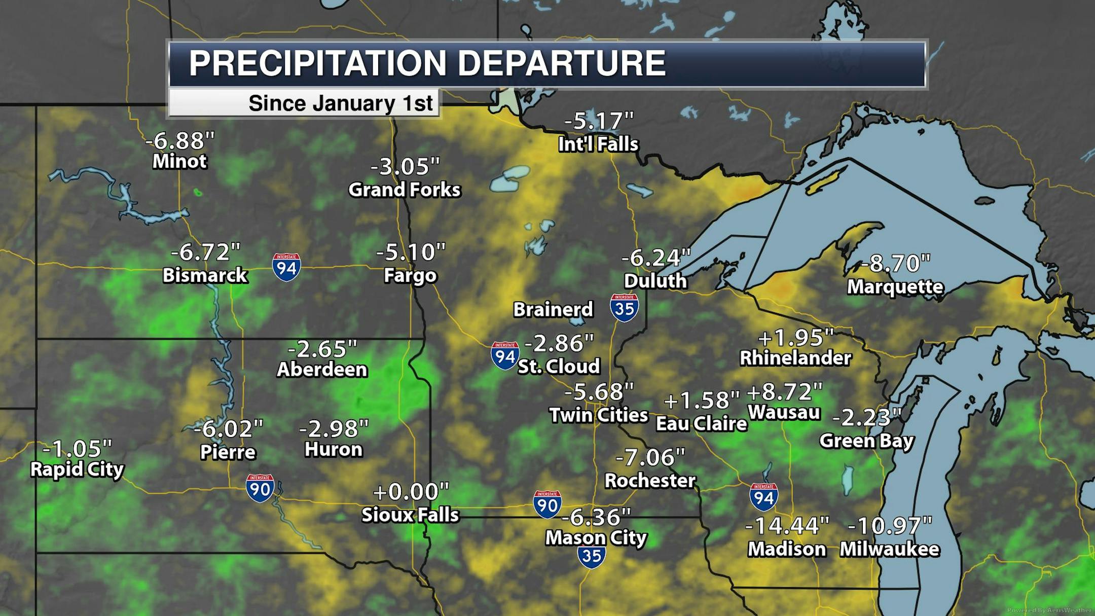 Here's a look at the precipitation departure from average since January 1st and note that most locations are still several inches below average, including the Twin Cities. The MSP Airport is still -5.68" below average since January 1st, which is the 59th driest January 1st - December 26th on record.