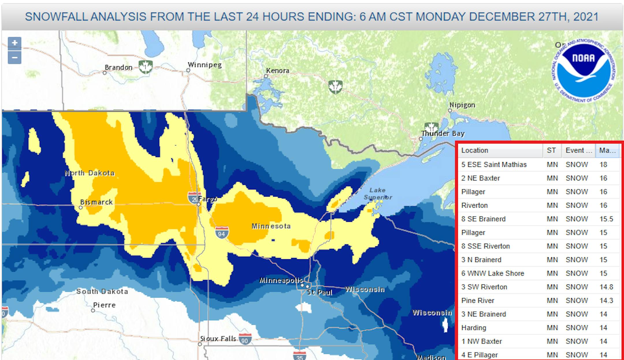 Here are the snowfall tallies from the latest storm system PM Sunday into Monday. Some of the heaviest tallies were across parts of Central Minnesota, where some 12" to 18" tallies were reported.
