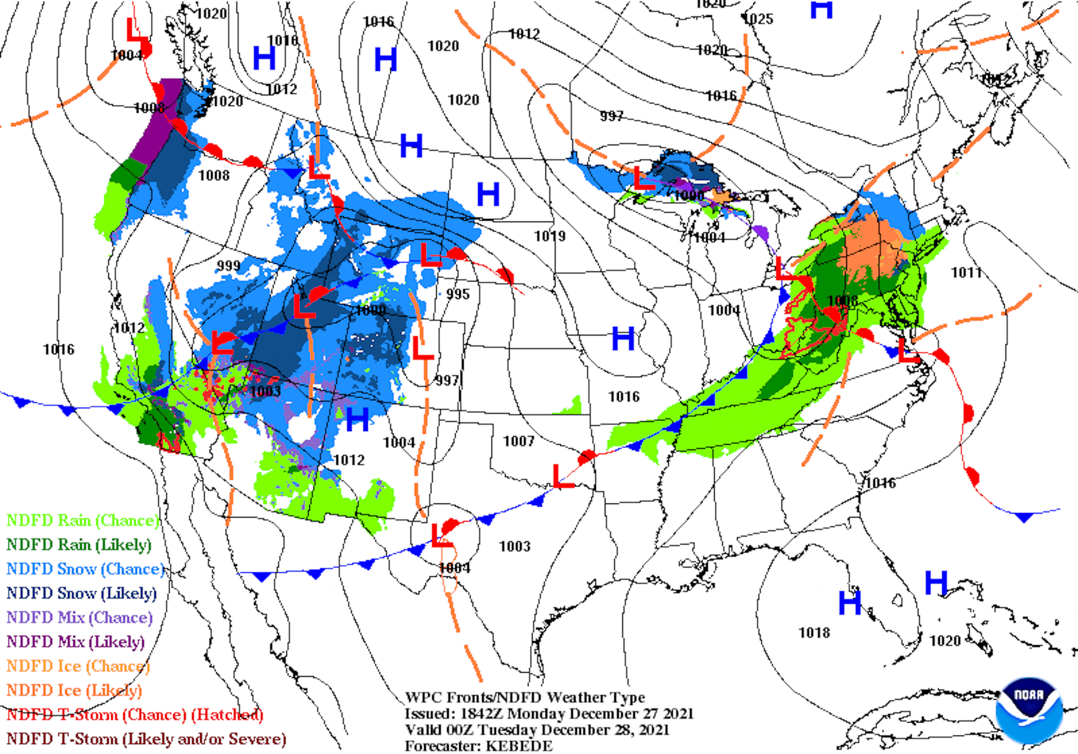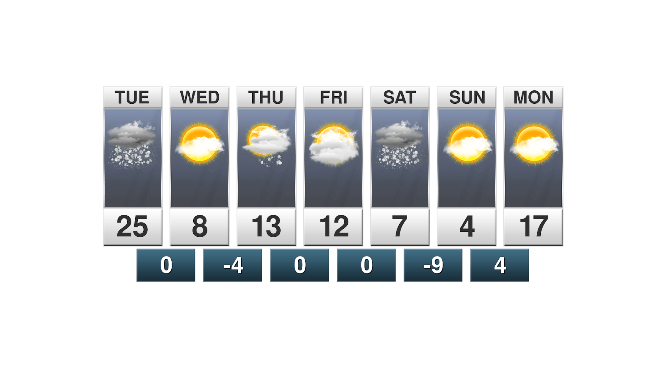 The weather outlook from AM Tuesday to AM Wednesday shows our next light snow chance moving through the region. The heaviest snow should be around midday and will fade later in the day.