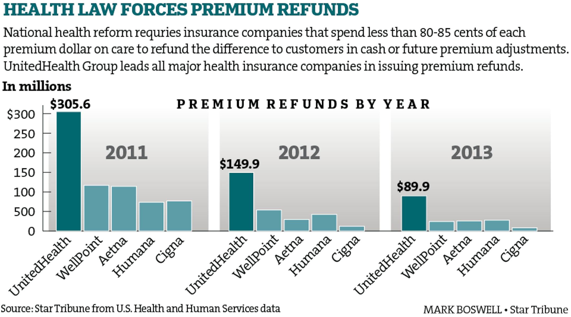 UnitedHealth Group leads all major health insurance companies in issuing premium refunds. Here's a look at what the various companies had to pay out in refunds for the last three available years.