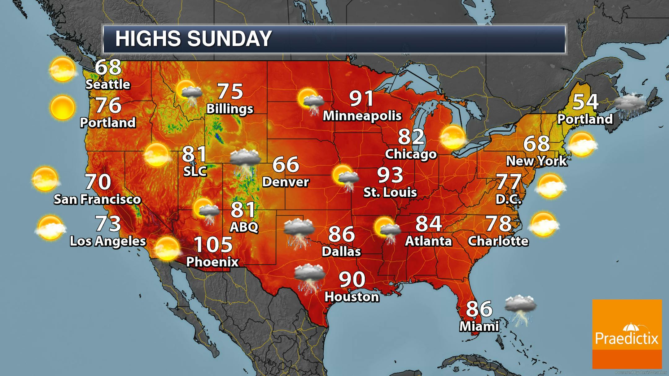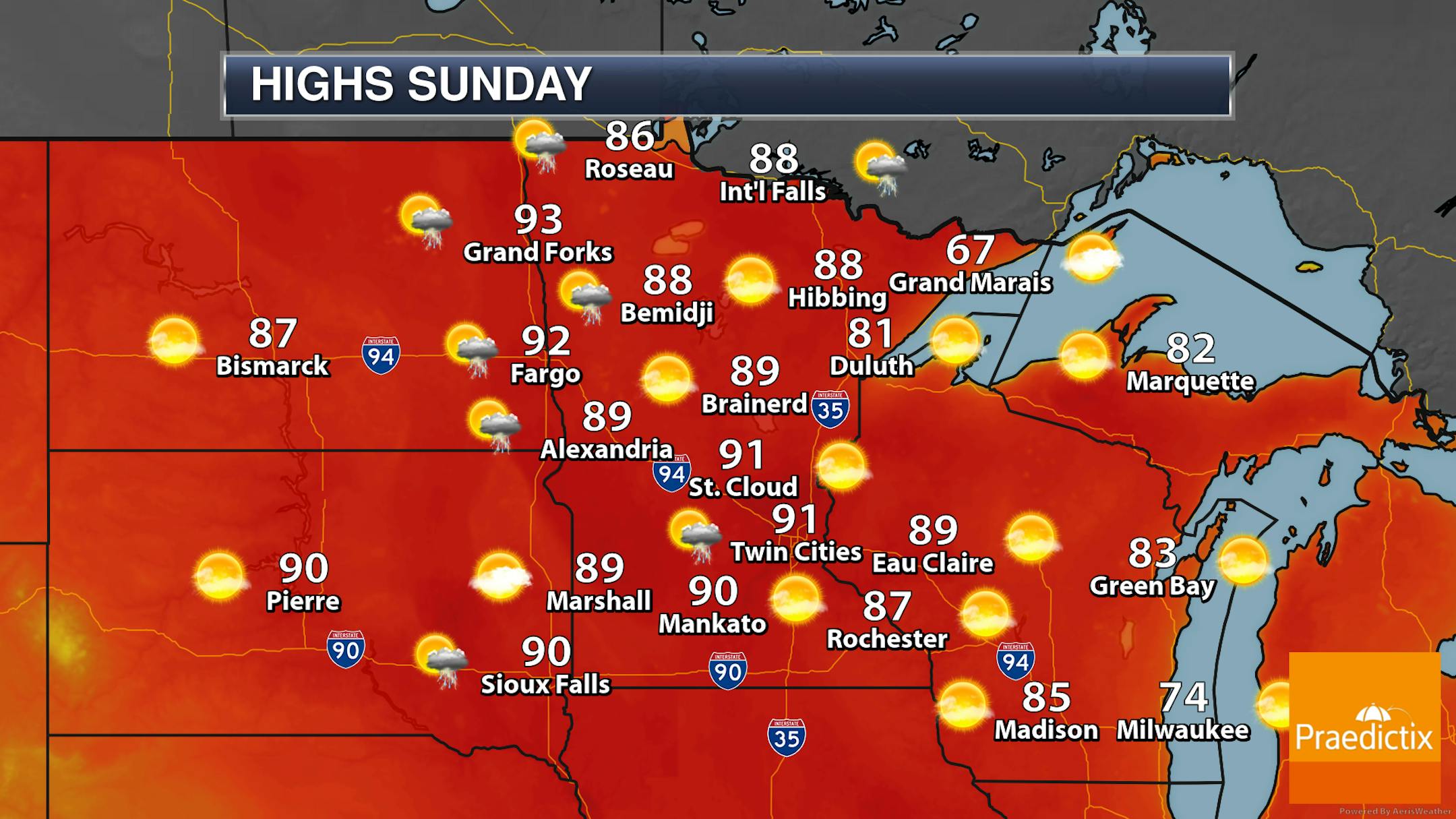 There will be a better chance of some rain up toward the Canadian border on Sunday as a cold front starts to approach. Otherwise, a mix of sun and clouds to mainly sunny skies are expected with highs mostly in the 80s and low 90s. The coolest weather will be close to the Lake Superior shore, where highs will stick in the 60s and 70s.