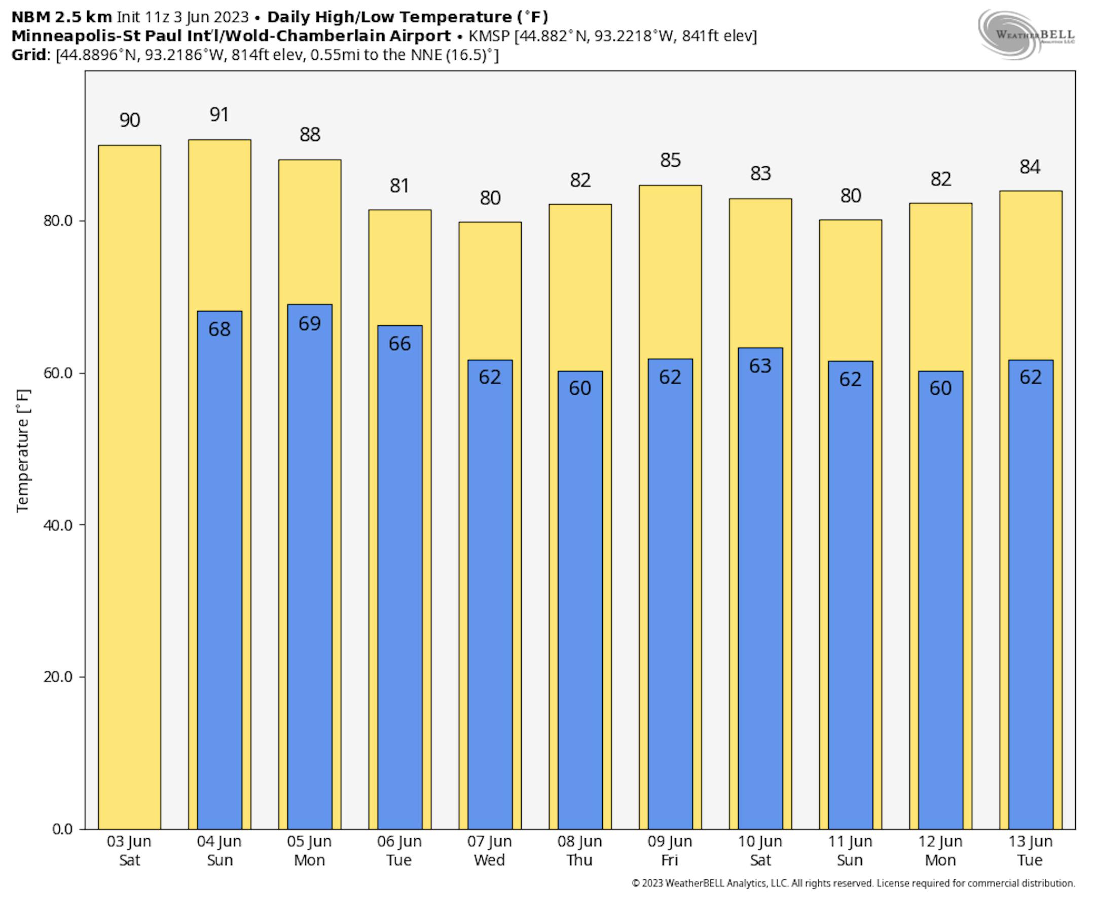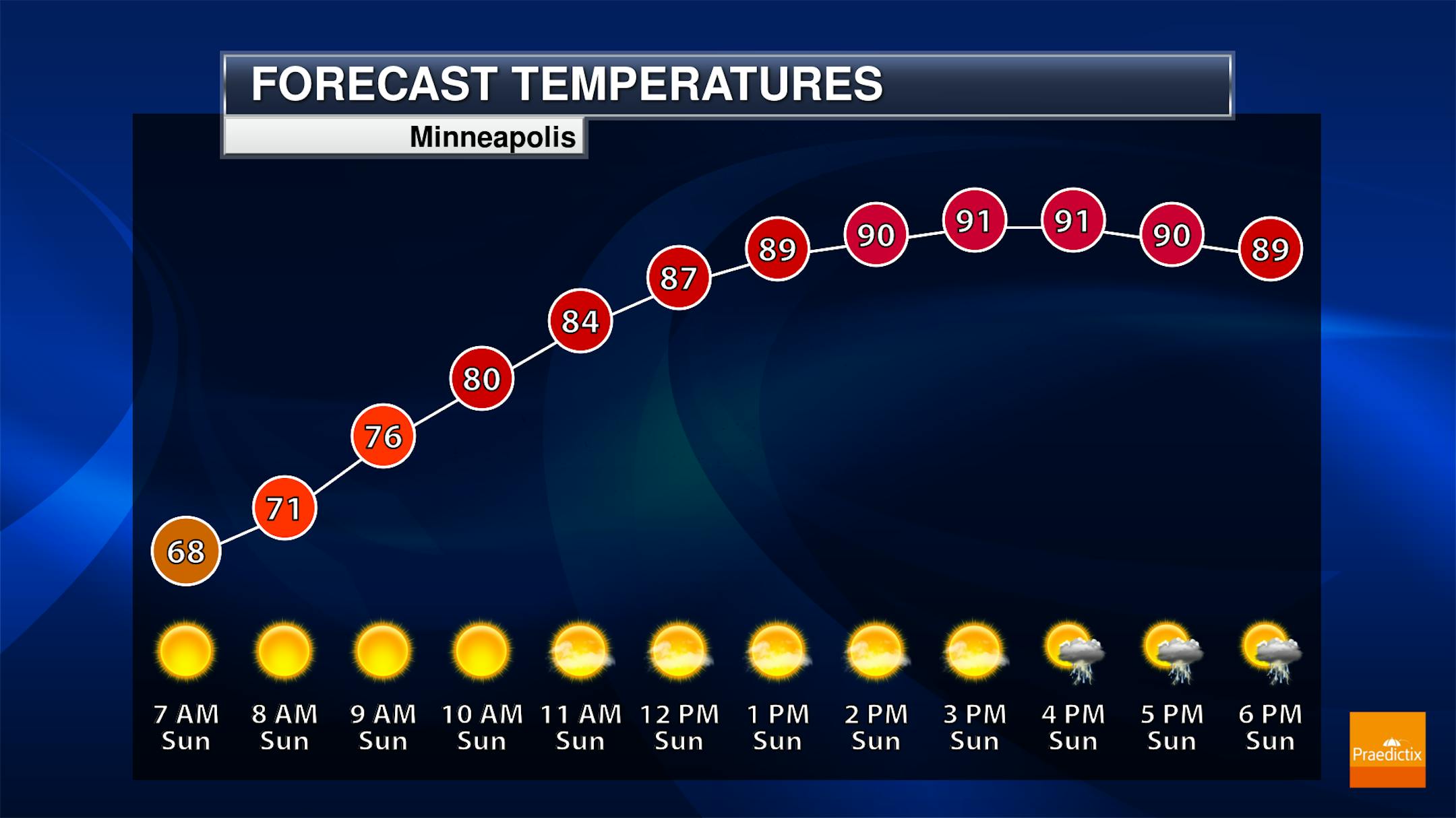 Another hot and mainly sunny day is expected Sunday here in the Twin Cities, with morning lows in the upper 60s and highs climbing into the low 90s. An isolated shower or storm can't be ruled out in the afternoon, but I think chances are very slight here in the metro.