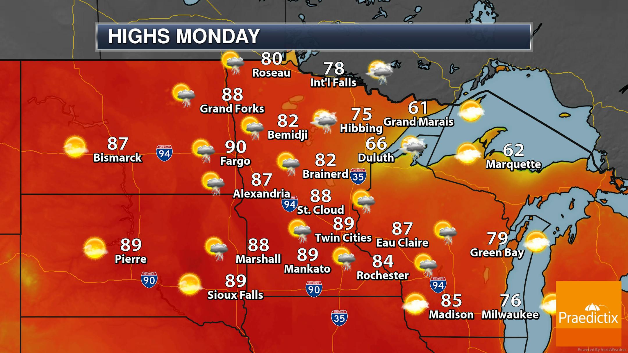 As we head into Monday, we're watching a backdoor cold front moving across the state that'll bring in some cooler air as well as some better chances of rain across the region. You can see that cooler air working into northern Minnesota, with highs in the 70s expected up north. Highs will still be in the mid to upper 80s across the southern half of the state, as the cold front doesn't reach these areas until later in the day.