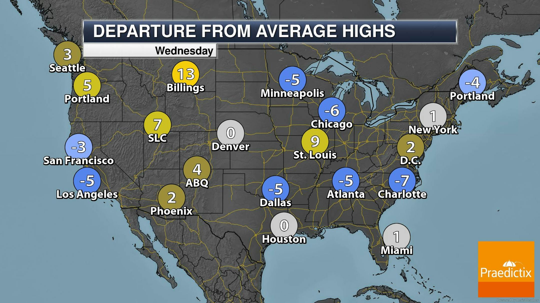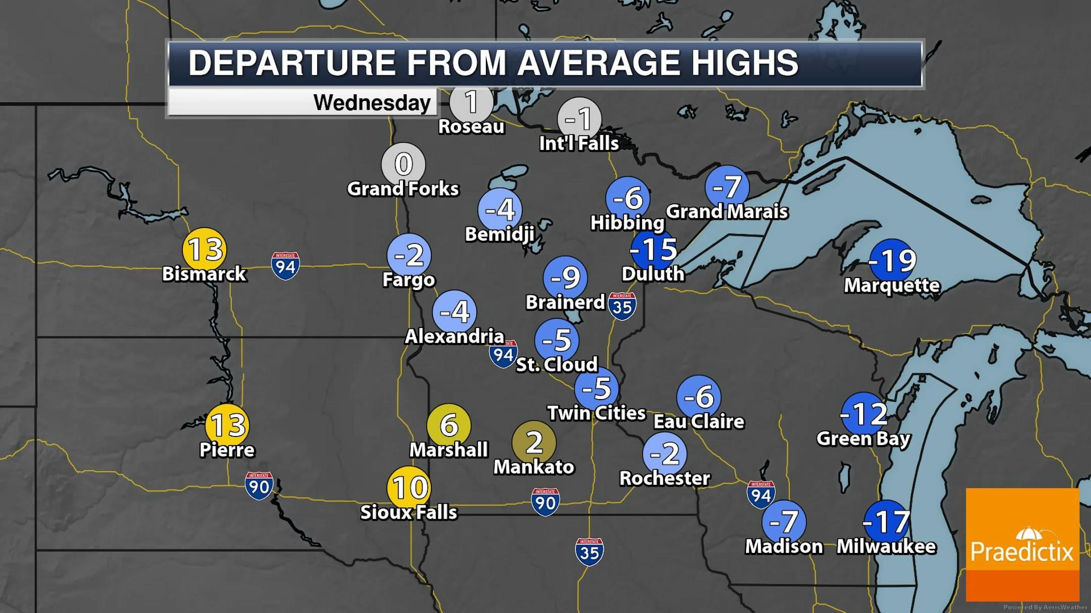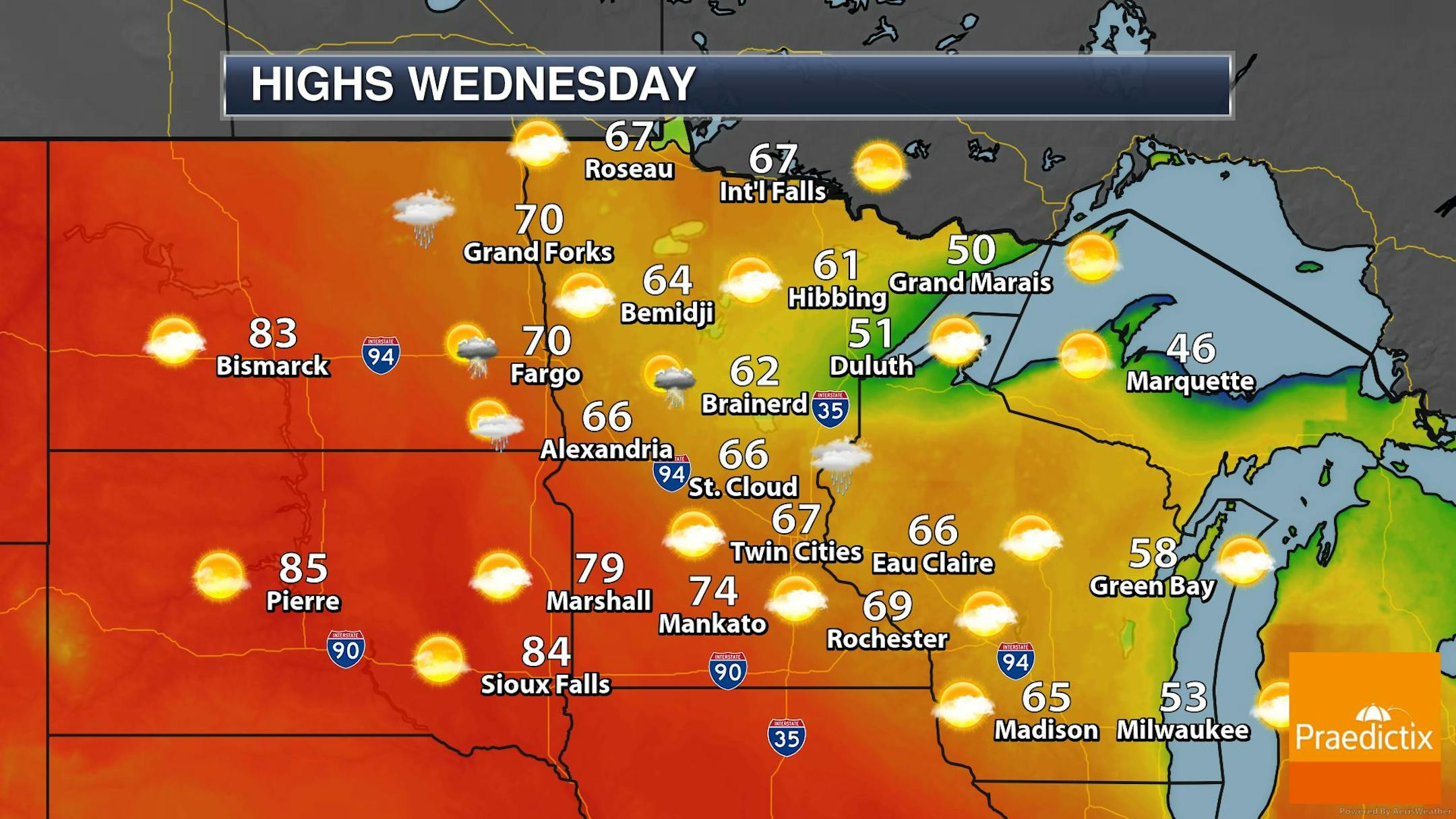 Temps on Wednesday will be nearly +10F to +15F above average across the Dakotas with highs warming mainly into the 80s, which is more like mid-June standards. However, readings north and east of the Twin Cities will be quite a bit below average with a wind off of Lake Superior.