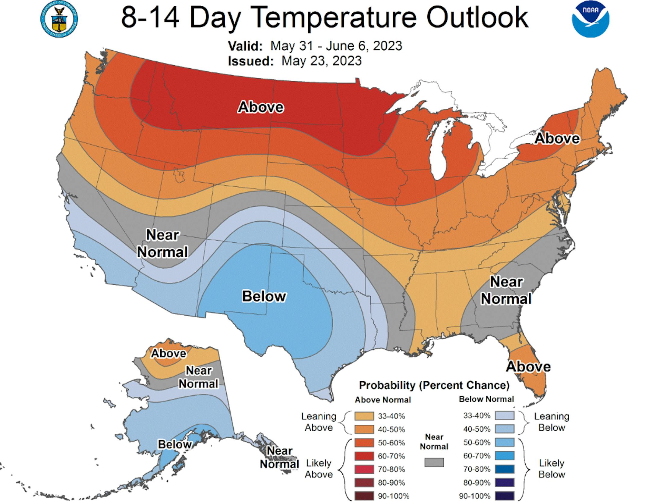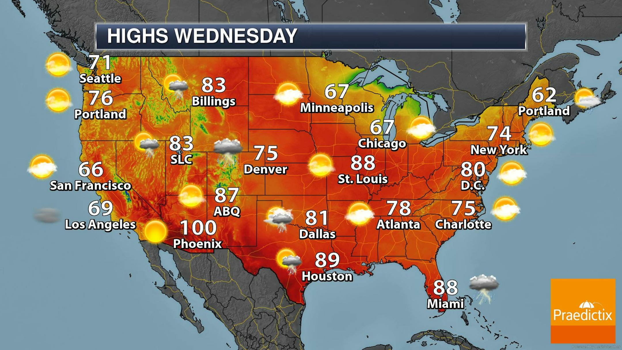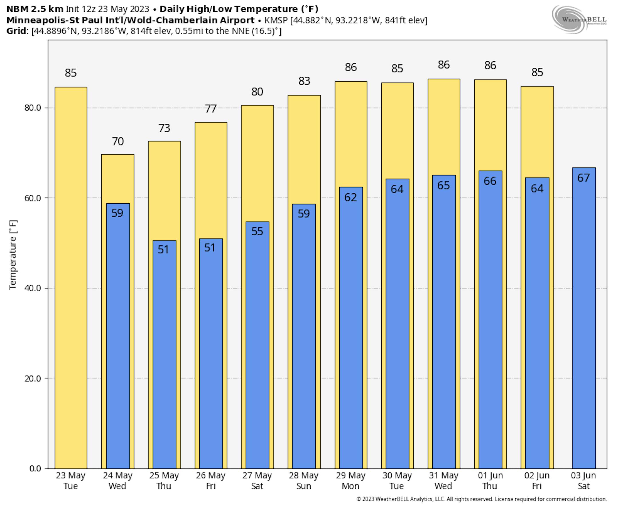 Temps on Wednesday will be nearly +10F to +15F above average across the Dakotas with highs warming mainly into the 80s, which is more like mid-June standards. However, readings north and east of the Twin Cities will be quite a bit below average with a wind off of Lake Superior.