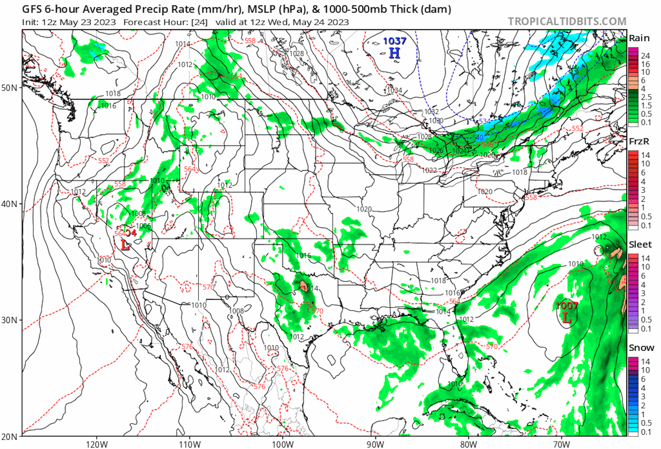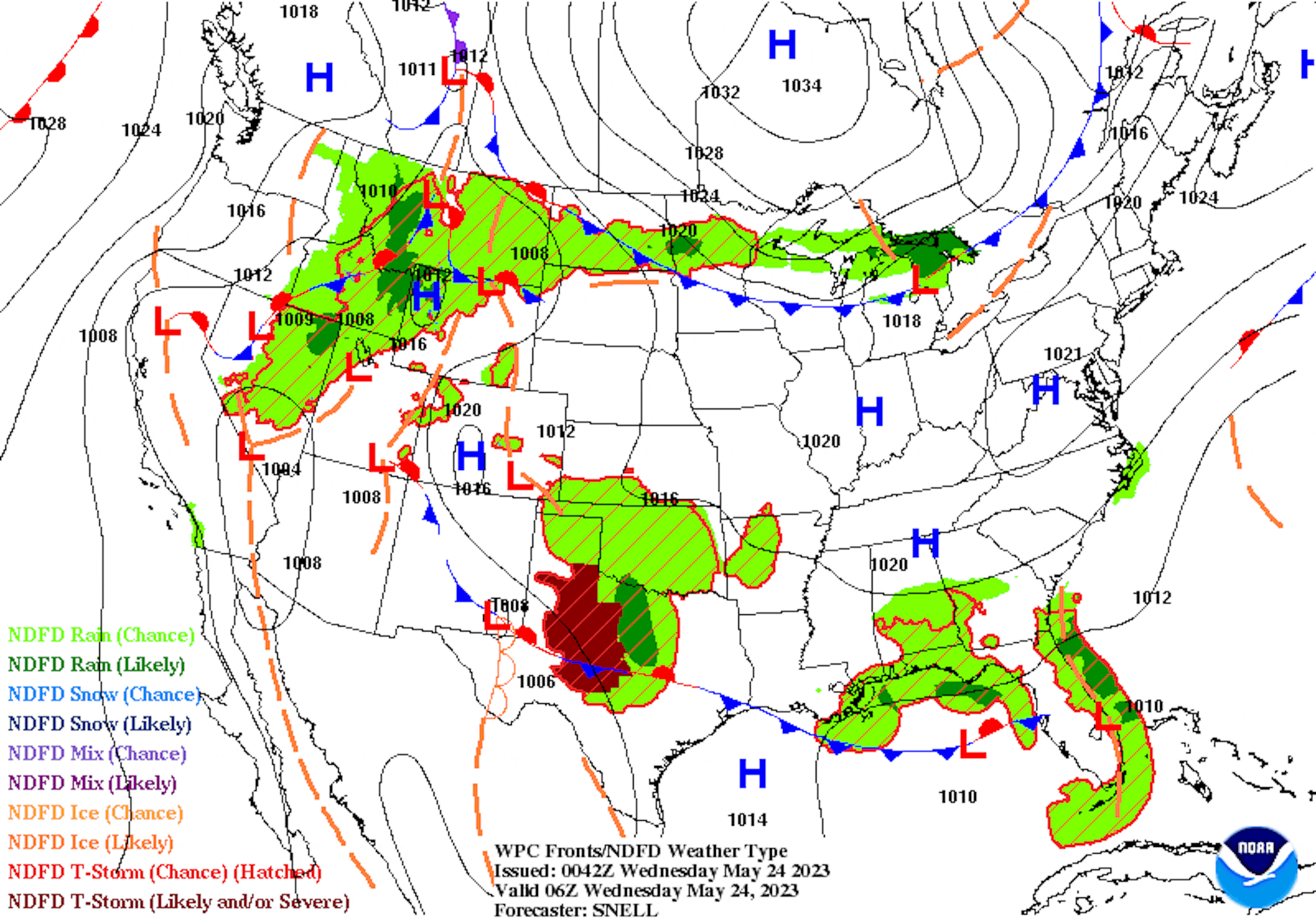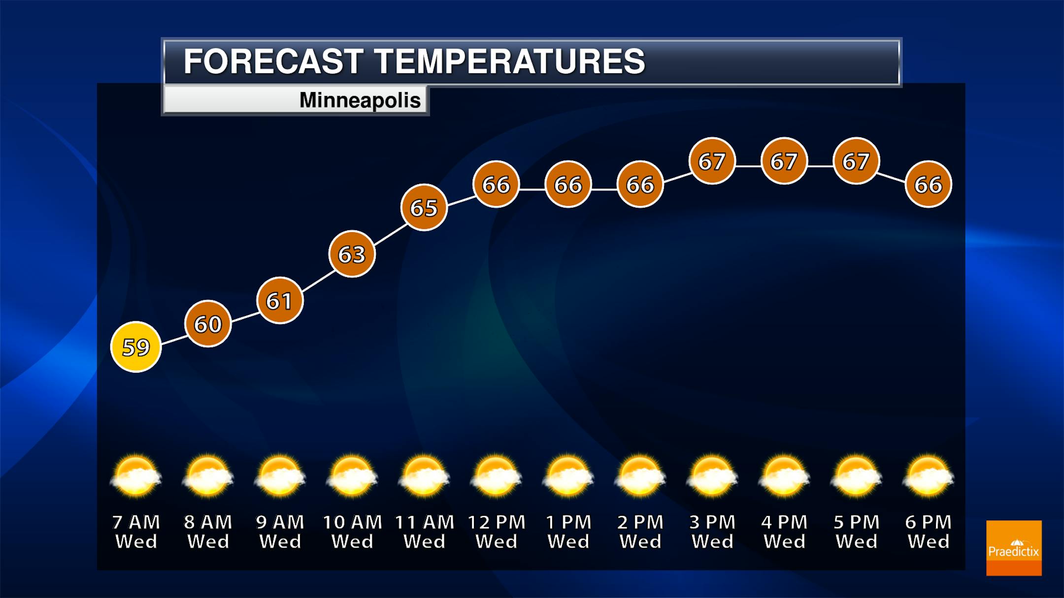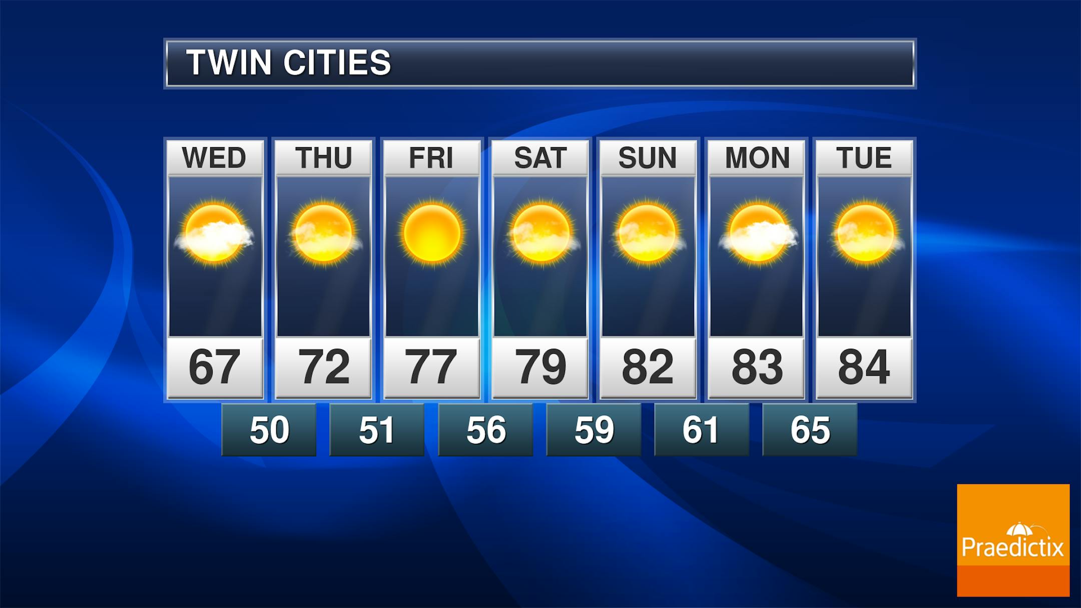 The weather outlook for the Twin Cities on Wednesday, May 24th shows another sunny and mild day with highs warming into the upper 60s. Thanks to Canadian wildfires, skies will be fairly smoky/hazy with some air quality concerns across parts of the state