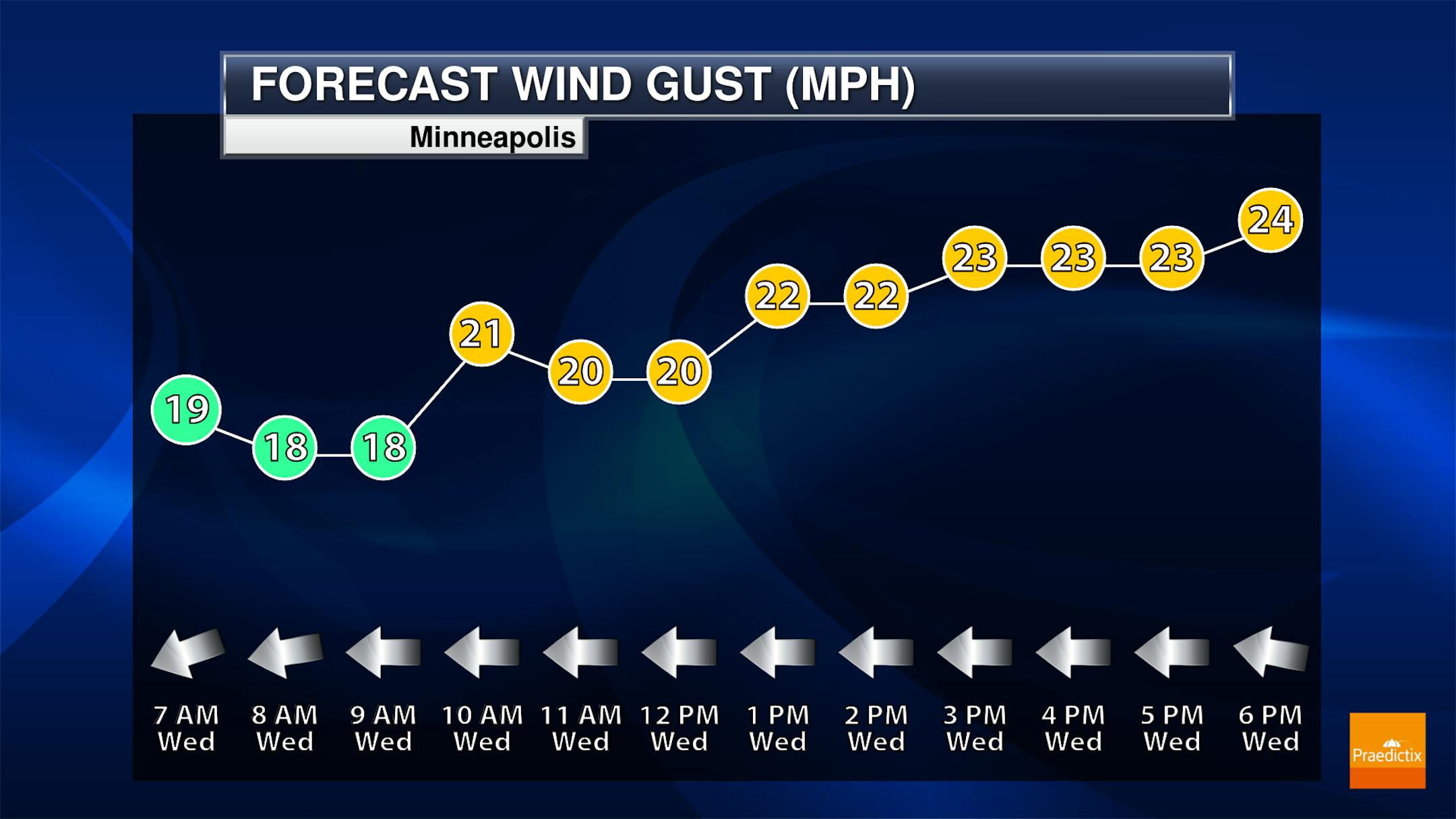 The hourly temps through the day Wednesday show temps starting around 60F in the morning and warming into the mid/upper 60s by the afternoon. Skies will generally be sunny with an easterly wind around 20mph to 25mph at times.