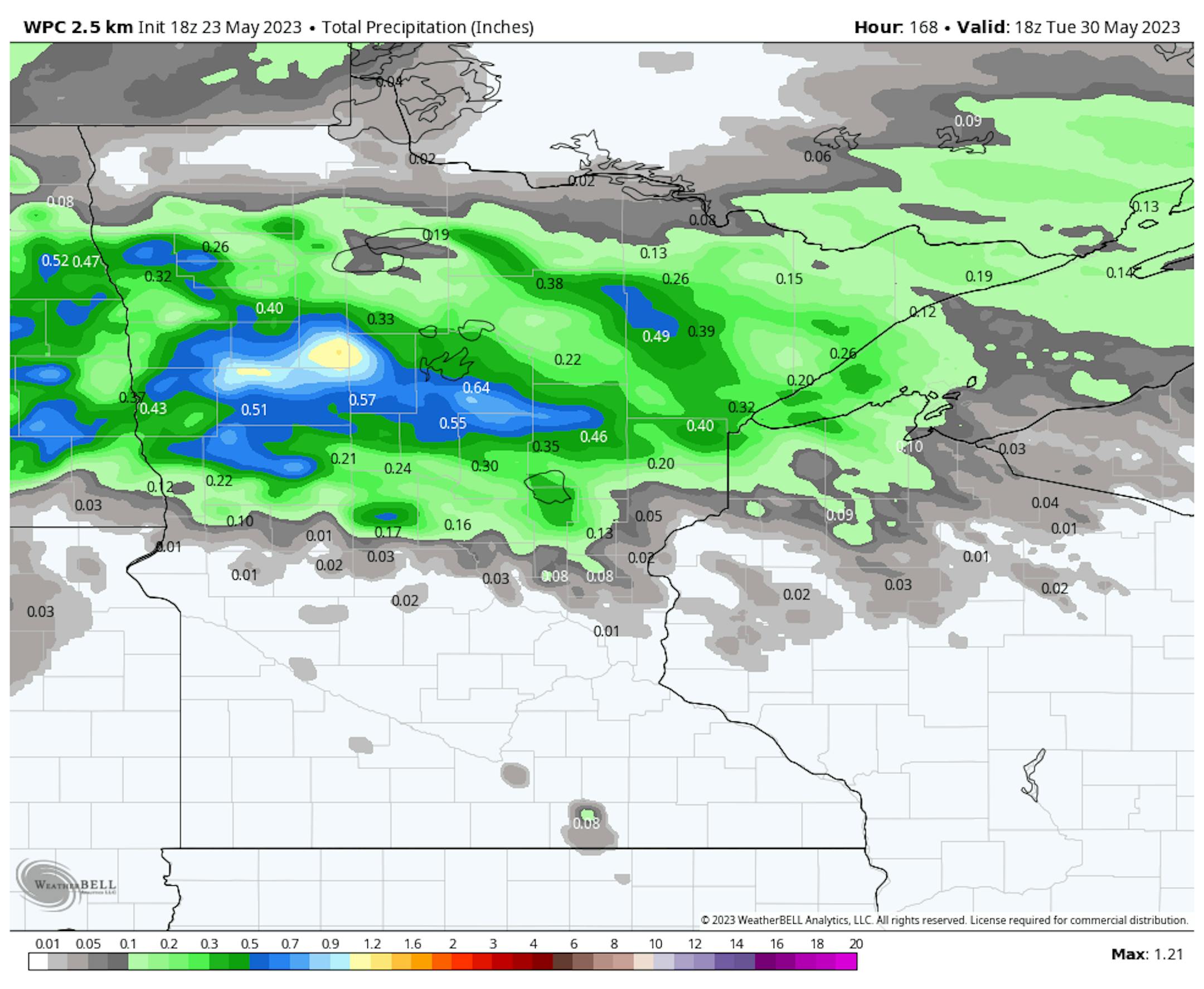 The precipitation outlook through mid-week doesn't appear to be all that impressive with some locations seeing 0.25" to 0.50" tallies across the northern part of the state. Much of southern Minnesota, including the Twin Cities could be completely dry.